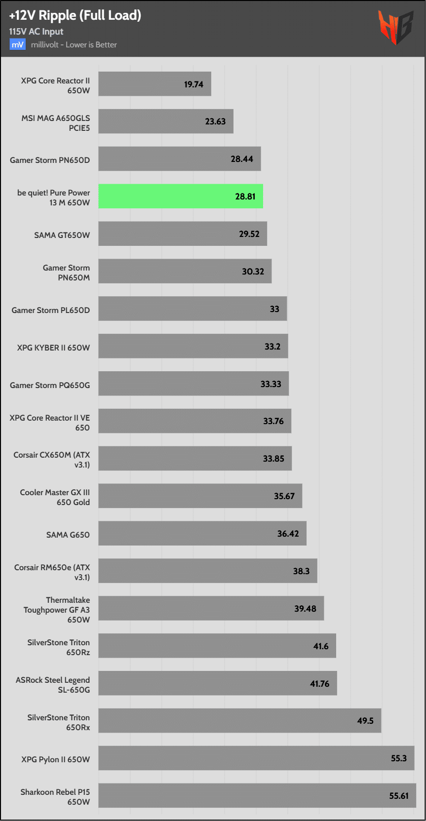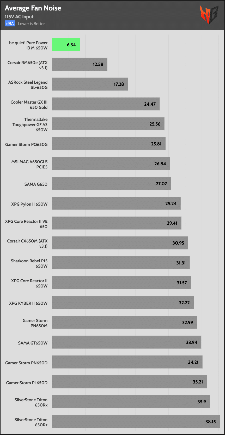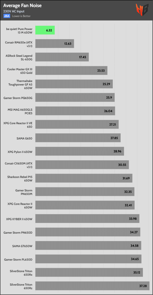 | Lowest Average Noise (115/230V) | be quiet! Pure Power 13 M 650W | Corsair RM650e (ATX v3.1) | ASRock Steel Legend SL-650G |