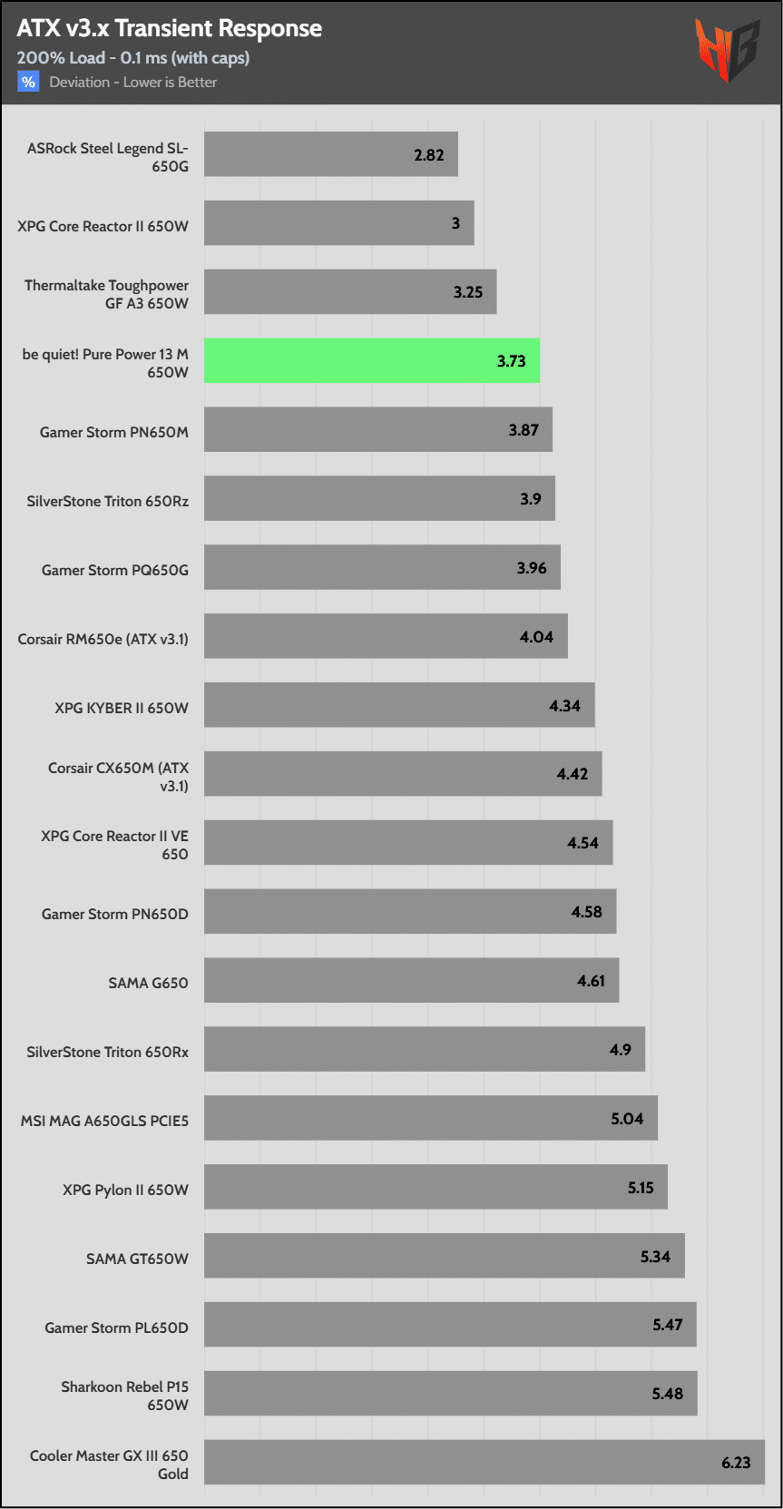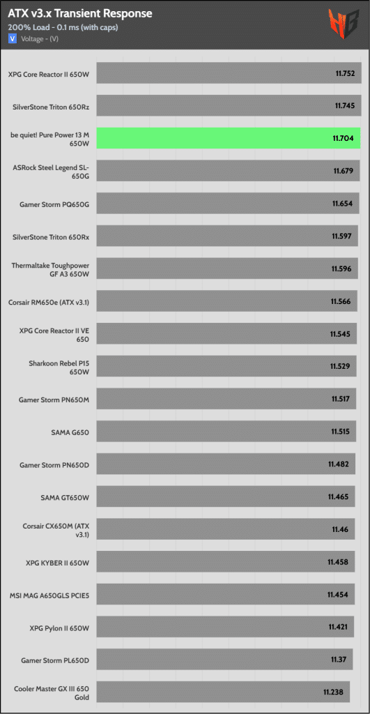 | Best ATX v3.x Transient Response (200% Load) | XPG Core Reactor II 650W | SilverStone Triton 650Rz | be quiet! Pure Power 13 M 650W |