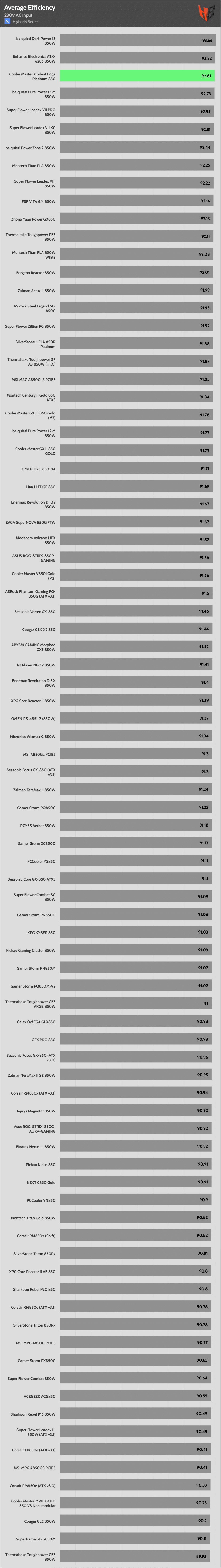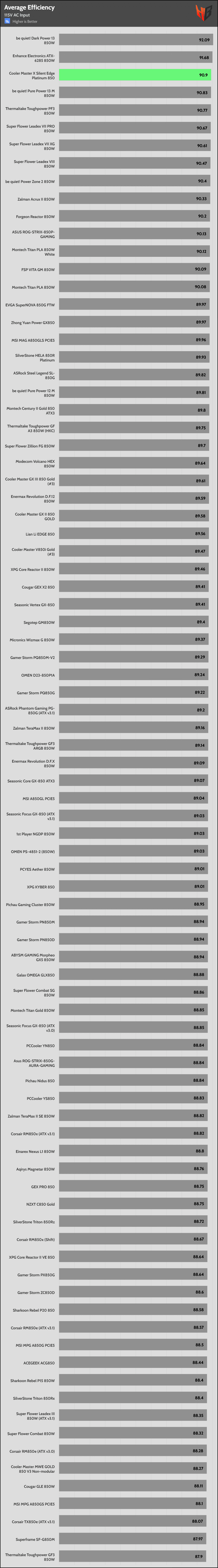 | Highest Average Efficiency (115/230V) | be quiet! Dark Power 13 850W | Cooler Master X Silent Edge Platinum 850 | be quiet! Pure Power 13 M 850W |