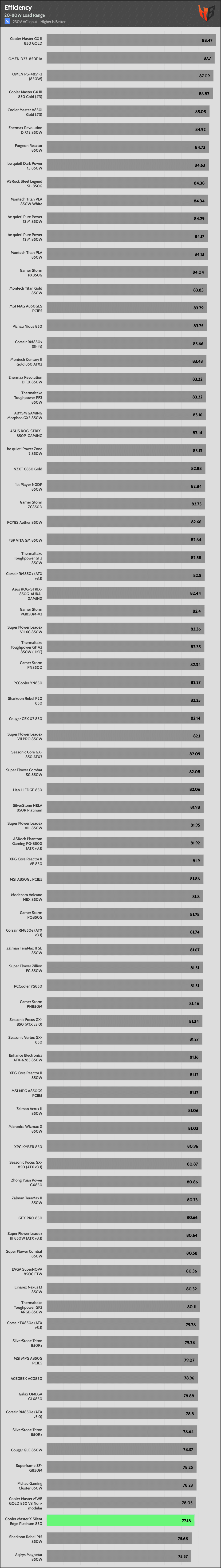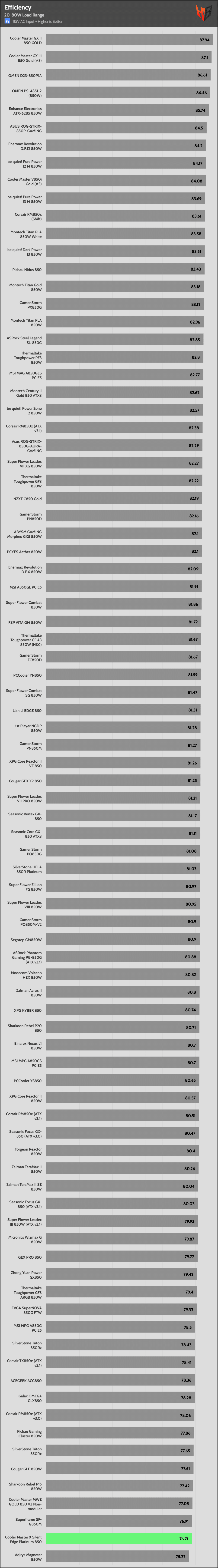 | Highest Average Efficiency (Light Loads – 115/230V) | Cooler Master GX II 850 | Cooler Master GX III 850 Gold | OMEN D23-850P1A |