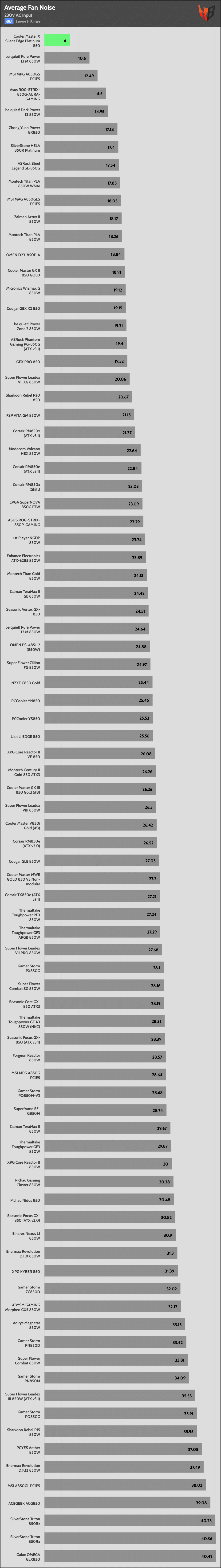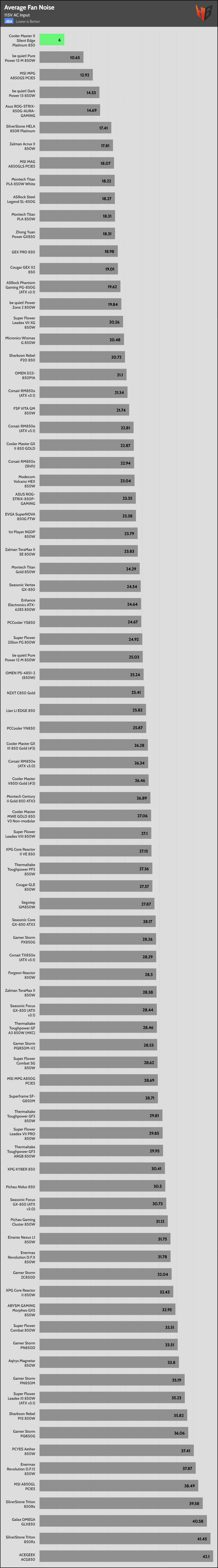| Lowest Average Noise (115/230V) | Cooler Master X Silent Edge Platinum 850 | be quiet! Pure Power 13 M 850W | MSI MPG A850GS PCIE5 |