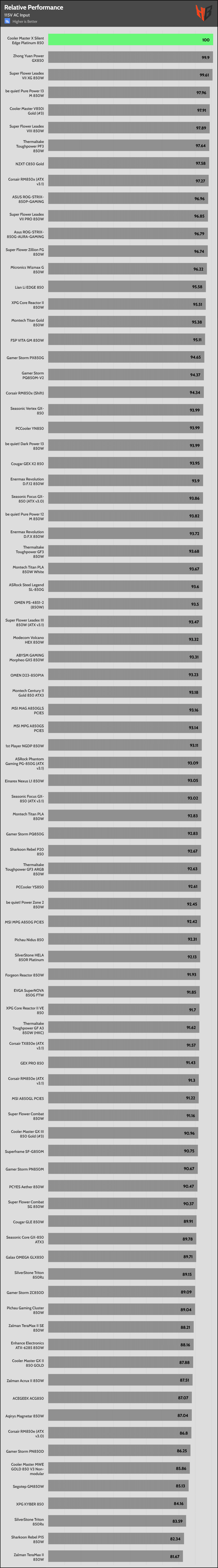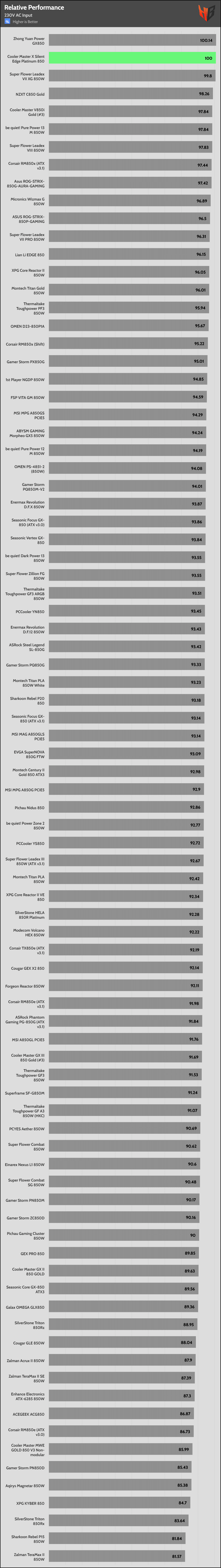 | Best Overall Performance (230V) | Cooler Master X Silent Edge Platinum 850 | Super Flower Leadex VII XG 850W | NZXT C850 |