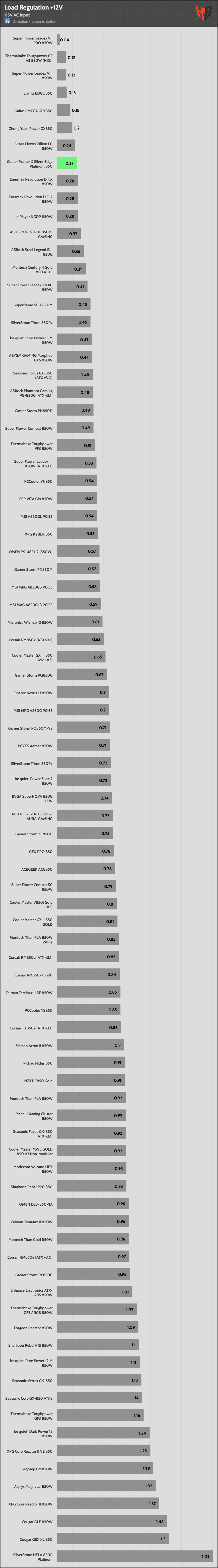 | Best 12V Rail Load Regulation (115V) | Super Flower Leadex VII PRO 850W | Thermaltake Toughpower GF A3 850W (HKC) | Super Flower Leadex VIII 850W |