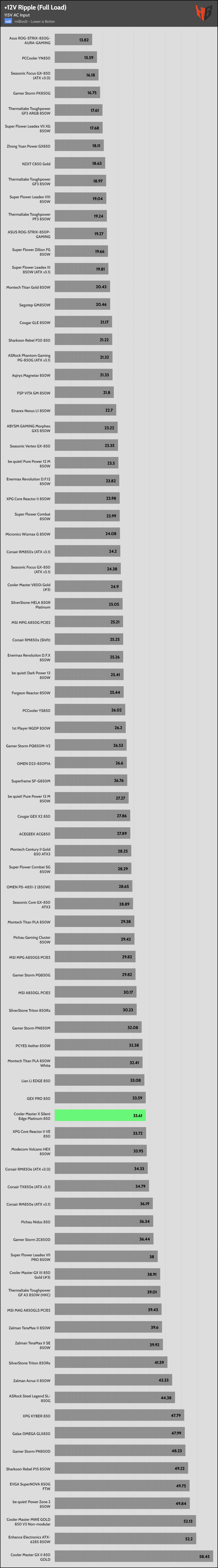| Best 12V Rail Ripple Suppression (115V) | Asus Rog-Strix-850G-Aura-Gaming | PCCooler YN850 | Seasonic Focus GX-850 |