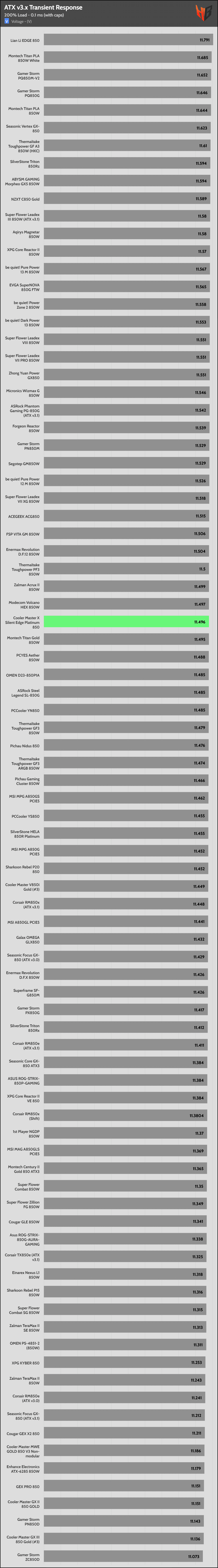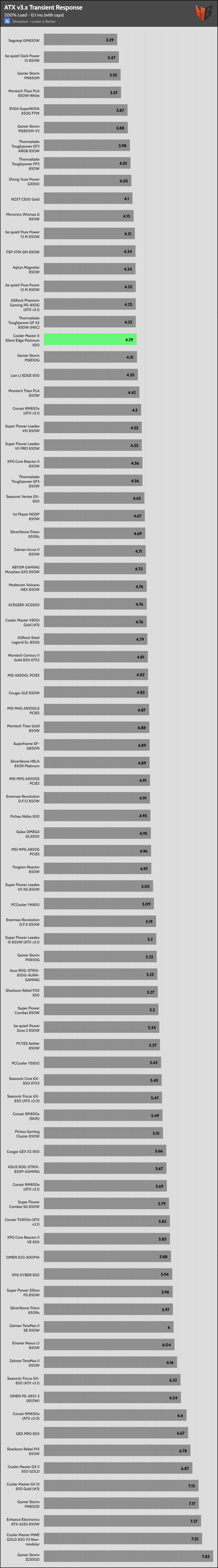 | Best ATX v3.x Transient Response (200% Load) | Lian Li Edge 850 | Montech Titan PLA 850W White | Gamer Storm PQ850G |