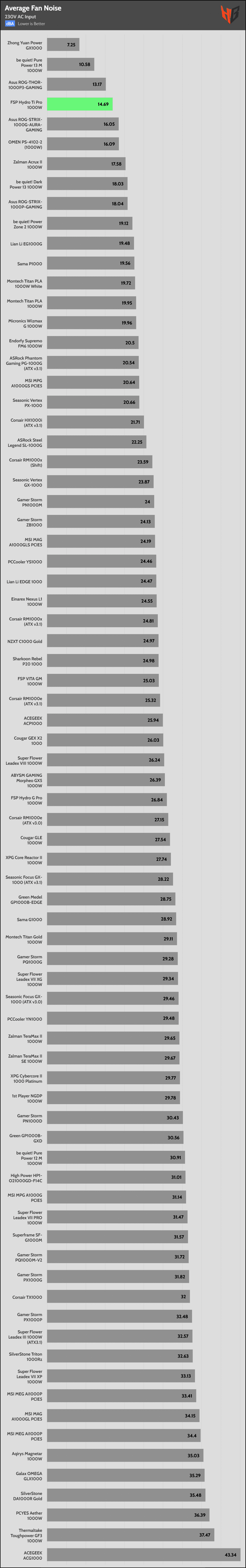 | Lowest Average Noise (230V) | be quiet Pure Power 13 M 1000W | Asus ROG-Thor-1000P3-Gaming | FSP Hydro Ti Pro 1000W |