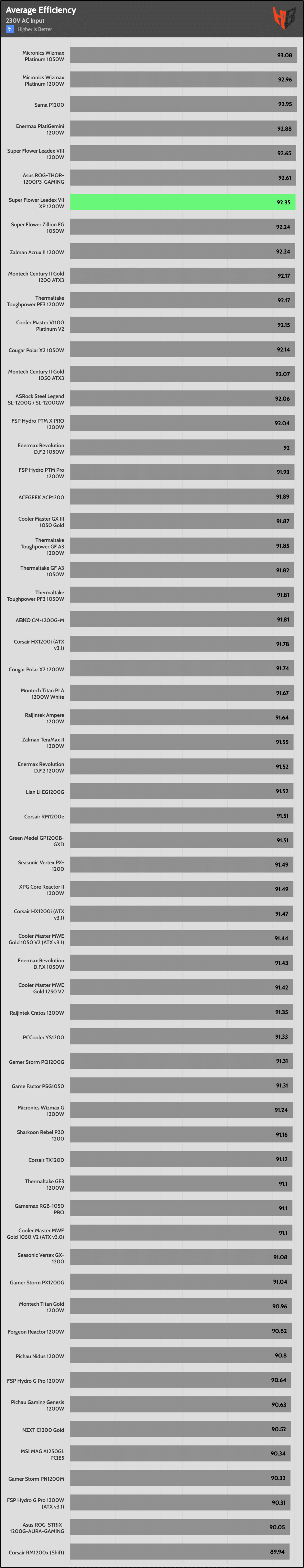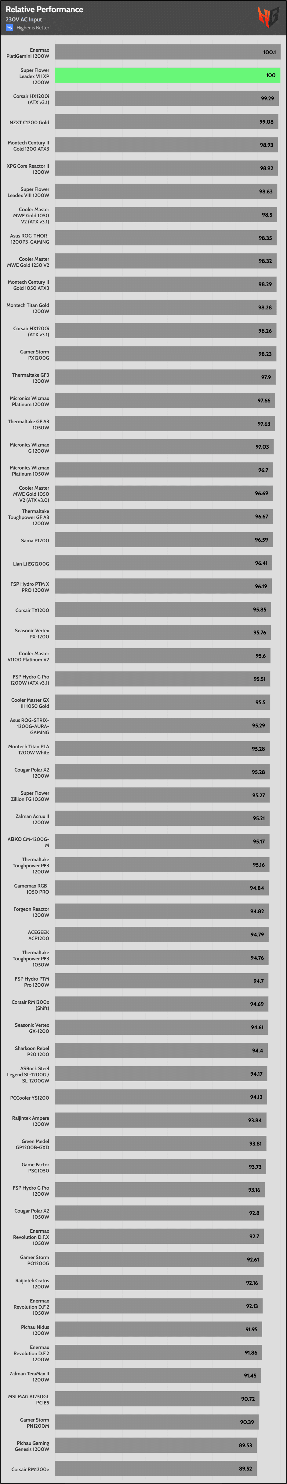 | Best Overall Performance (230V) | Enermax PlatiGemini 1200W | Super Flower Leadex VII XP 1200W | Corsair HX1200i (ATX v3.1) |