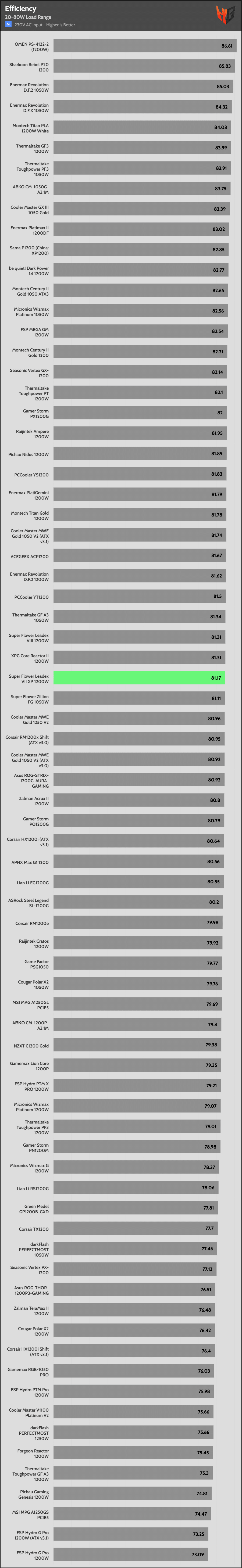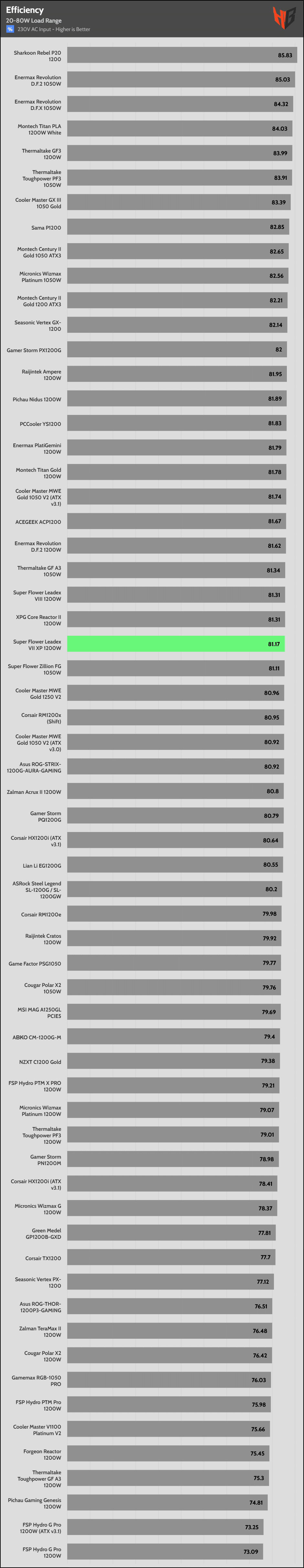 | Highest Average Efficiency (Light Loads – 230V) | Sharkoon Rebel P20 1200 | Enermax Revolution D.F.2 1050W | Enermax Revolution D.F.X 1050W |