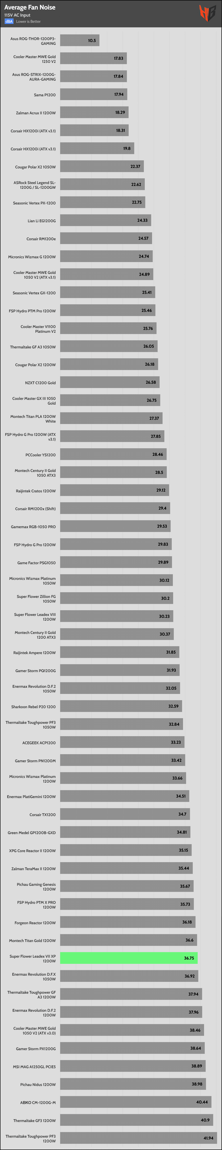 | Lowest Average Noise (115V) | Asus ROG-Thor-1200P3-Gaming | Cooler Master MWE Gold 1250 V2 | Asus Rog-Strix-1200G-Aura-Gaming |