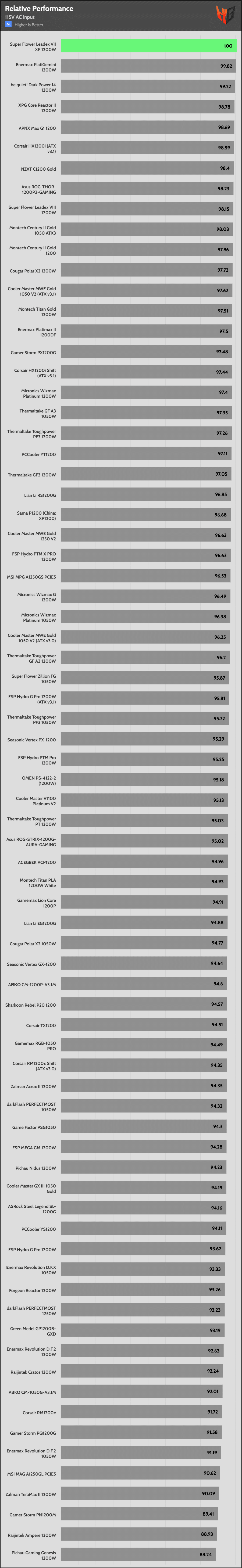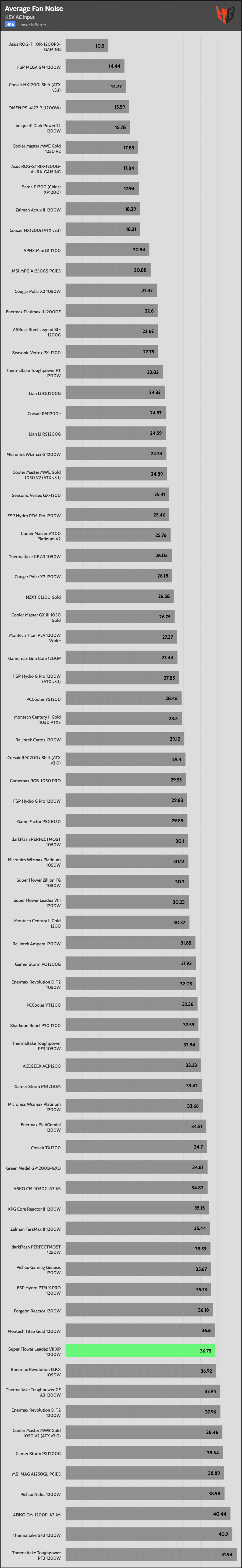 | Lowest Average Noise (115V) | Asus ROG-Thor-1200P3-Gaming | FSP Mega GM 1200W | Corsair HX1200i Shift (ATX v3.1) |