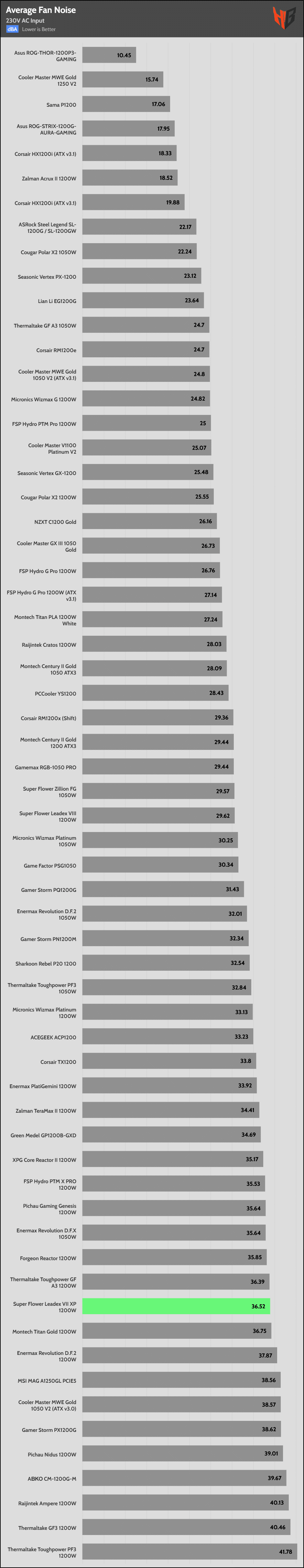 | Lowest Average Noise (230V) | Asus ROG-Thor-1200P3-Gaming | Cooler Master MWE Gold 1250 V2 | SAMA P1200 |