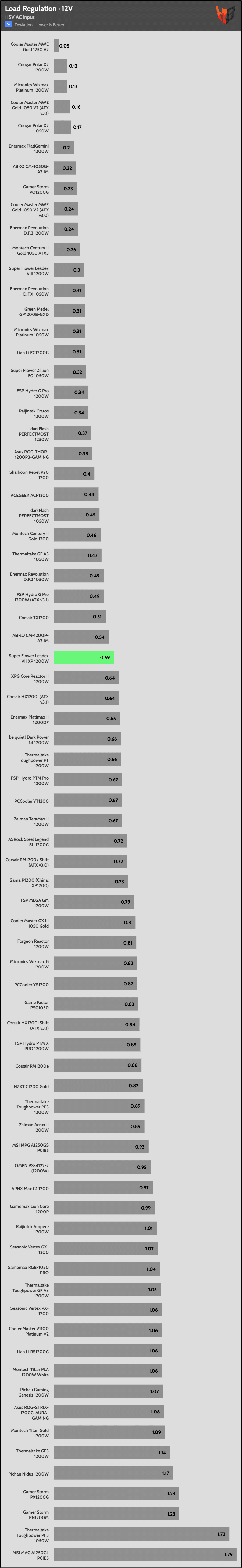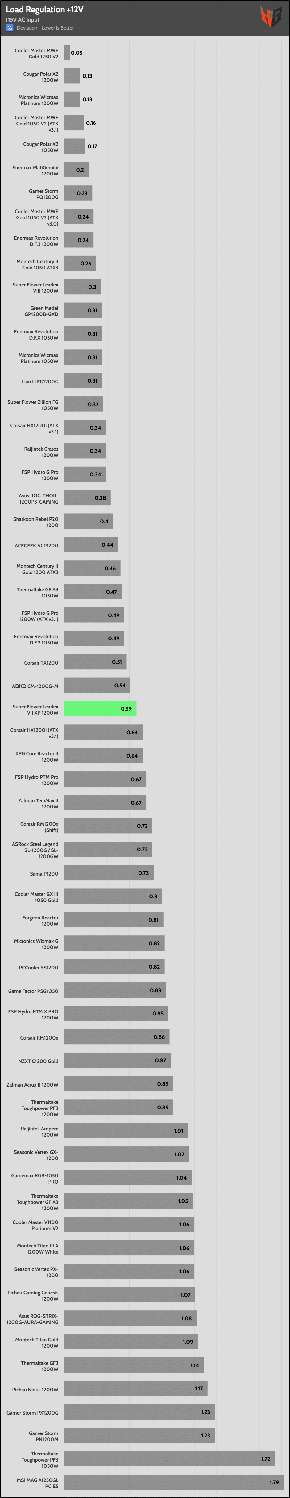 | Best 12V Rail Load Regulation (115V) | Cooler Master MWE Gold 1250 V2 | Cougar Polar X2 1200W/Micronics Wizmax Platinum 1200W | Cooler Master MWE Gold 1050 V2 (ATX v3.1) |