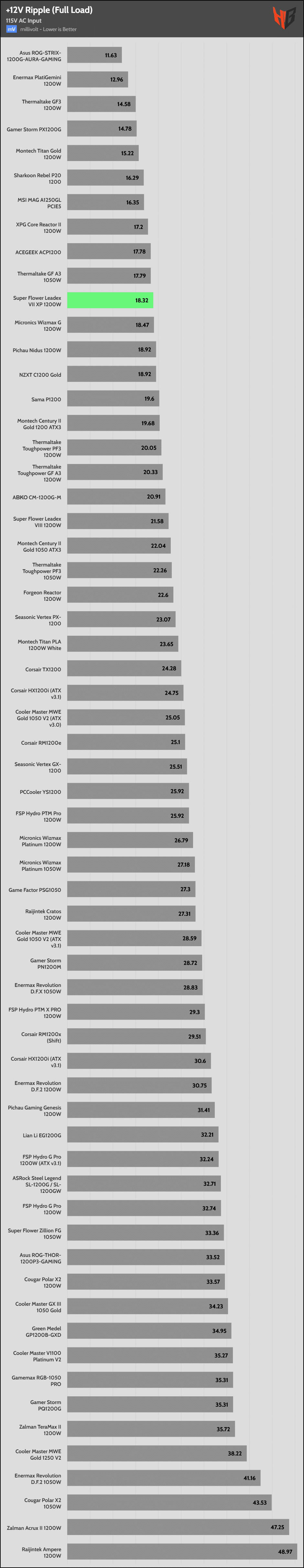 | Best 12V Rail Ripple Suppression (115V) | Asus Rog-Strix-1200G-Aura-Gaming | Enermax PlatiGemini 1200W | Thermaltake Toughpower GF3 1050W |