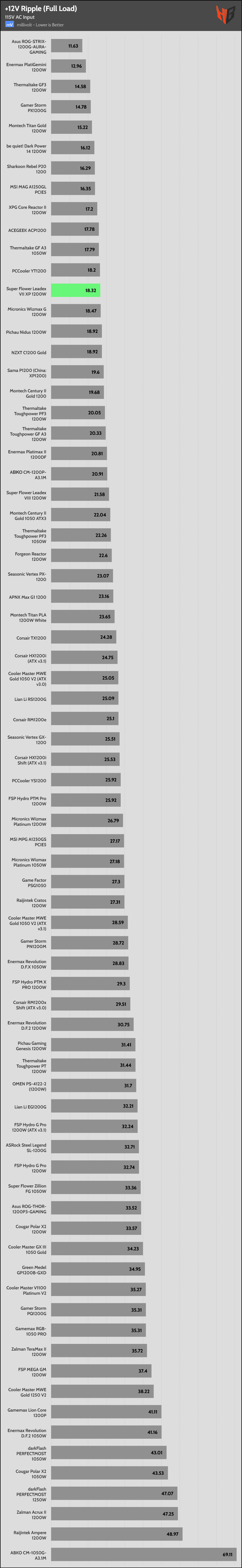 | Best 12V Rail Ripple Suppression (115V) | Asus Rog-Strix-1200G-Aura-Gaming | Enermax PlatiGemini 1200W | Thermaltake Toughpower GF3 1200W |