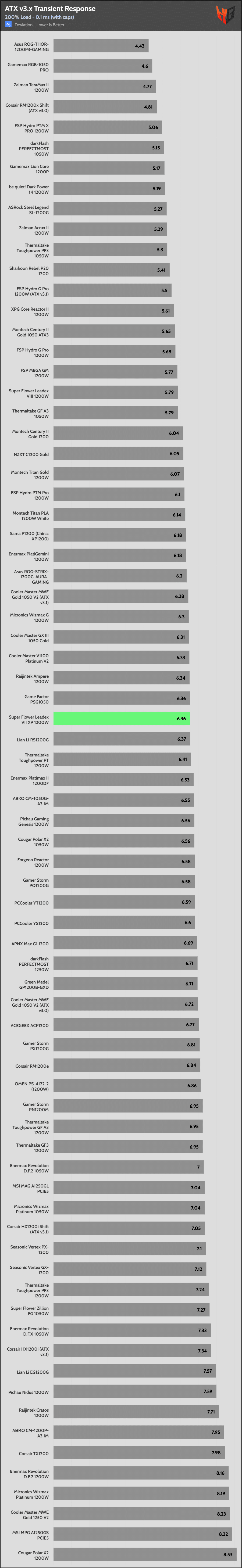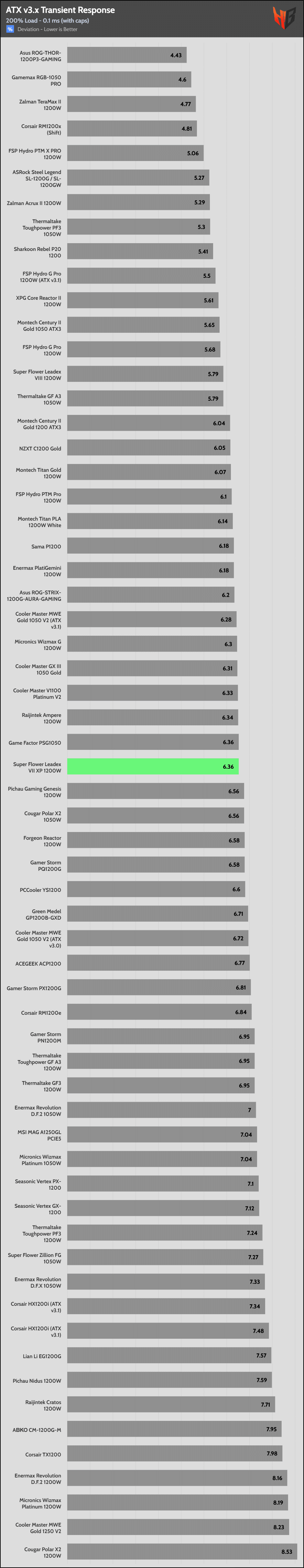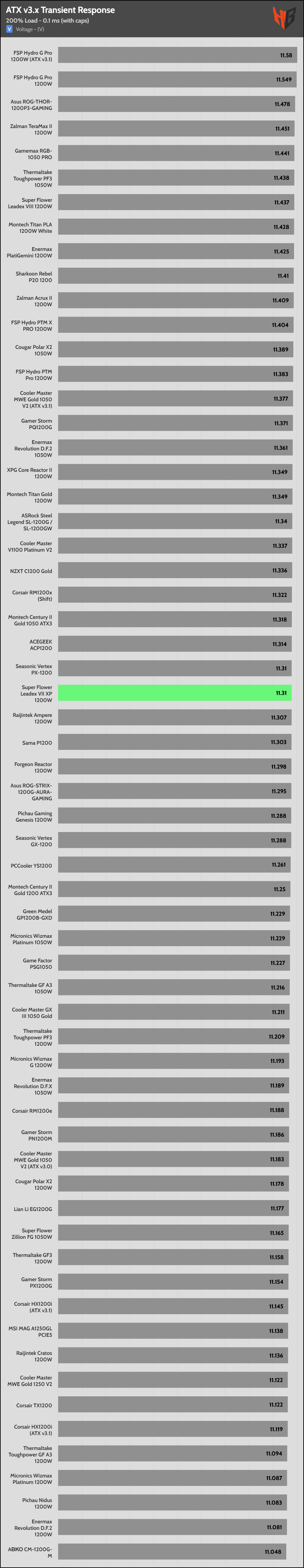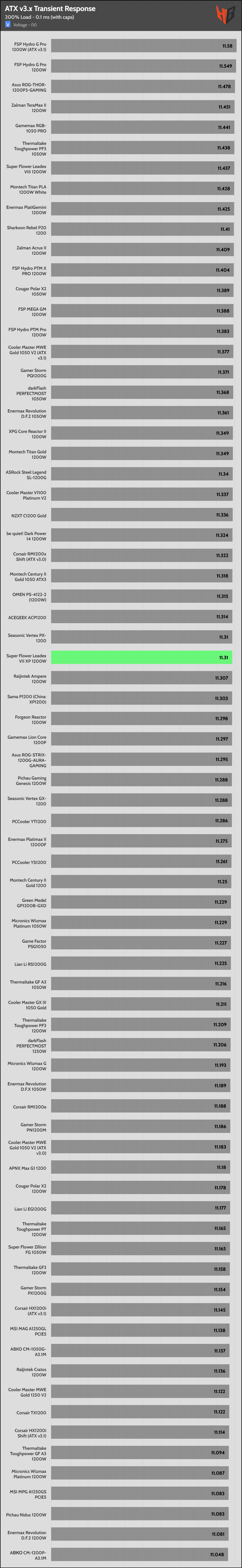 | Best ATX v3.x Transient Response (200% Load) | FSP Hydro G Pro 1200W (ATX v3.1) | Asus ROG-Thor-1200P3-Gaming | Zalman TeraMax II 1200W |