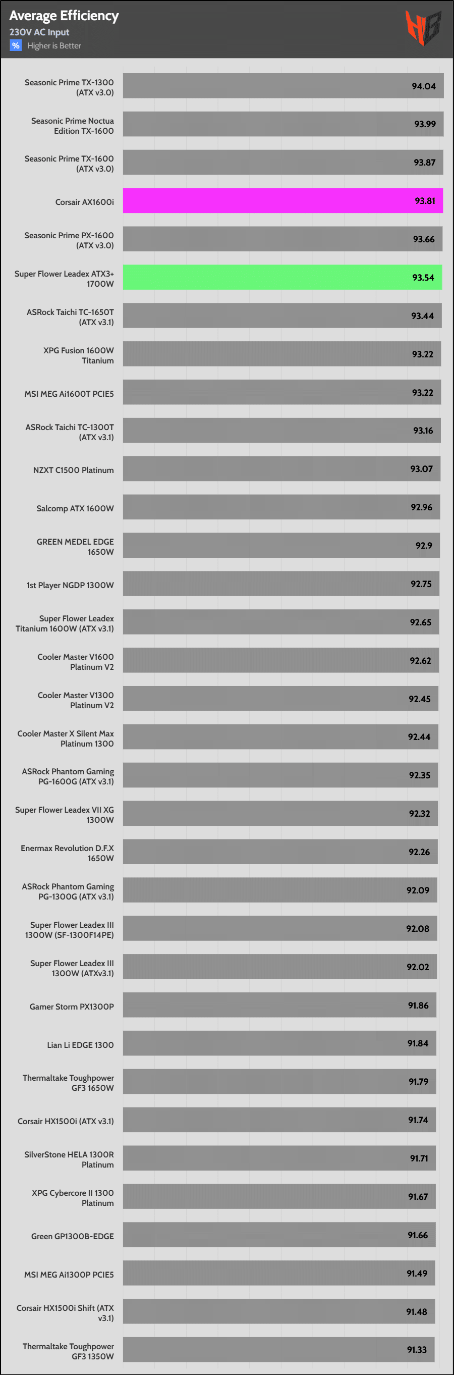 The Corsair AX1600i has the best overall performance, but it is not ATX v3.x compliant, so it is not included in the table above. Moreover, since the Salcomp ATX 1600W unit is unavailable for purchase, I included it in the charts for reference only.