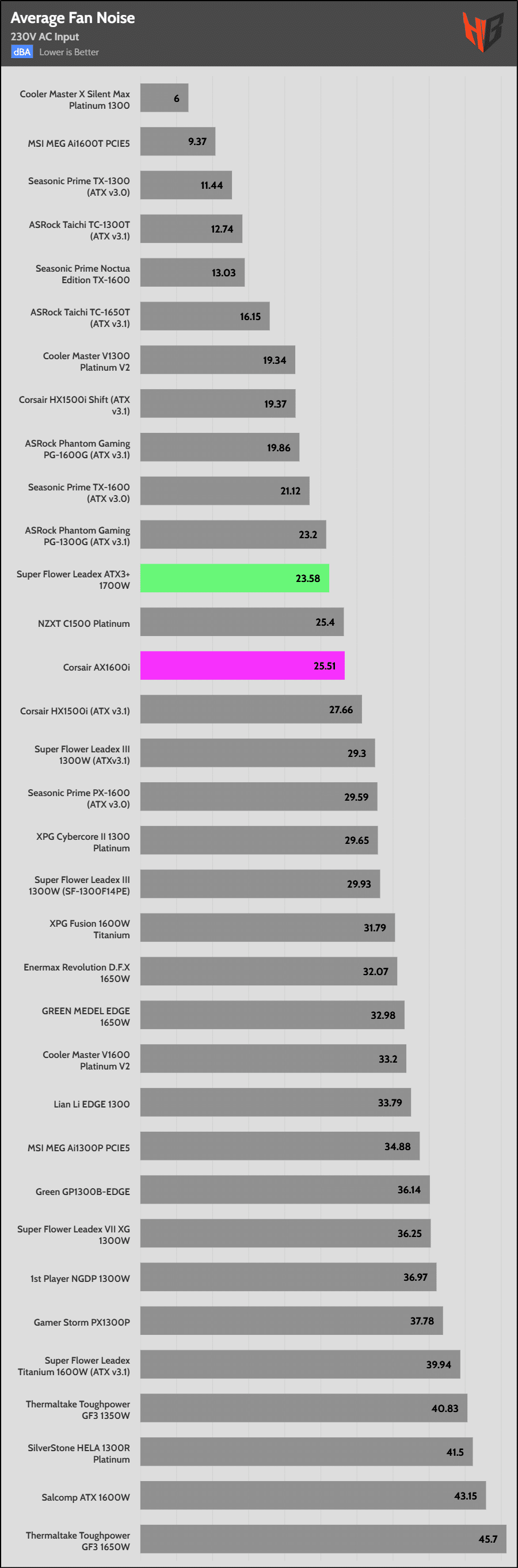 | Lowest Average Noise (115/230V) | Cooler Master X Silent Max Platinum 1300 | MSI MEG Ai1600T PCIE5 | Seasonic Prime TX-1300 |