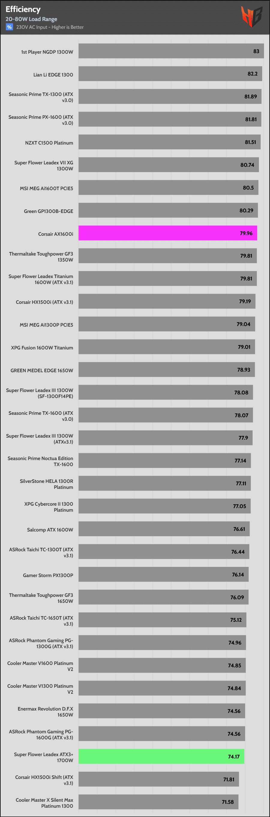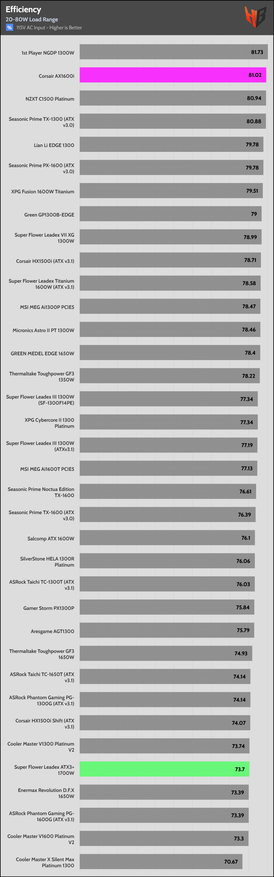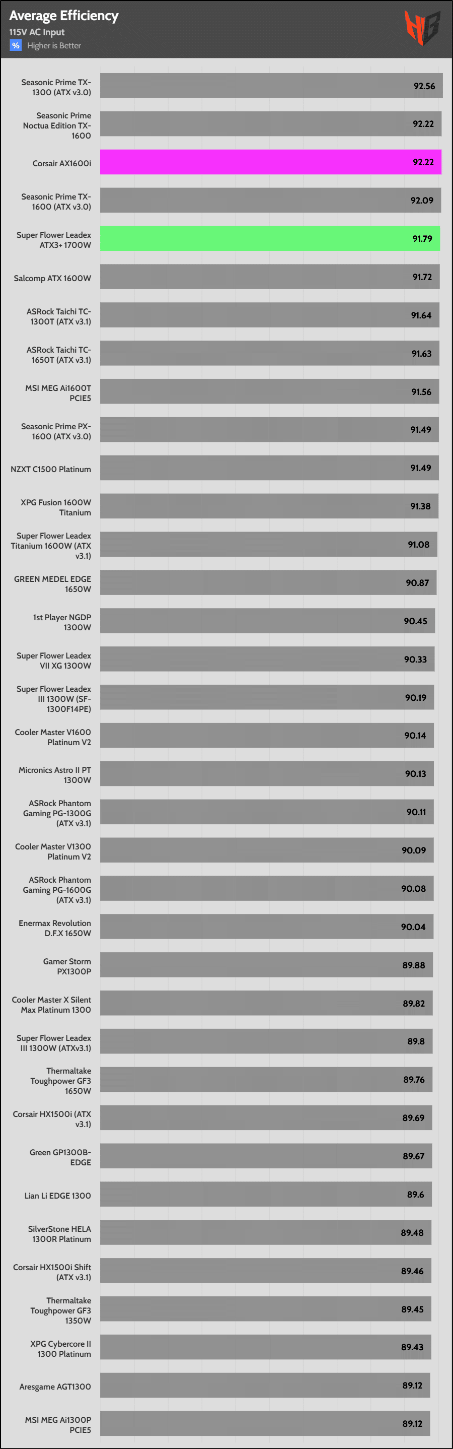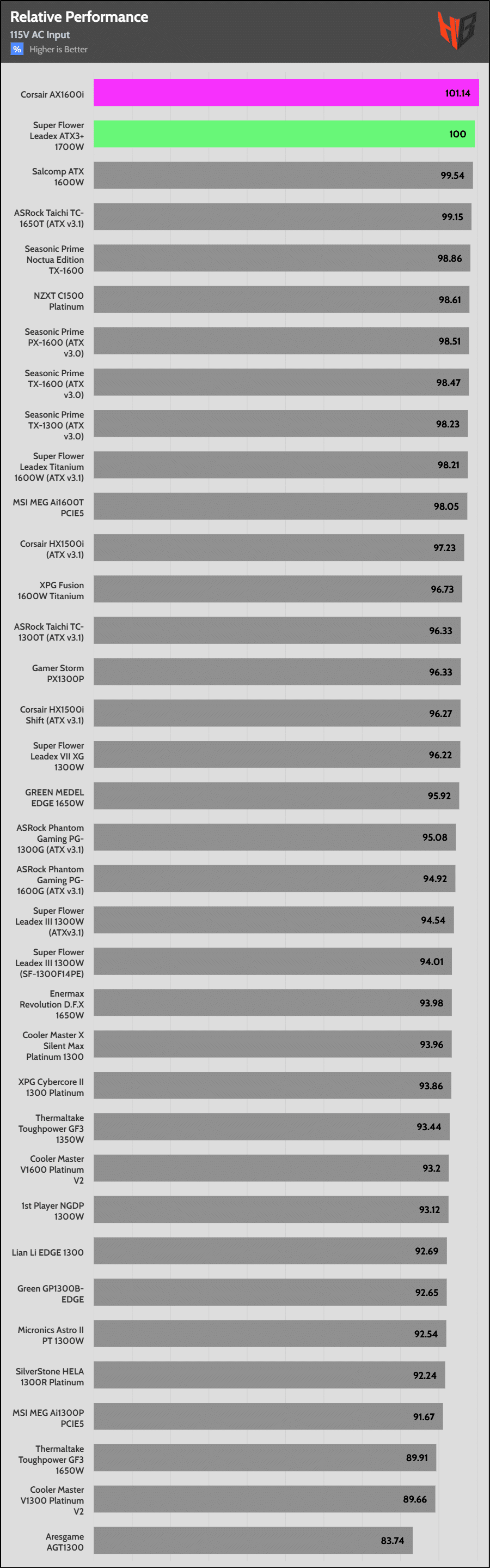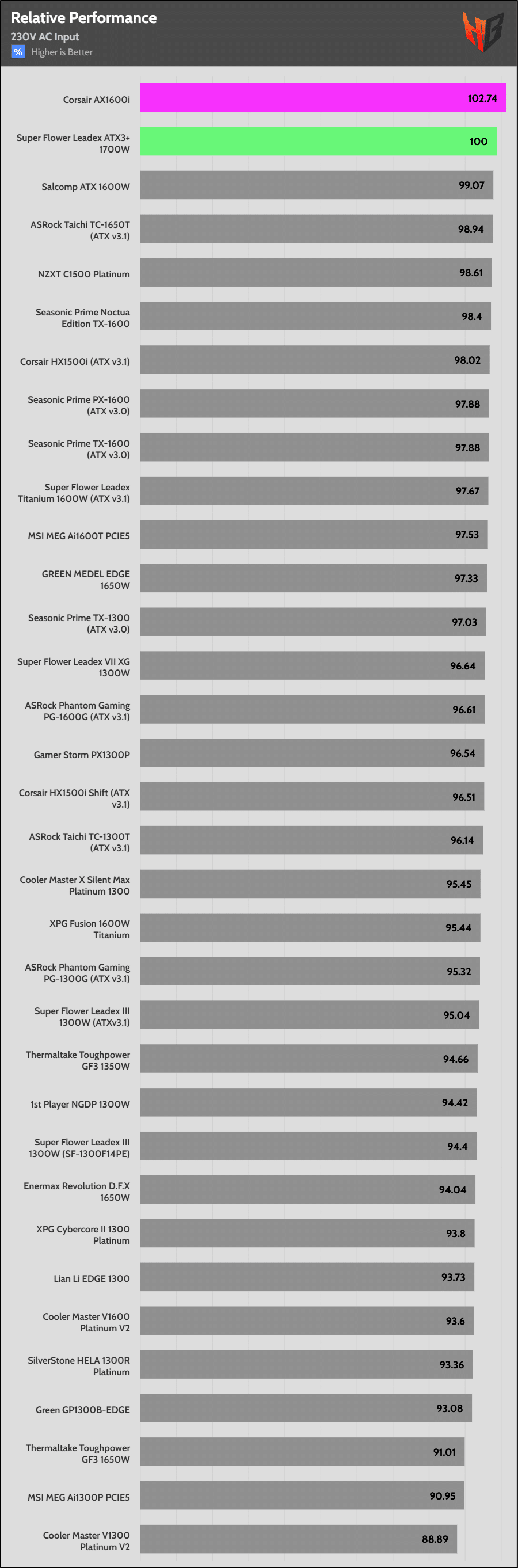 The Corsair AX1600i has the best overall performance, but it is not ATX v3.x compliant, so it is not included in the table above. Moreover, since the Salcomp ATX 1600W unit is unavailable for purchase, I included it in the charts for reference only.