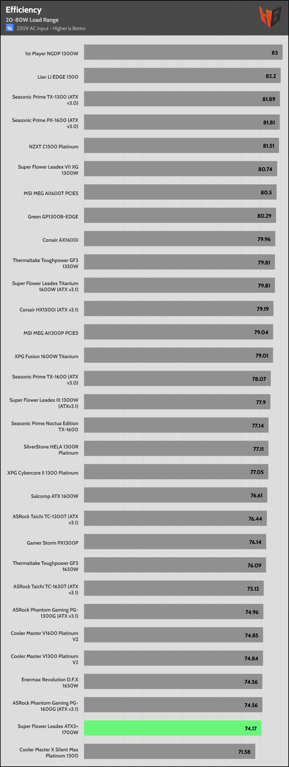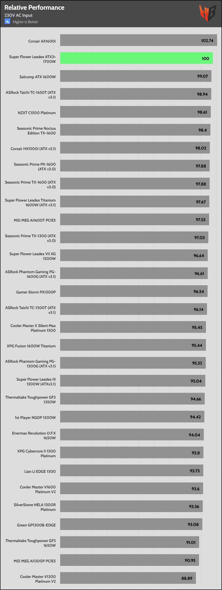 The Corsair AX1600i has the best overall performance, but it is not ATX v3.x compliant. Since the Salcomp ATX 1600W unit is not available for purchase, I only included it in the charts for reference.