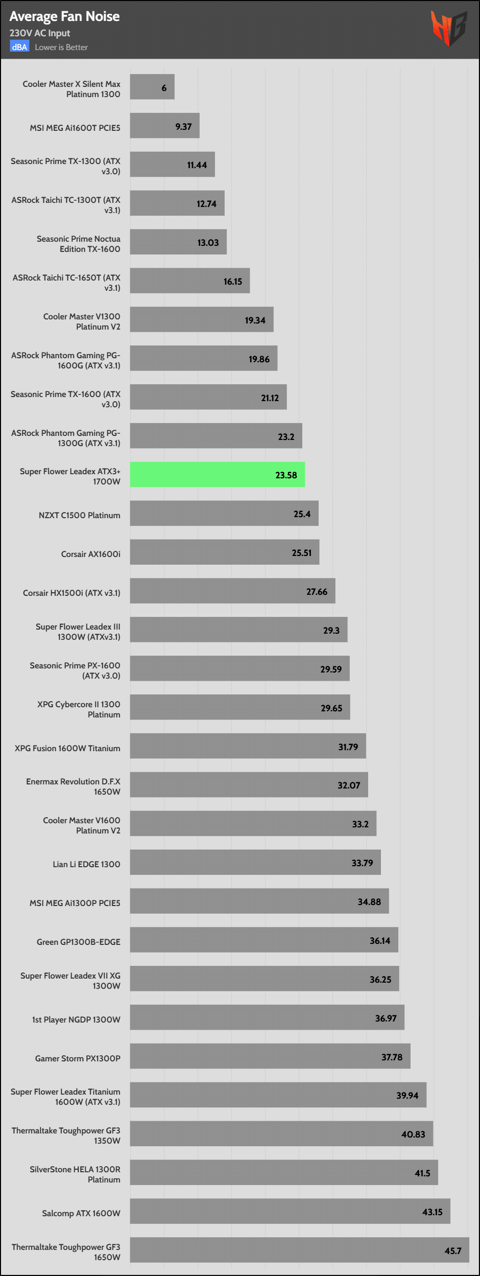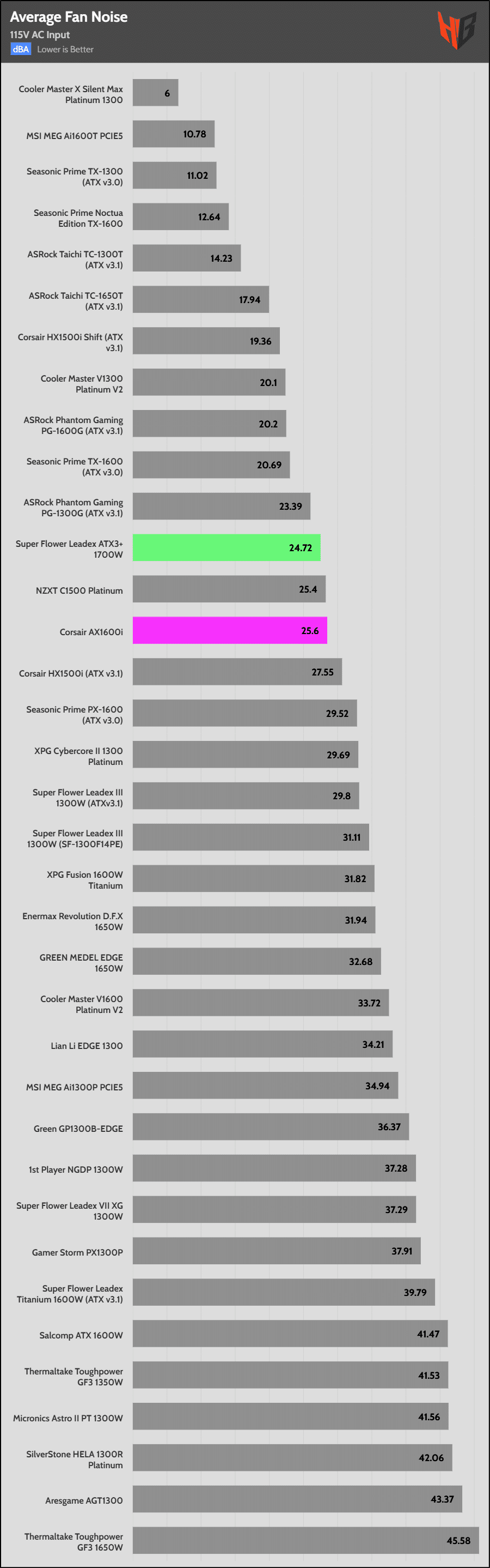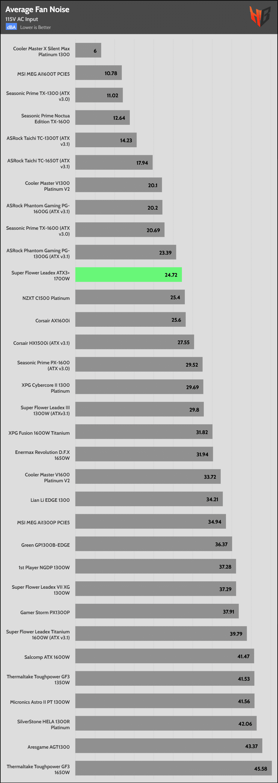 | Lowest Average Noise (115/230V) | Cooler Master X Silent Max Platinum 1300 | MSI MEG Ai1600T PCIE5 | Seasonic Prime TX-1300 |