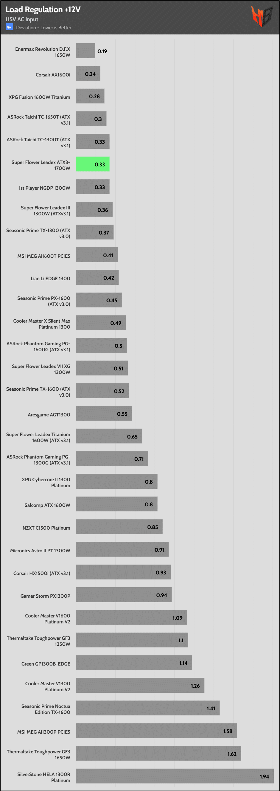 | Best 12V Rail Load Regulation (115V) | Enermax Revolution D.F.X 1650W | Corsair AX1600i | XPG Fusion 1600W Titanium |
