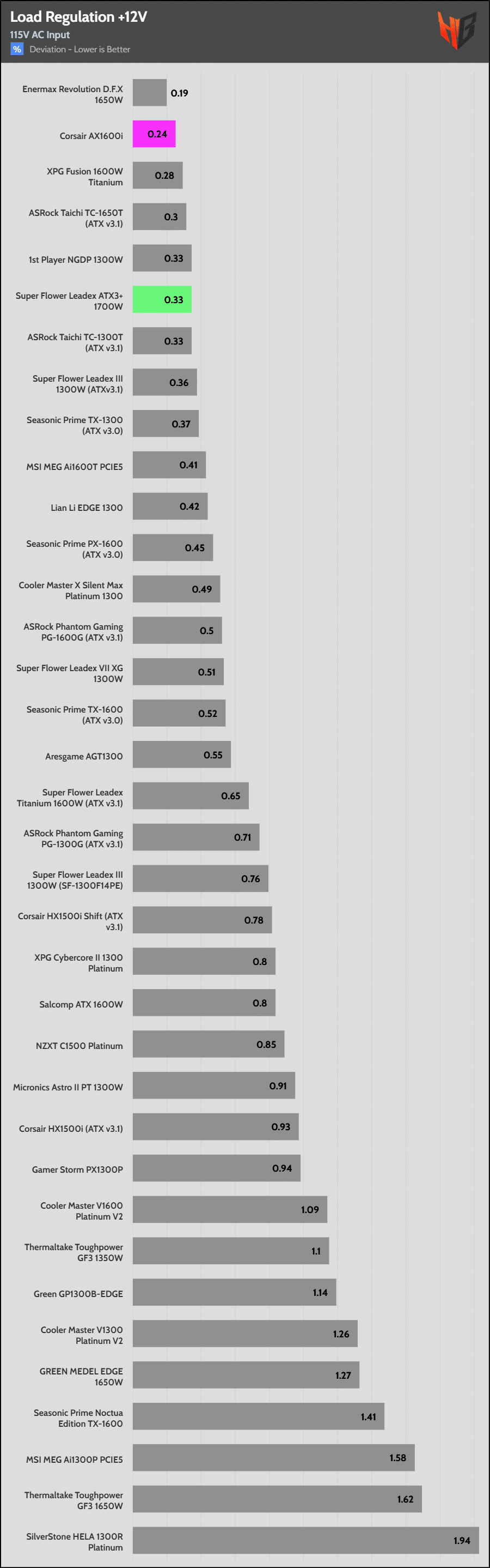 | Best 12V Rail Load Regulation (115V) | Enermax Revolution D.F.X 1650W | XPG Fusion 1600W Titanium | ASRock Taichi TC-1650T |
