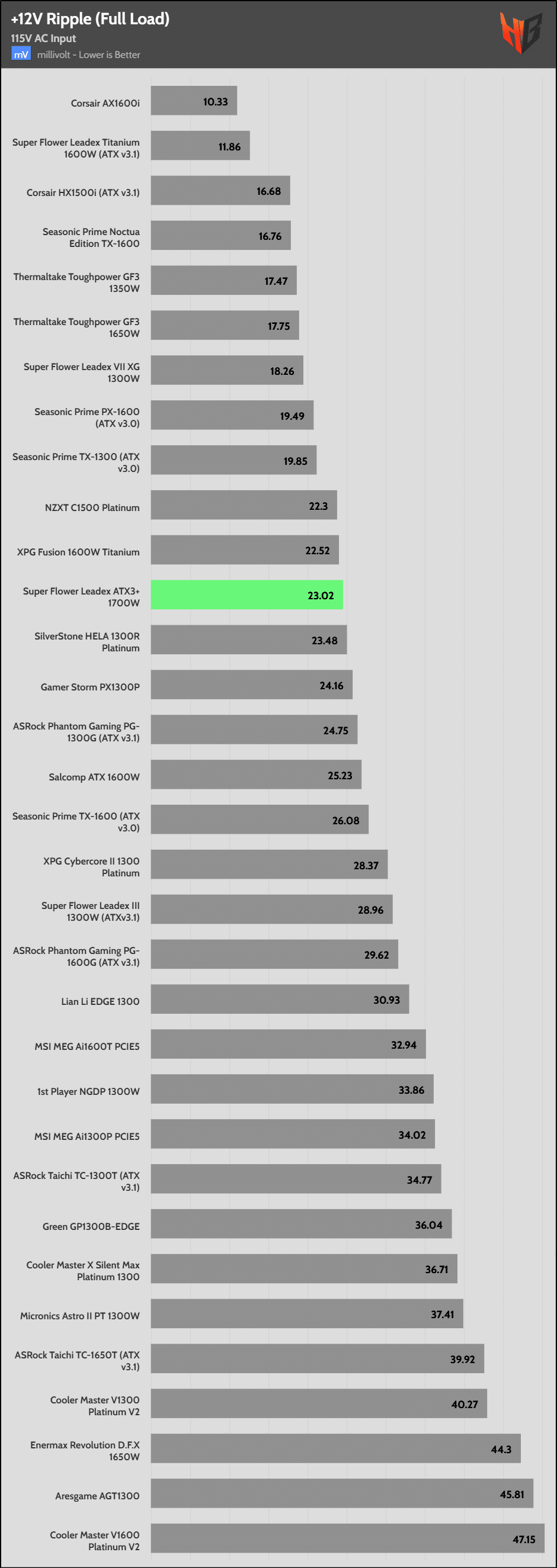 | Best 12V Rail Ripple Suppression (115V) | Corsair AX1600i | Super Flower Leadex Titanium 1600W | Corsair HX1500i |
