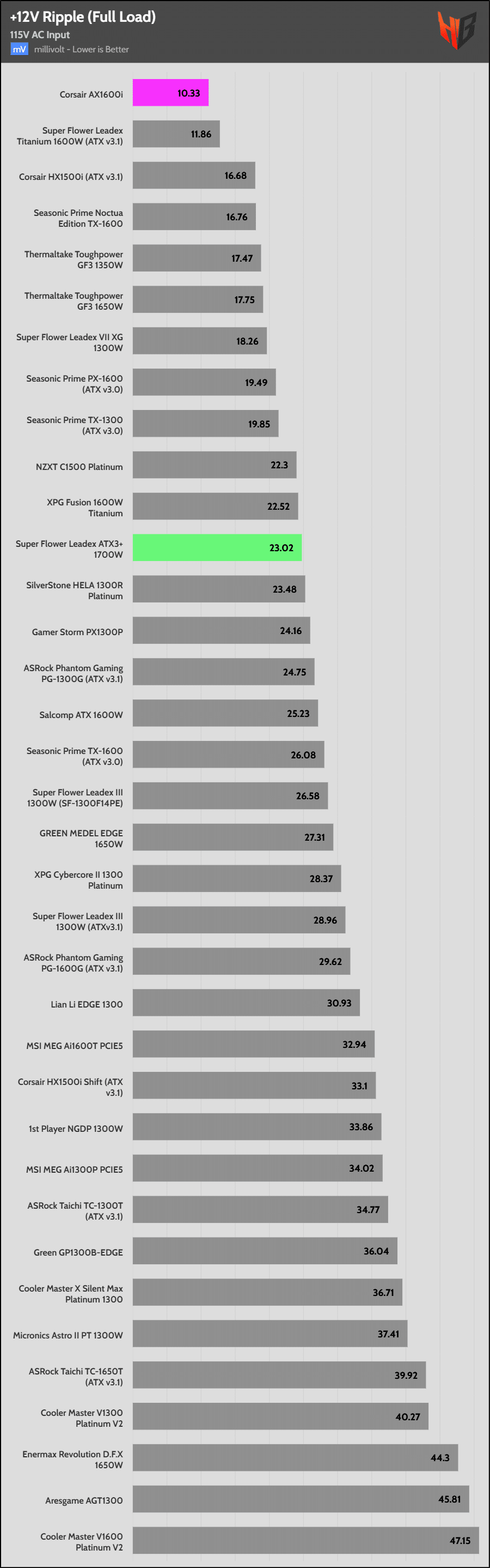 | Best 12V Rail Ripple Suppression (115V) | Super Flower Leadex Titanium 1600W | Corsair HX1500i | Seasonic Prime Noctua Edition TX-1600 |