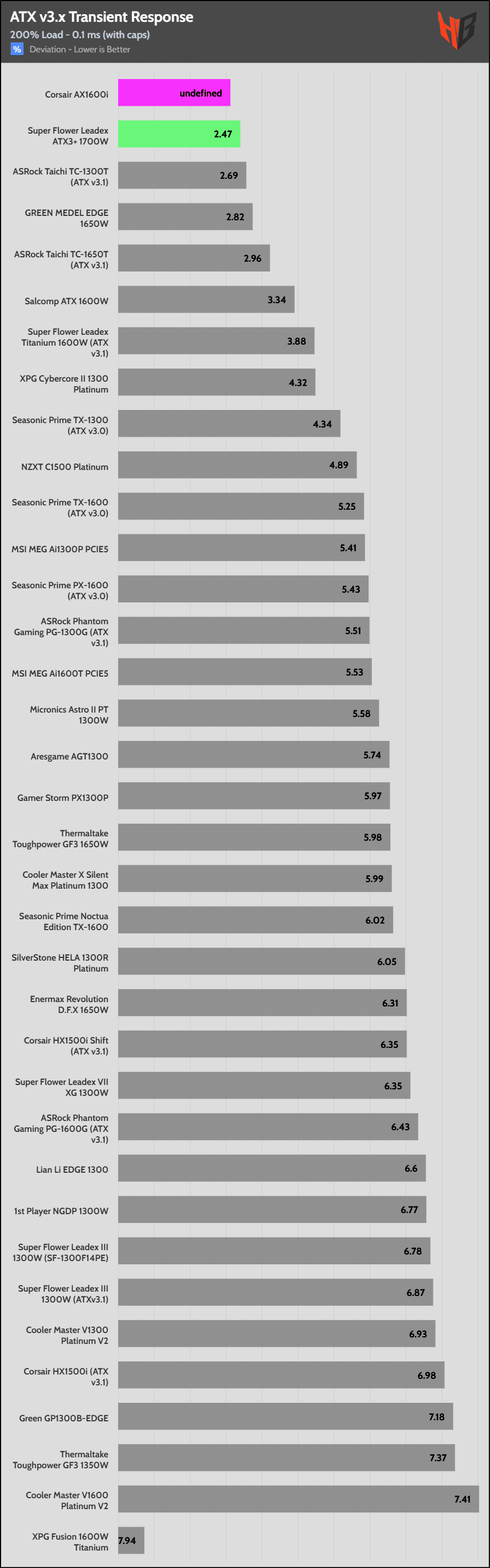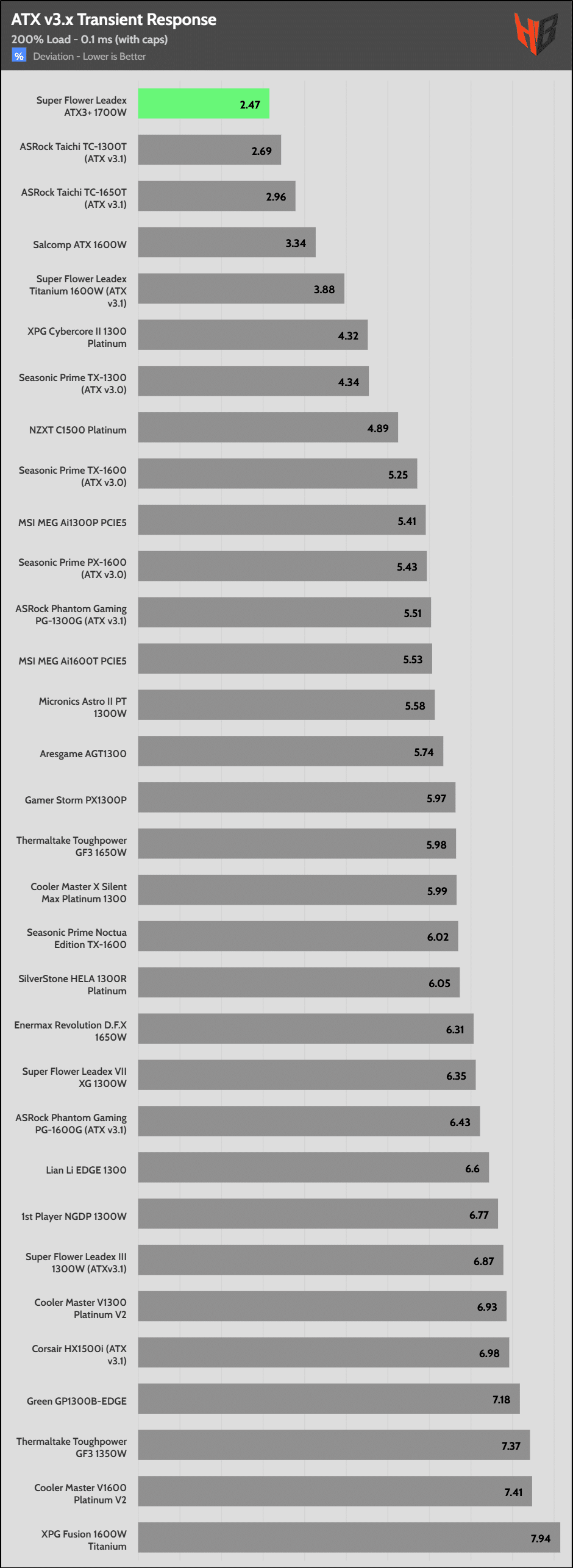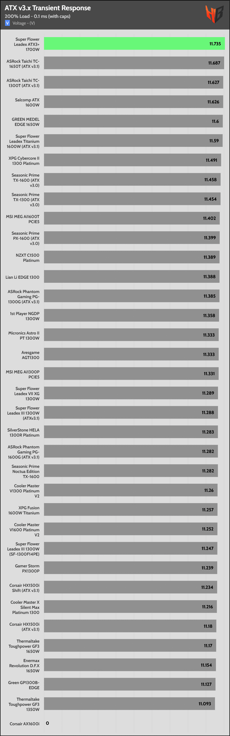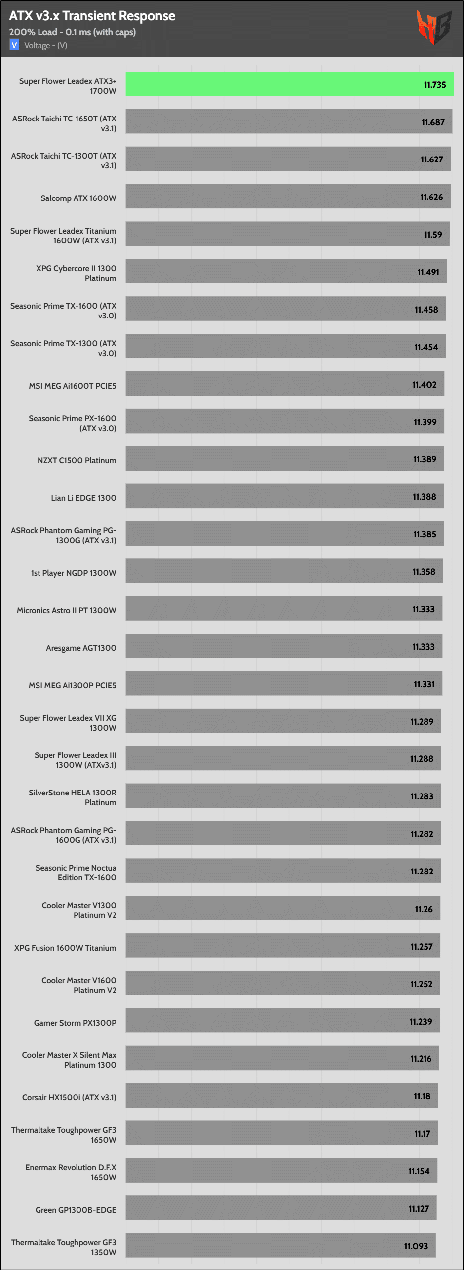 | Best ATX v3.x Transient Response (200% Load) | Super Flower Leadex ATX3+ 1700W | ASRock Taichi TC-1650T | ASRock Taichi TC-1300T |