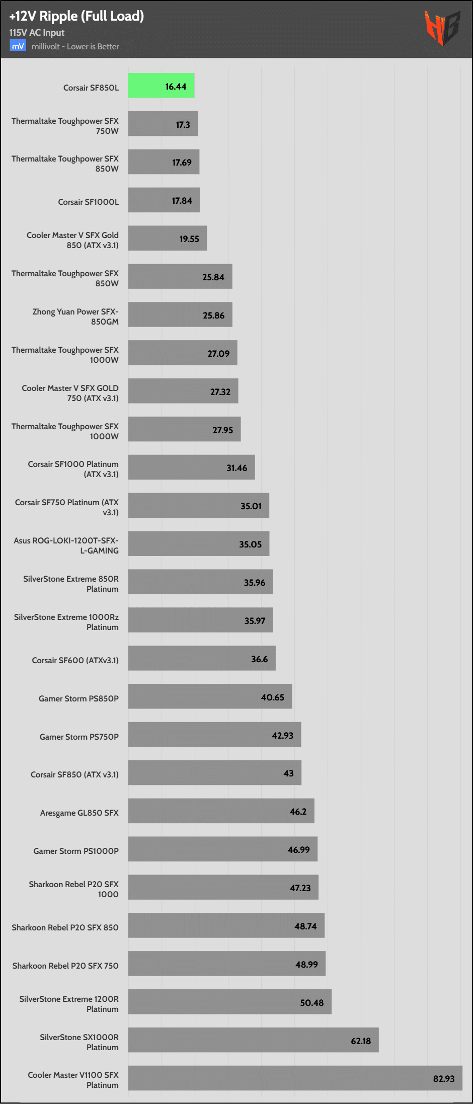 | Best 12V Rail Ripple Suppression (115V) | Corsair SF850L | Thermaltake Toughpower SFX(L) 750W | Thermaltake Toughpower SFX(L) 850W |