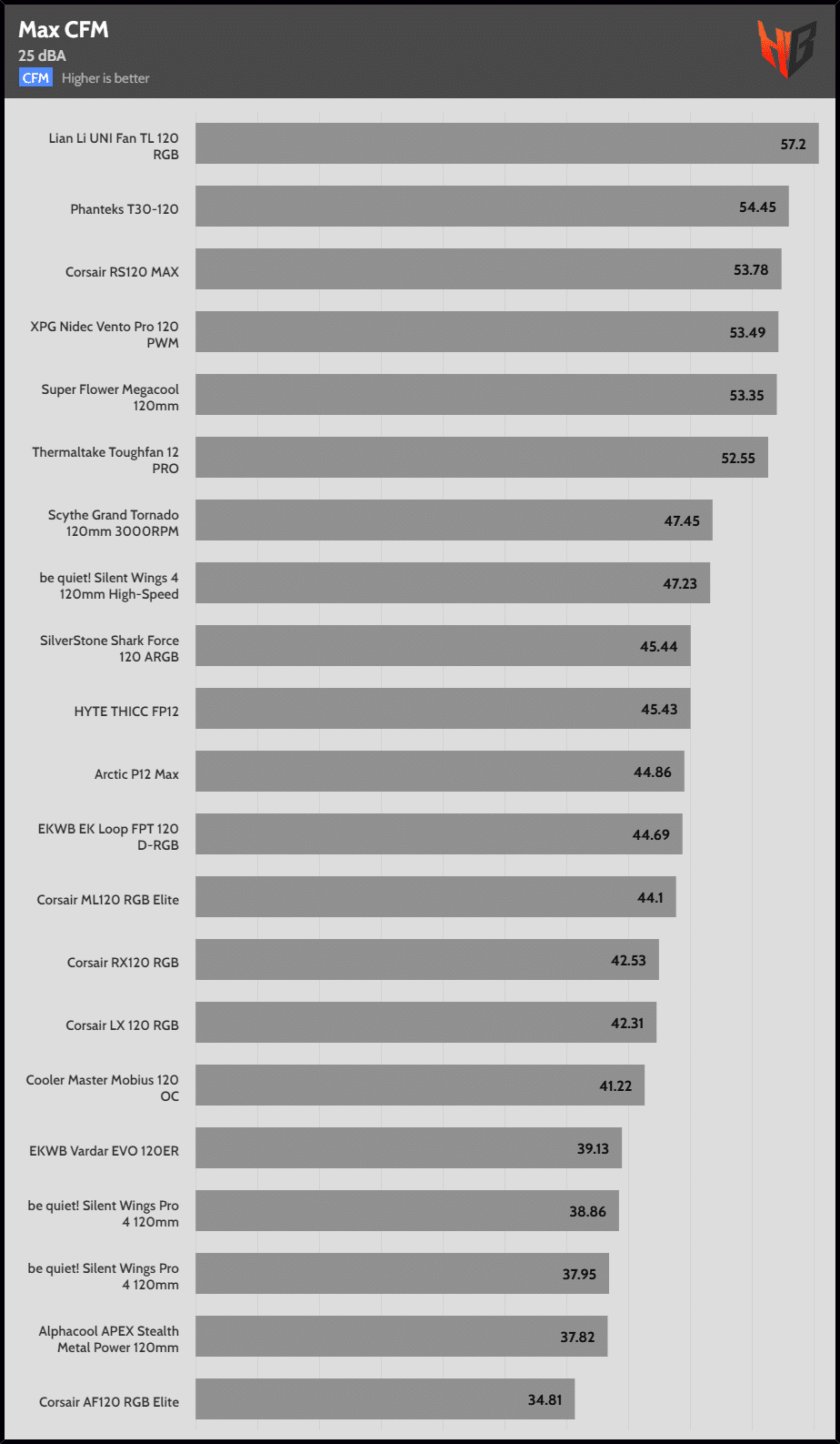 | 25 dBA | Corsair RS120 MAX | Phanteks T30-120 | Corsair LX 120 RGB |