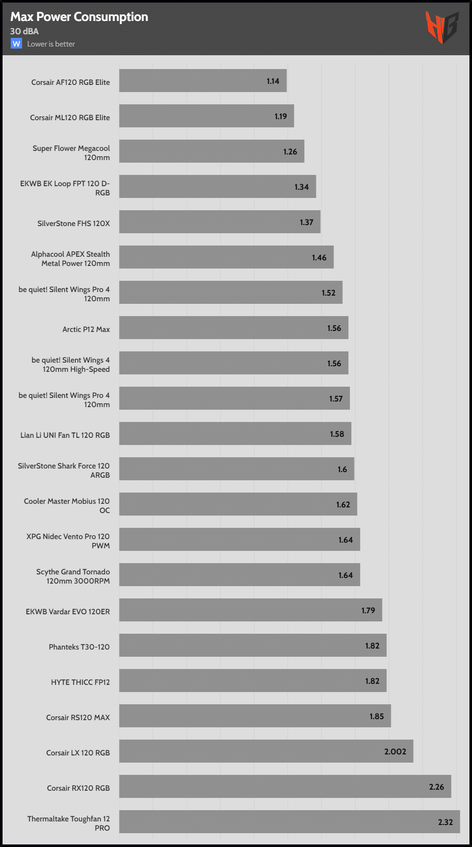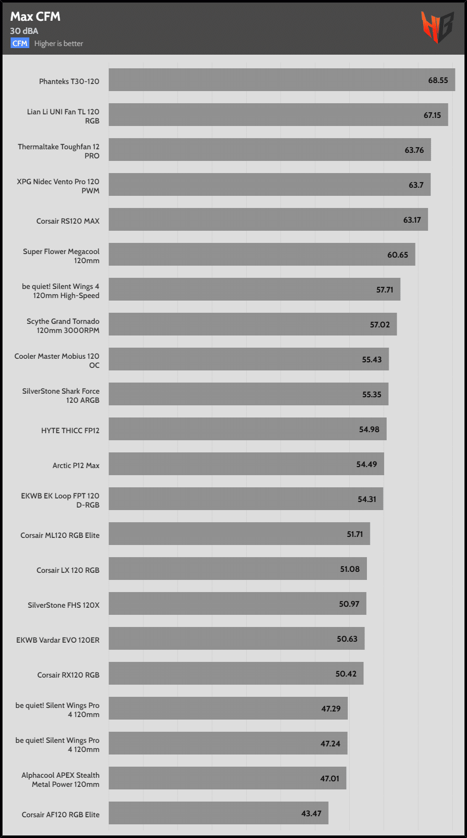 | 30 dBA | Corsair RS120 MAX | Phanteks T30-120 | Corsair LX 120 RGB |