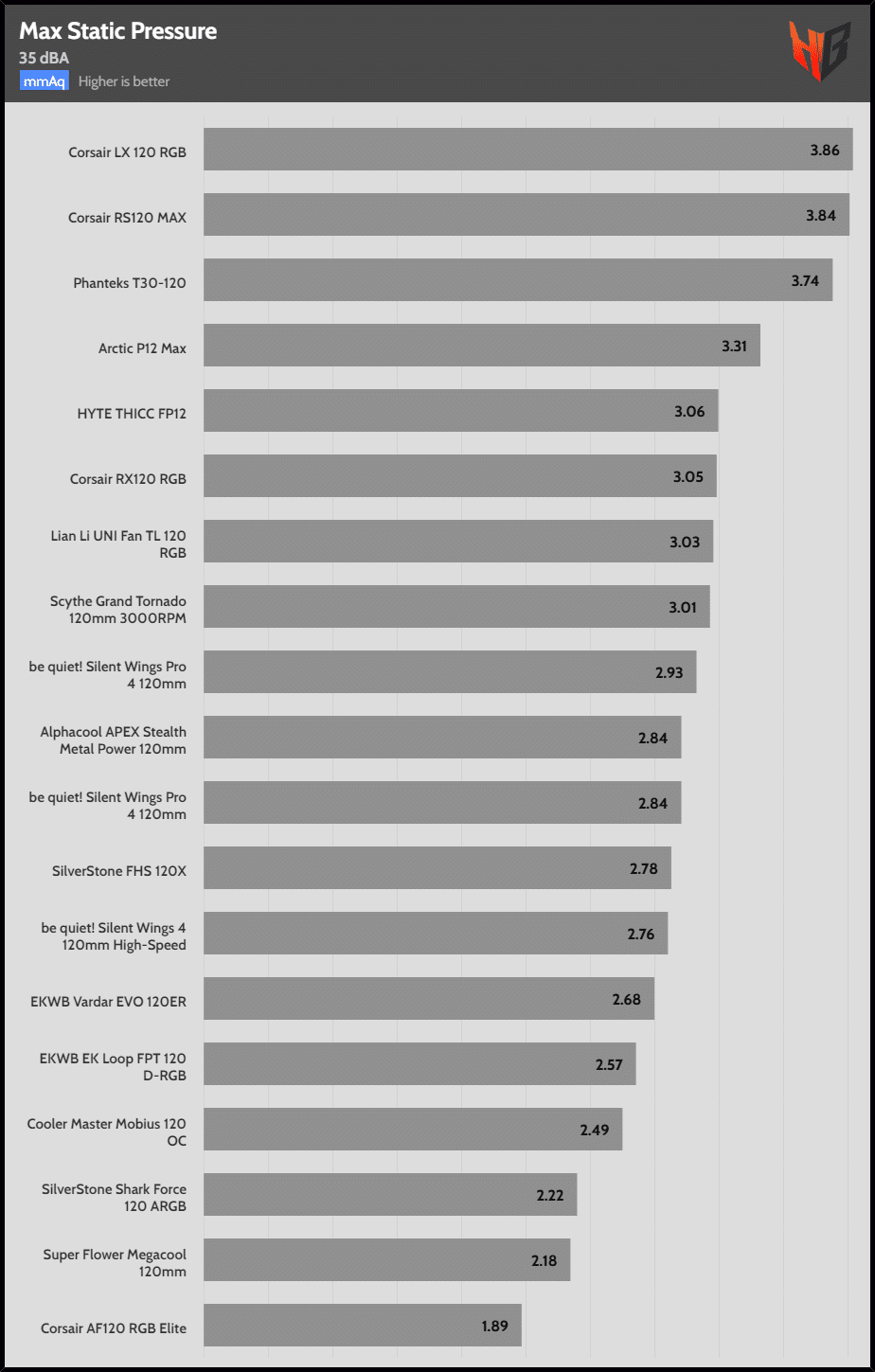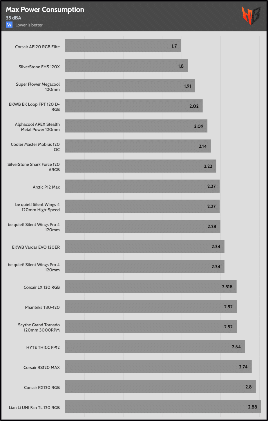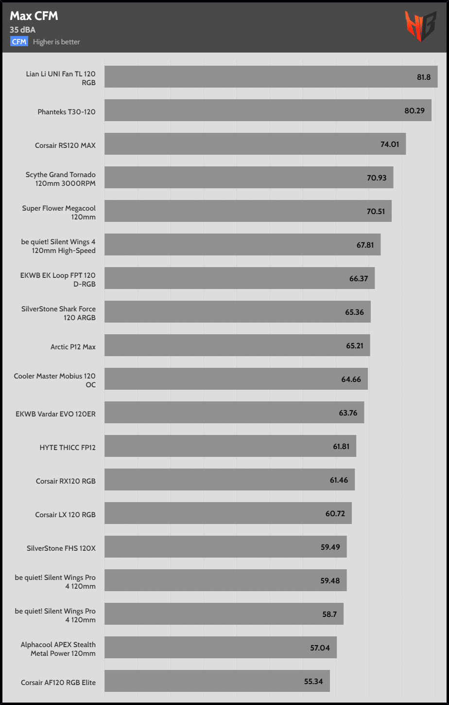 | 35 dBA | Corsair LX 120 RGB | Corsair RS120 MAX | Phanteks T30-120 |