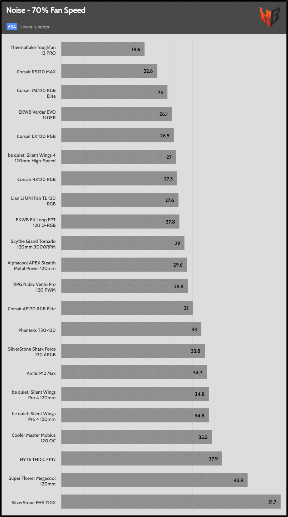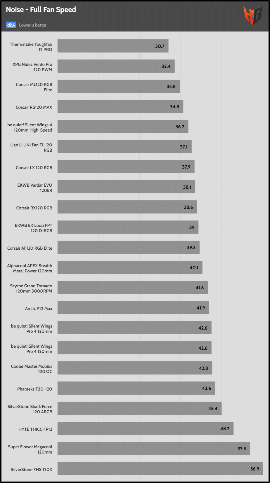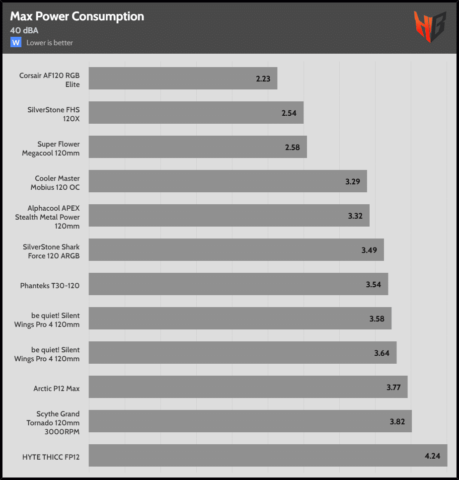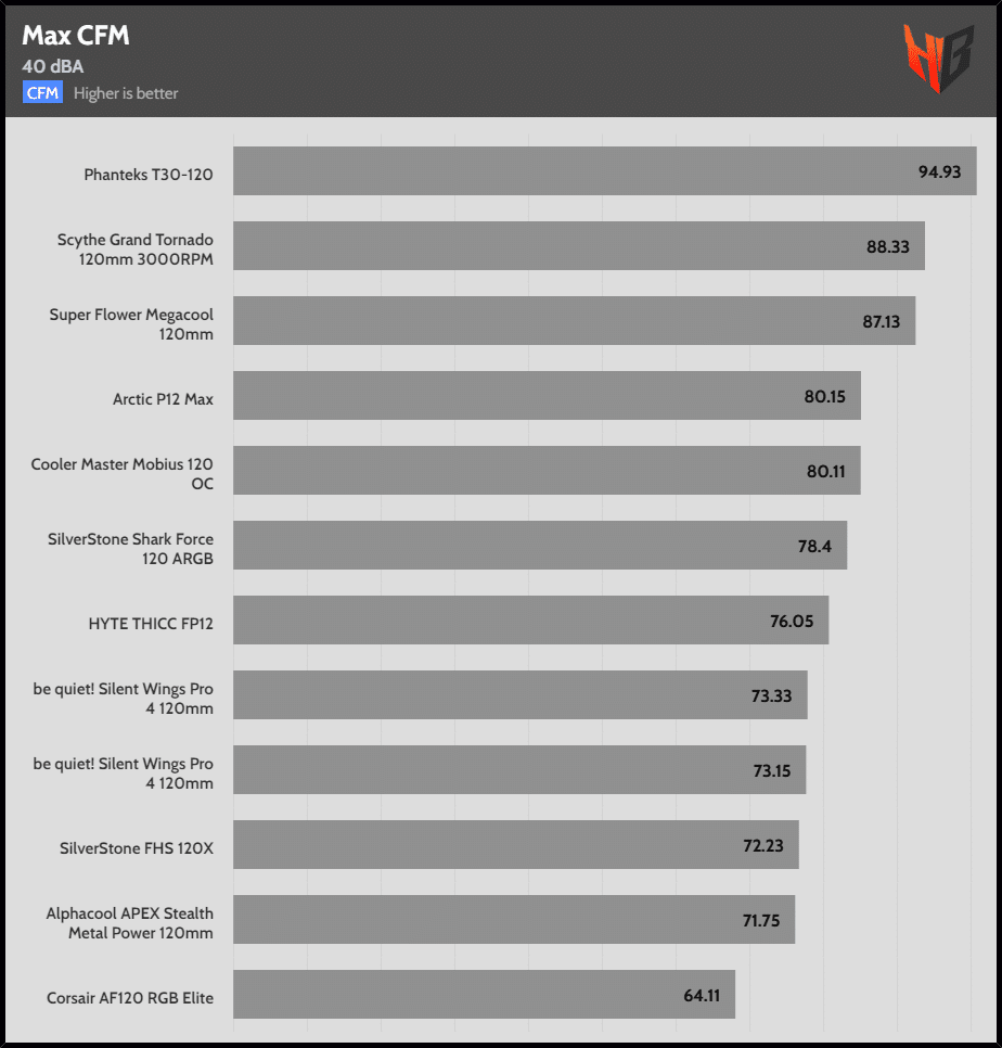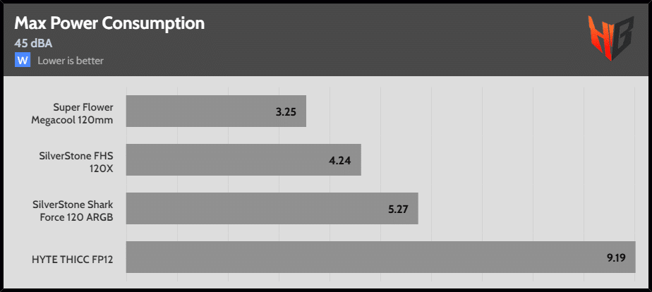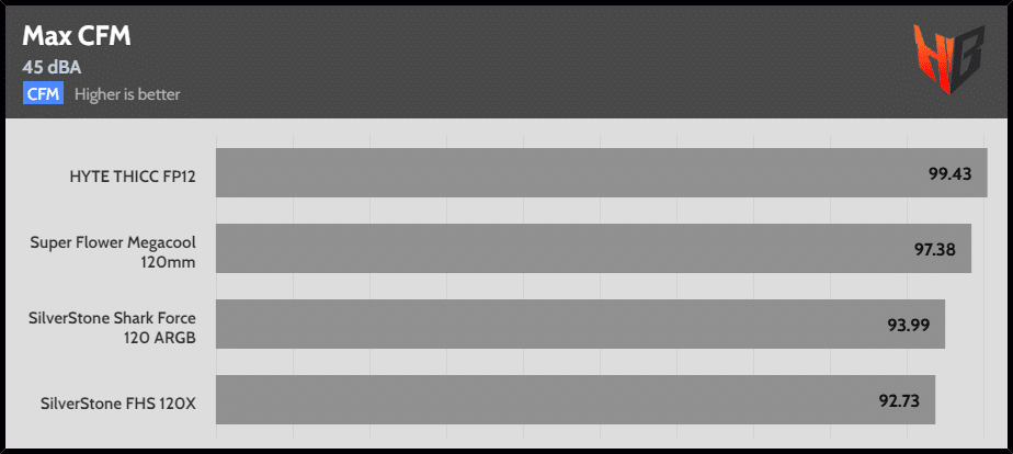 | 45 dBA | HYTE THICC PF12 | SilverStone FHS 120X | SilverStone Shark Force 120 ARGB |
