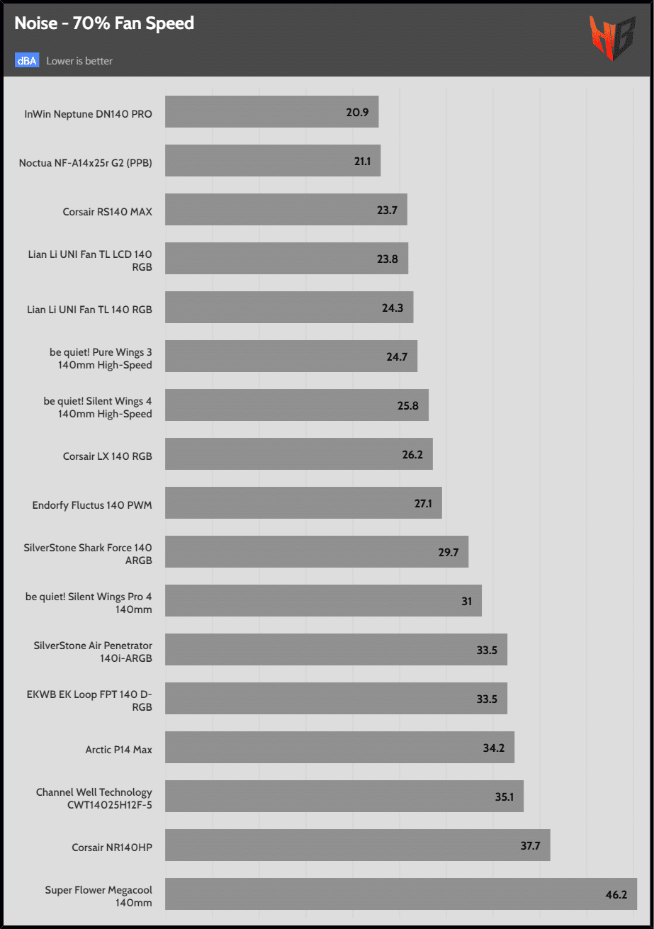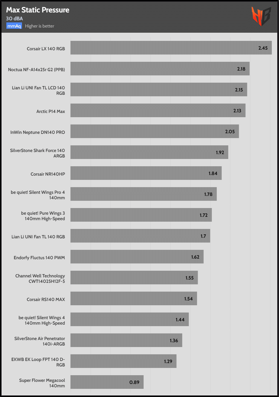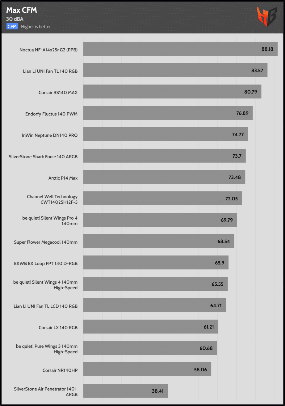 | 30 dBA | Corsair LX 140 RGB | Noctua NF-A14x25r G2 (PPB) | Lian Li UNI Fan TL LCD 140 RGB |