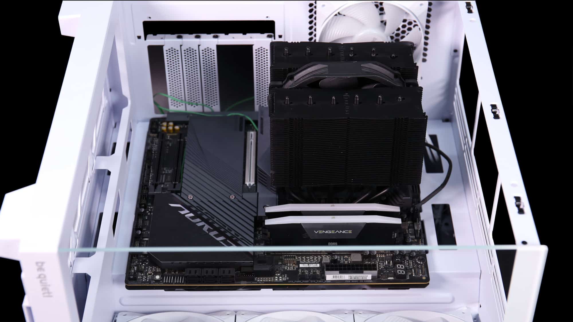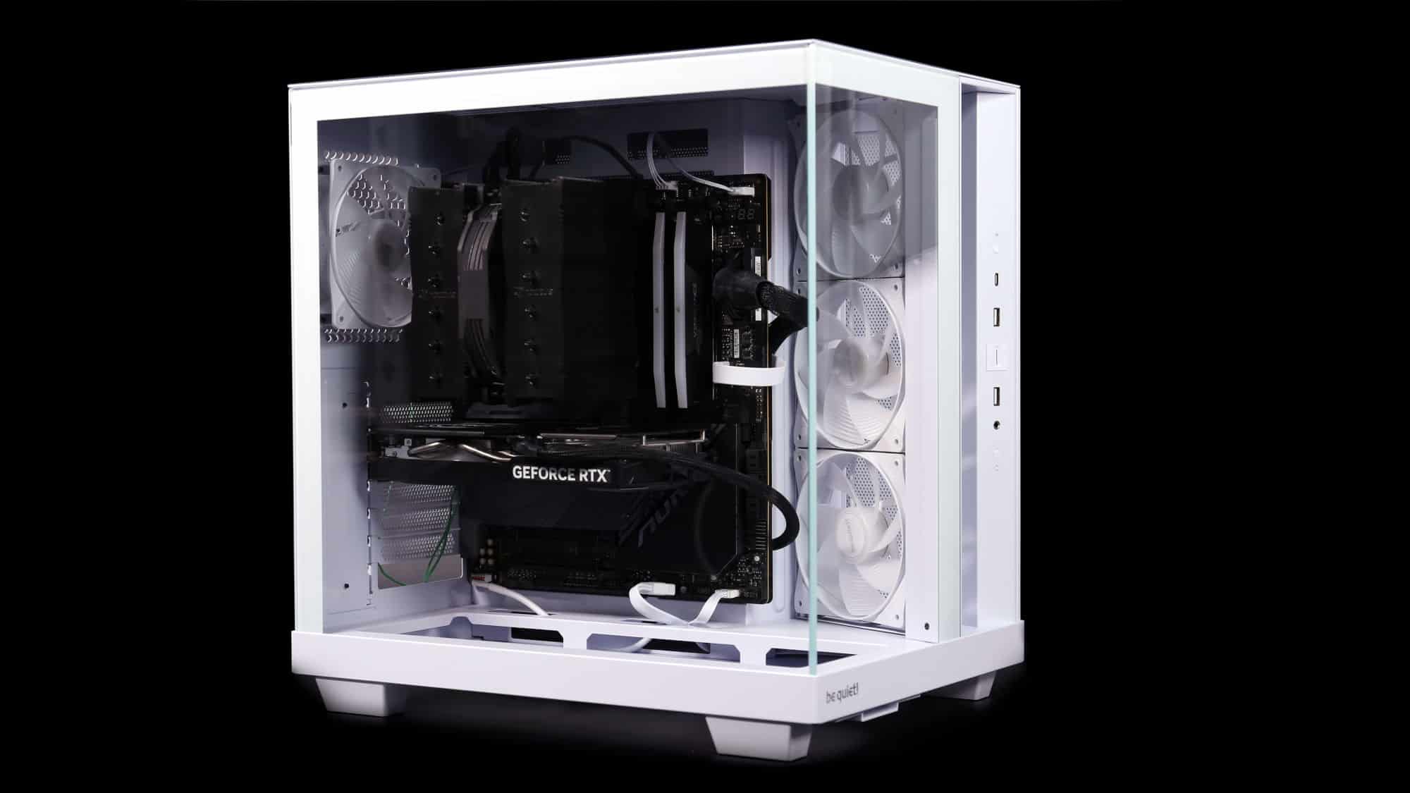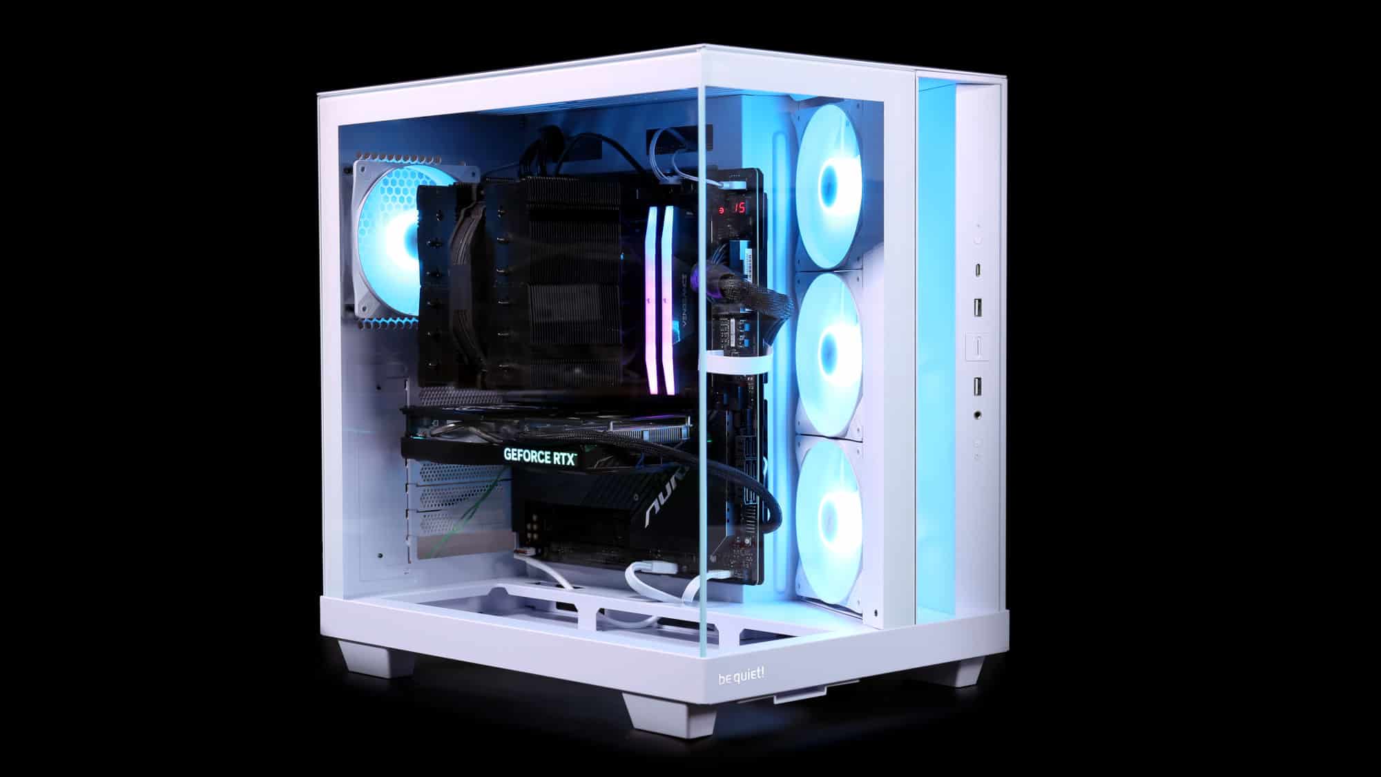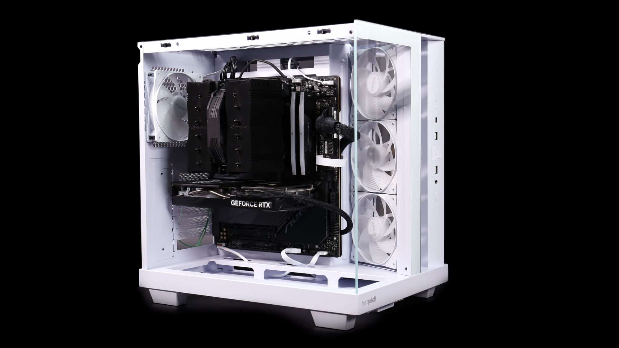 With the system powered on, the ARGB fans look great. As always, be quiet!’s lighting is high quality, bright yet tasteful. For a stealthier option, a black version with non-RGB fans is available.