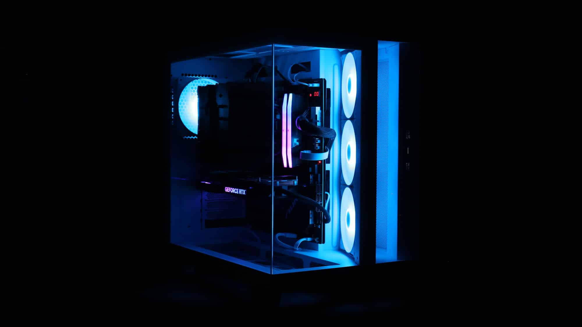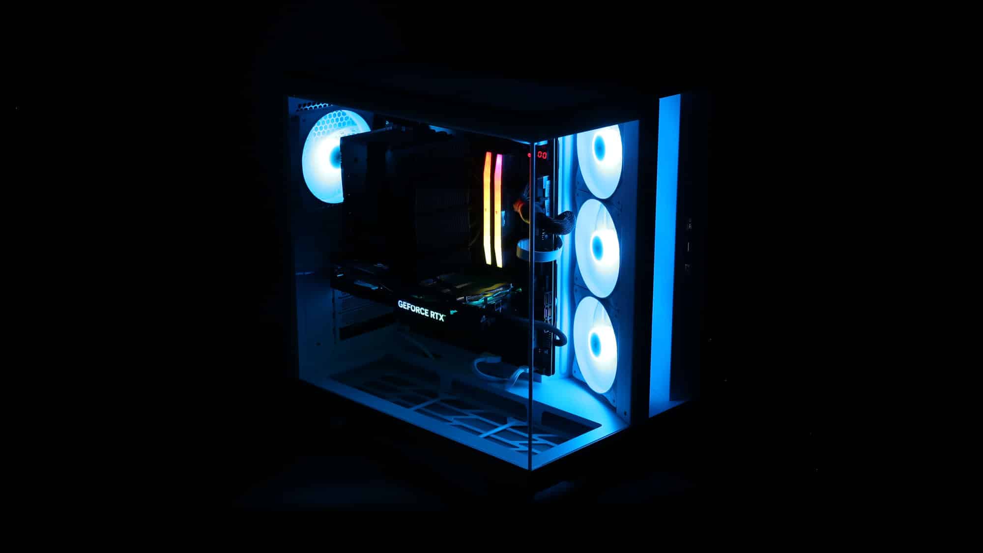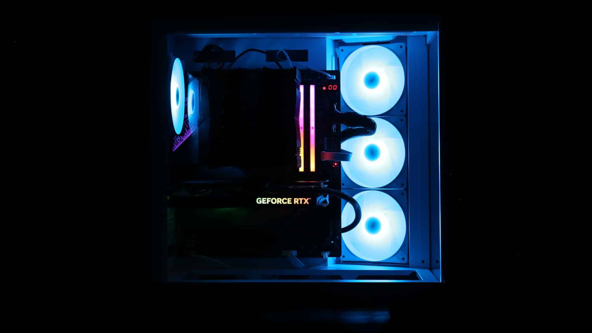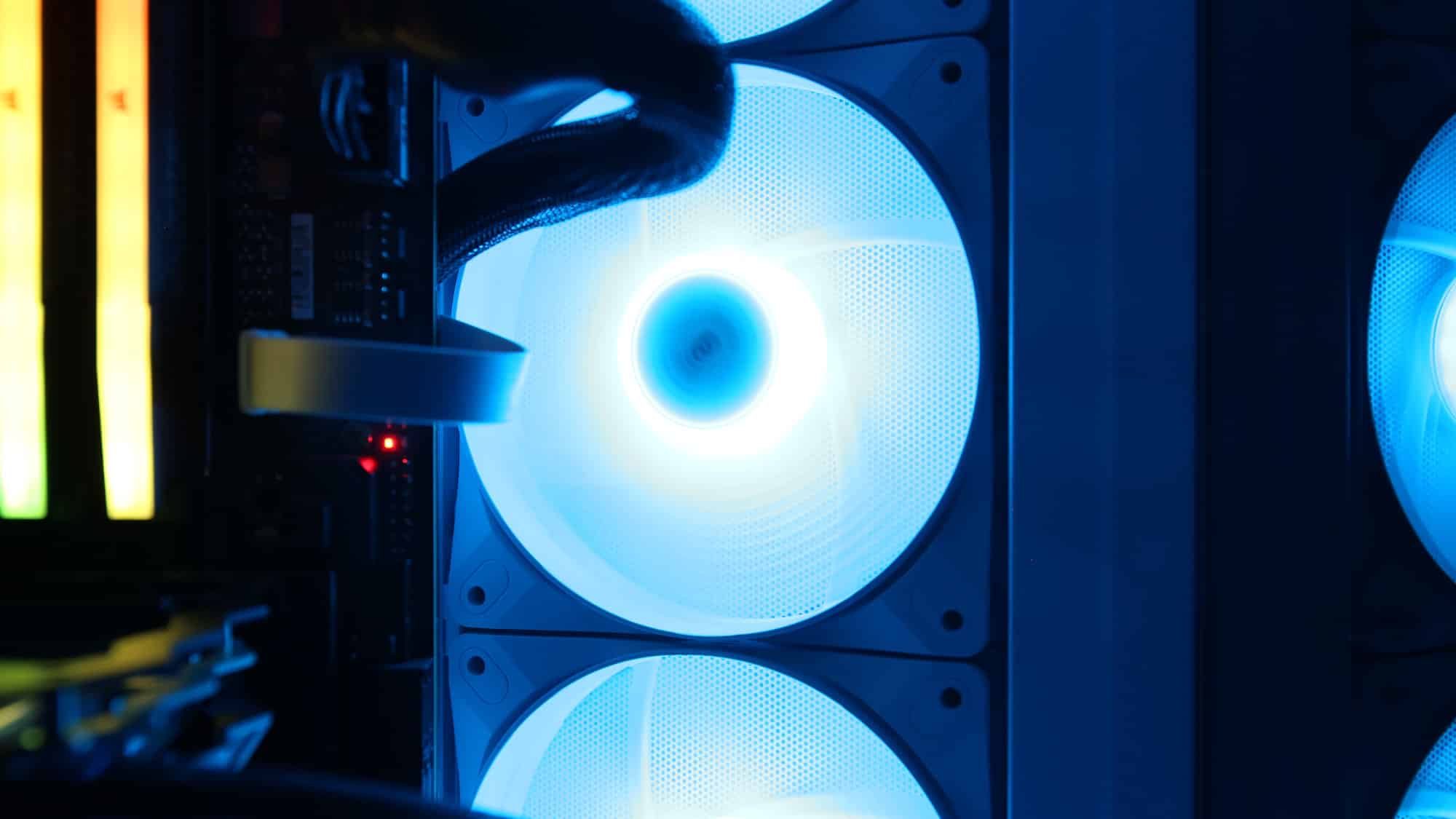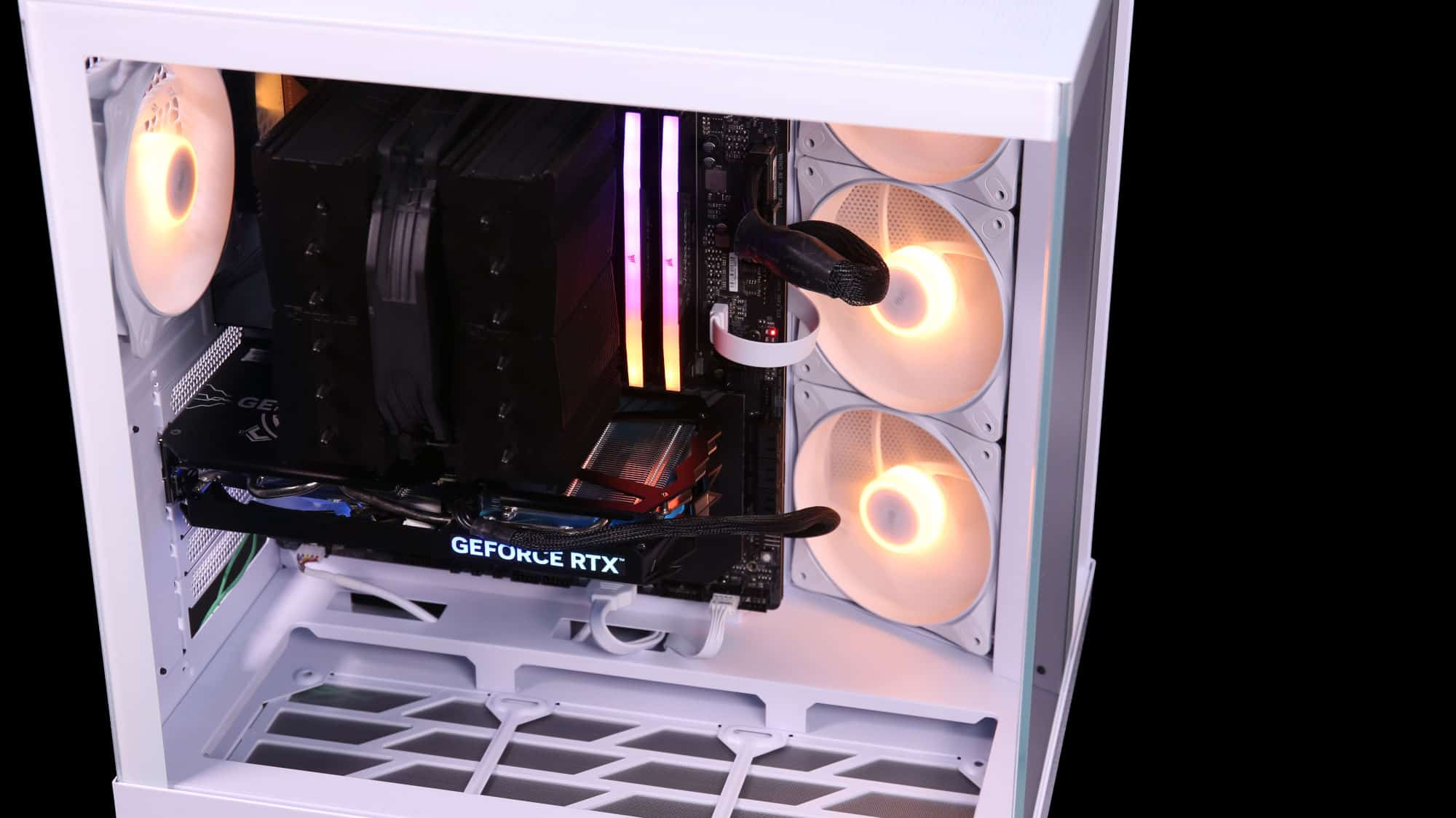 With the system powered on, the ARGB fans look great. As always, be quiet!’s lighting is high quality, bright yet tasteful. For a stealthier option, a black version with non-RGB fans is available.