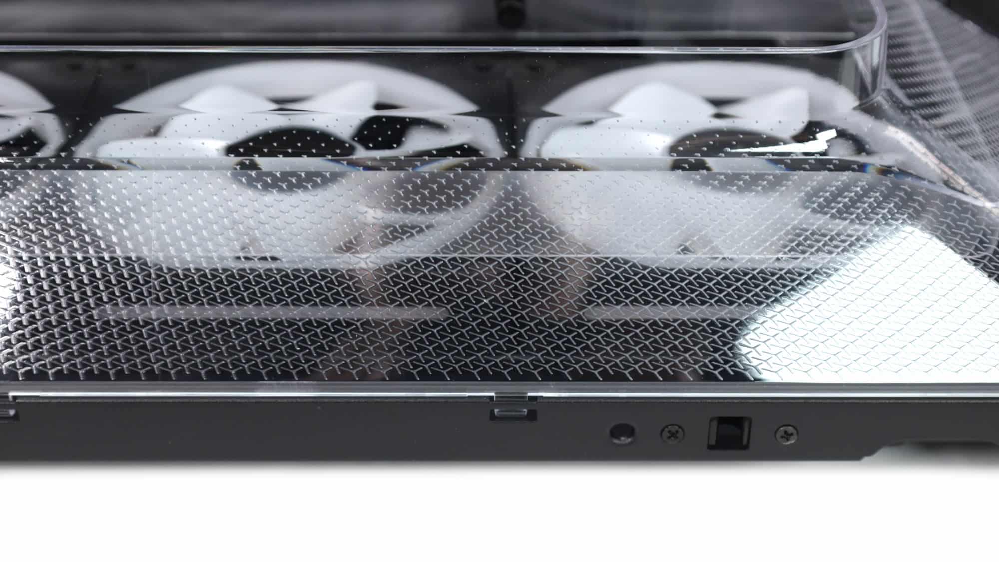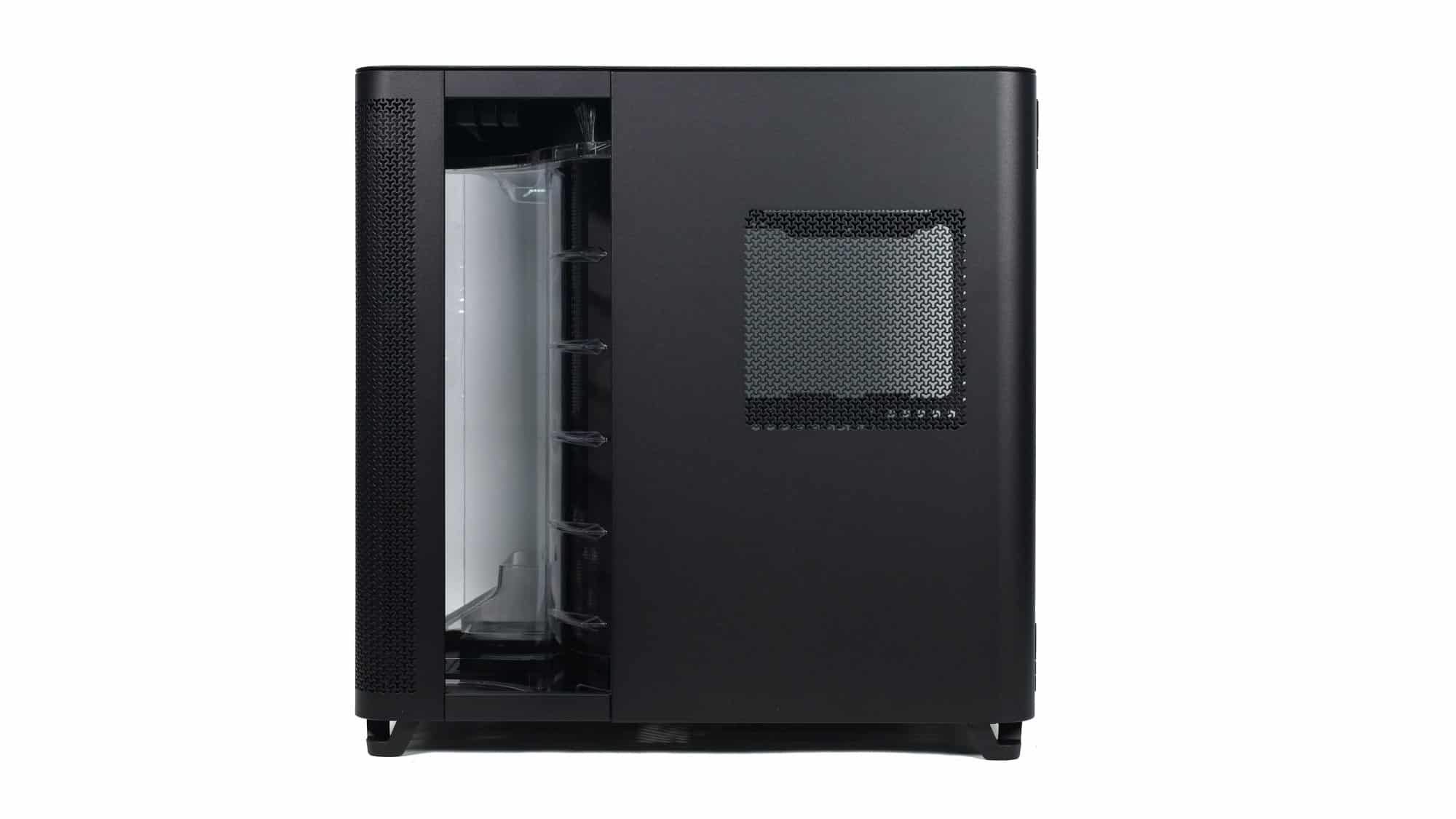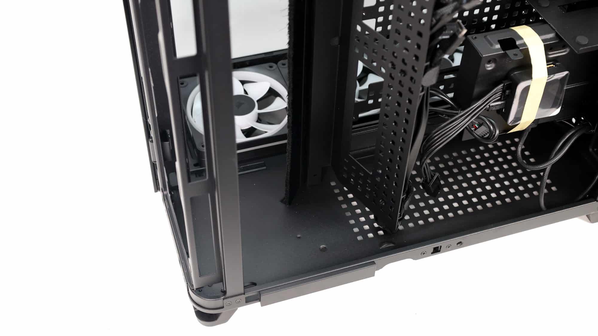 At the opposite end, there’s a filter for the bottom-mounted fans, an unfiltered opening for air circulation in the secondary chamber, indentations for easy side-panel removal, and four removable feet. The filter slides out from the side. While front access would have been ideal, this makes sense for a chassis designed to serve as a centerpiece, where side access is easier.