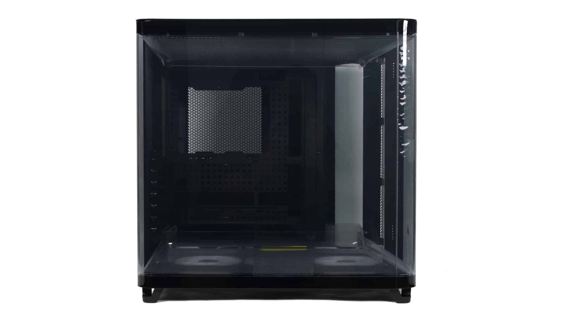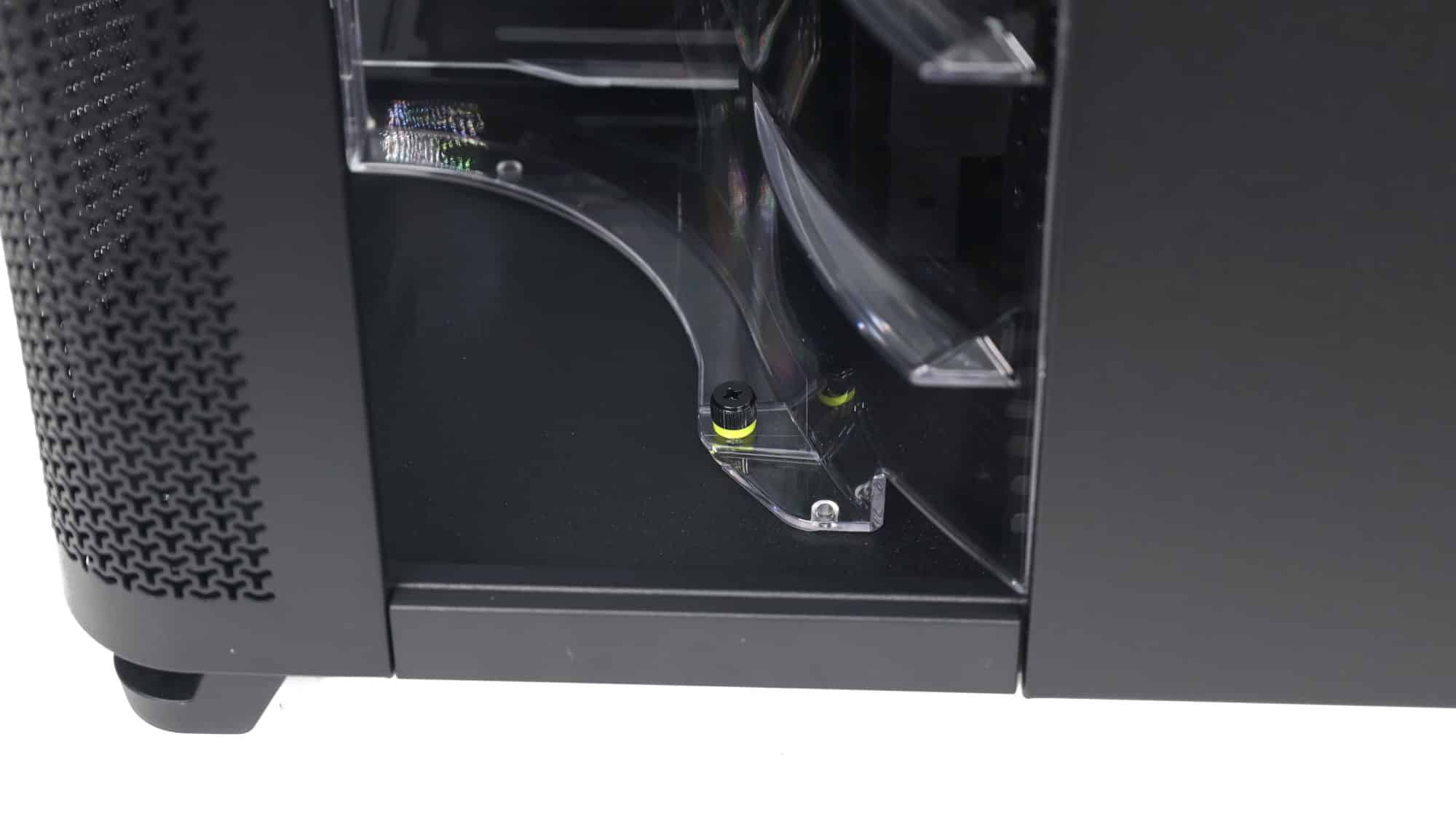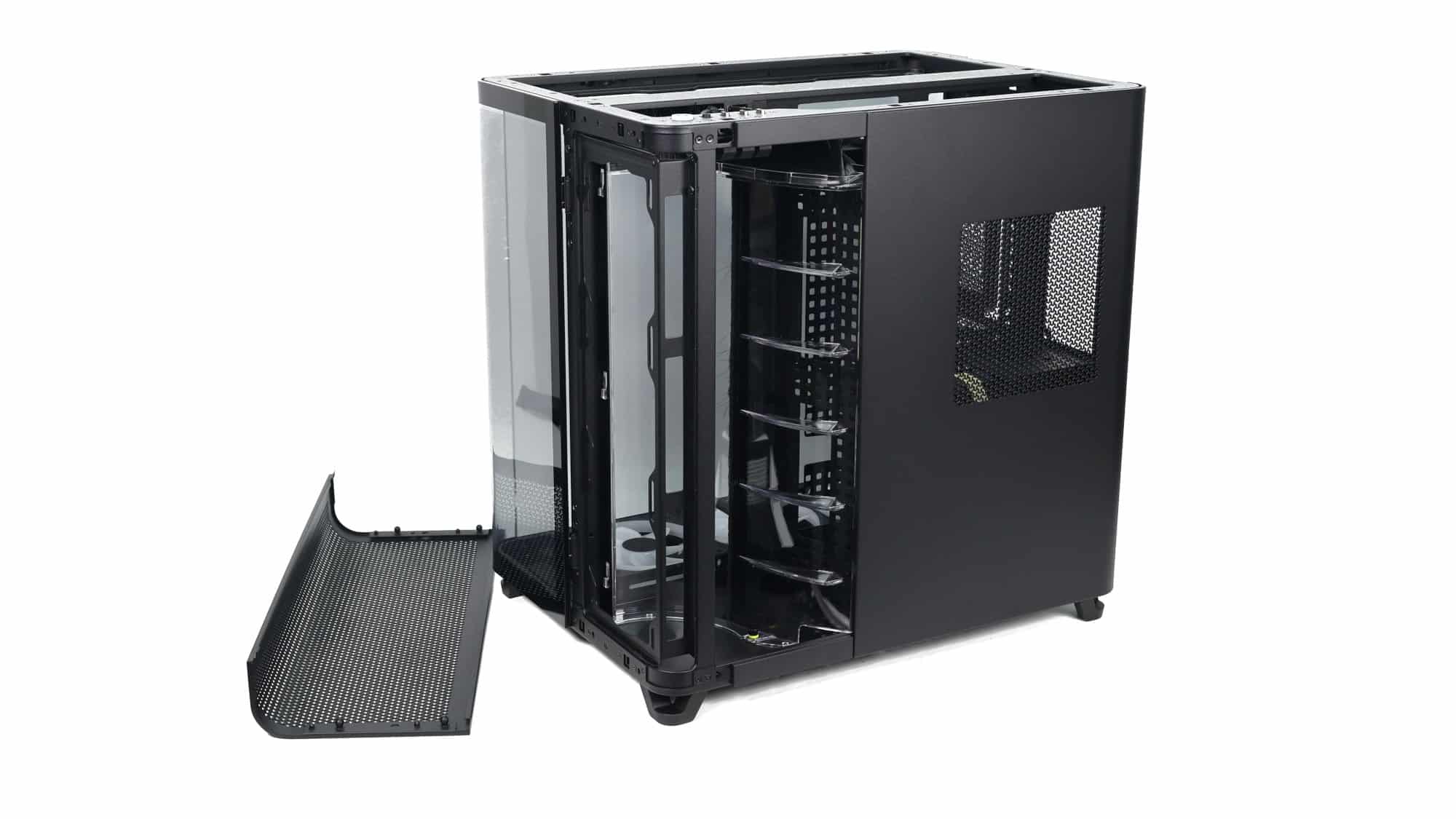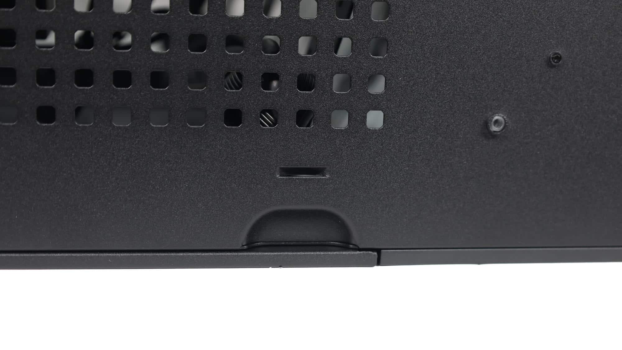At the opposite end, there’s a filter for the bottom-mounted fans, an unfiltered opening for air circulation in the secondary chamber, indentations for easy side-panel removal, and four removable feet. The filter slides out from the side. While front access would have been ideal, this makes sense for a chassis designed to serve as a centerpiece, where side access is easier.