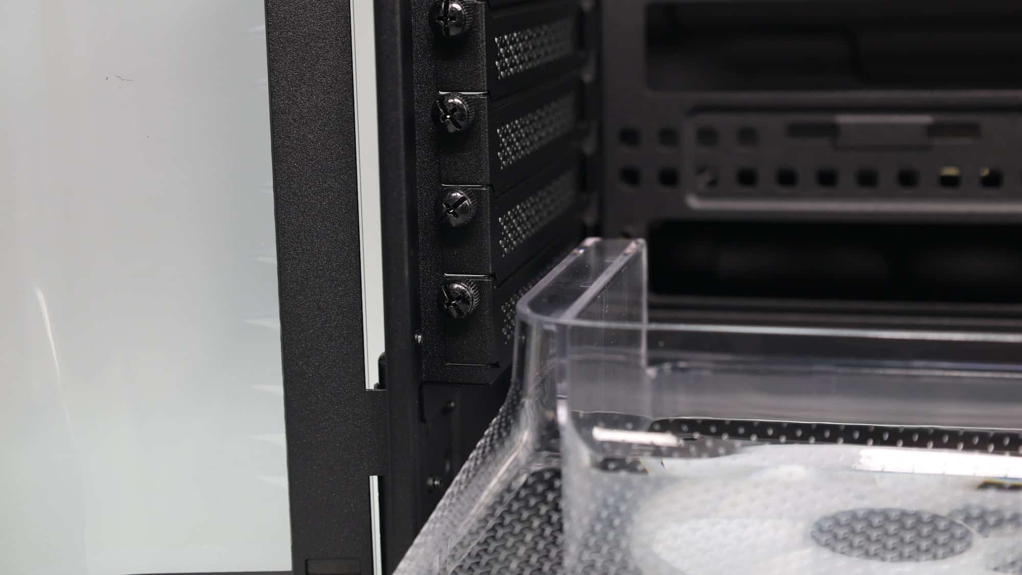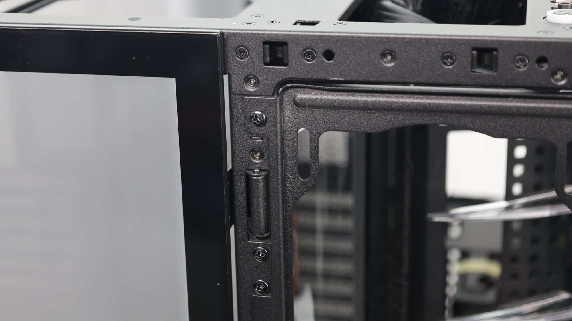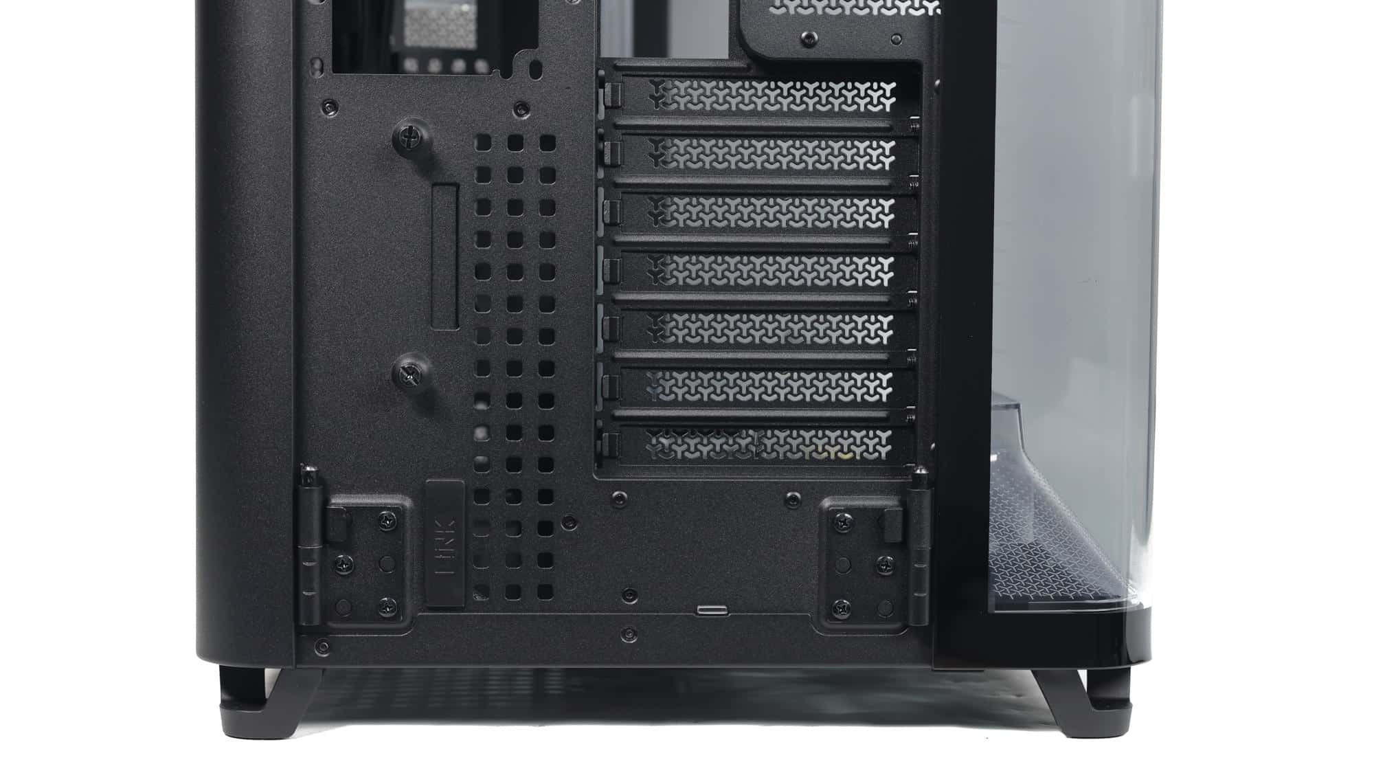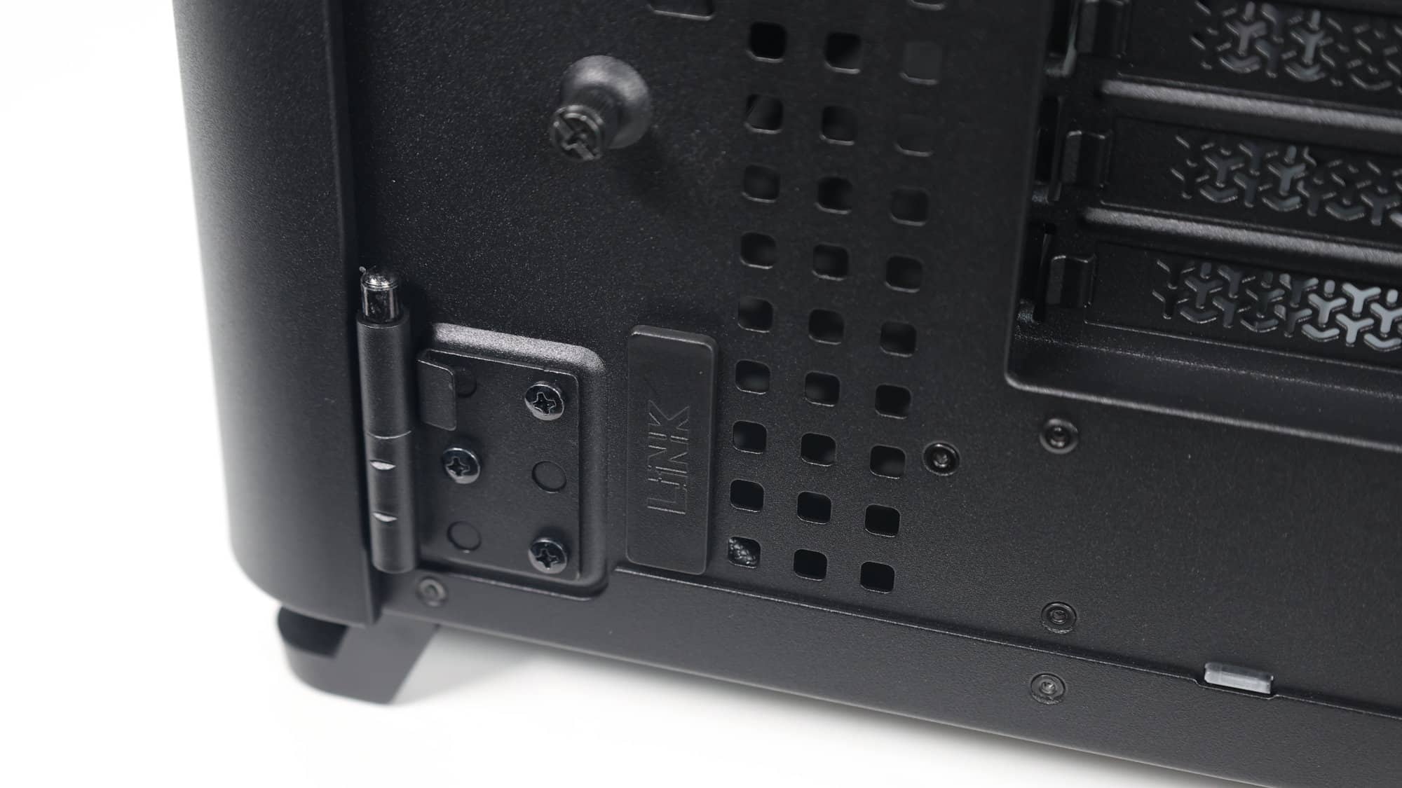 At the backside, there’s a steel panel hinged at the rear, using the same hinge design as the other side panel. This panel features perforations that reveal the PSU position.