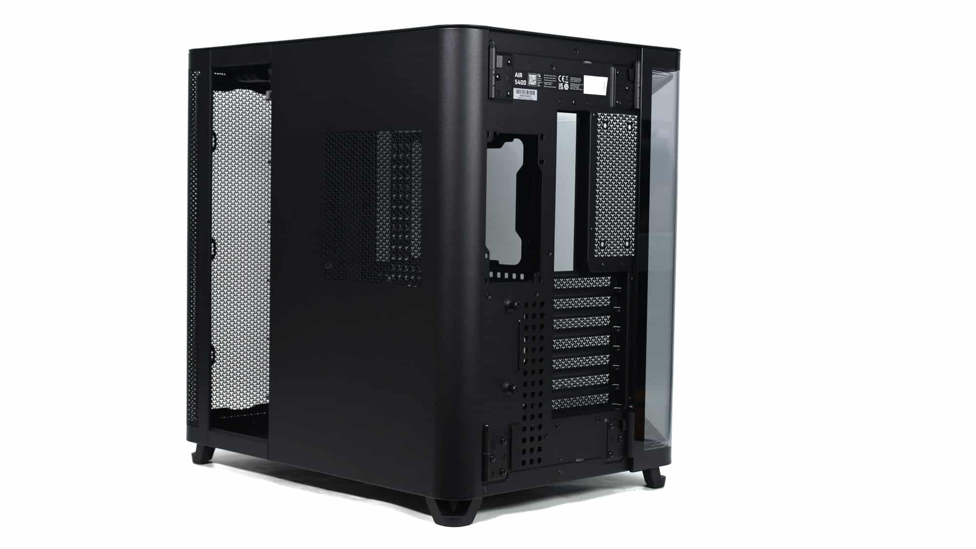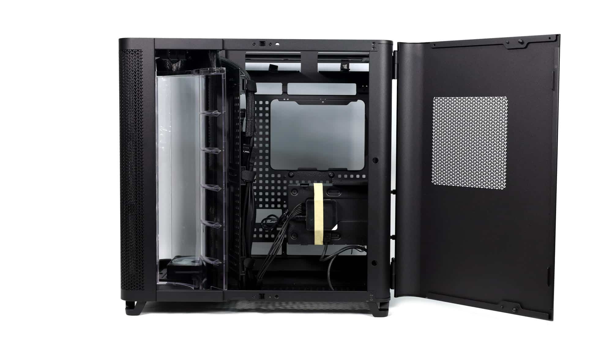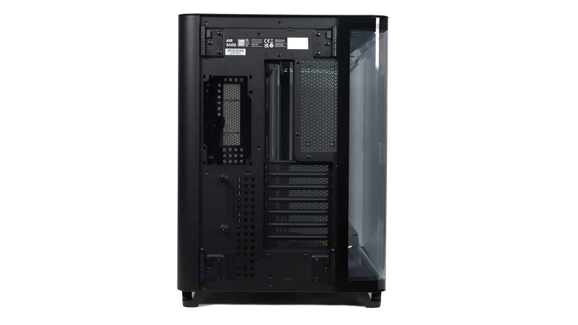 At the backside, there’s a steel panel hinged at the rear, using the same hinge design as the other side panel. This panel features perforations that reveal the PSU position.