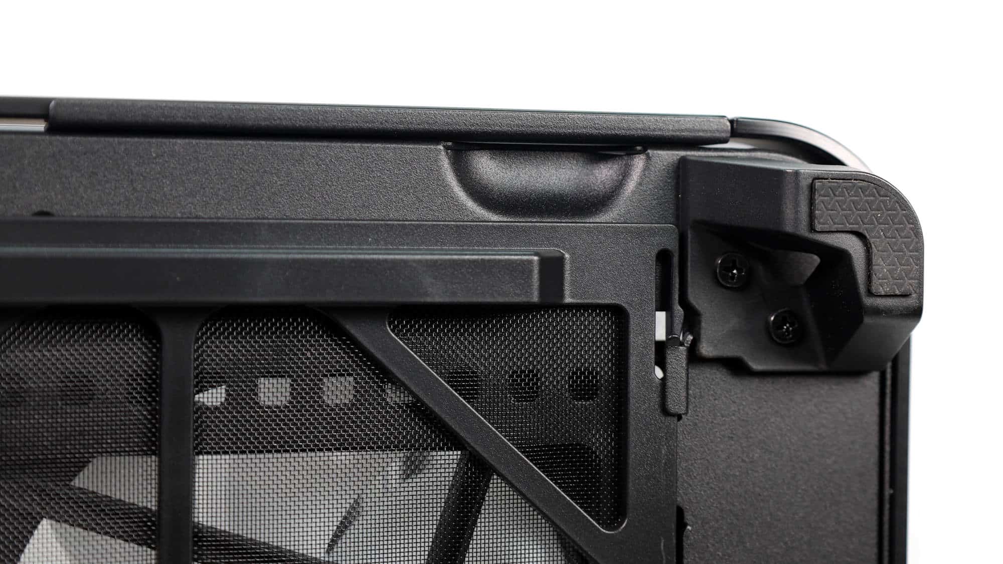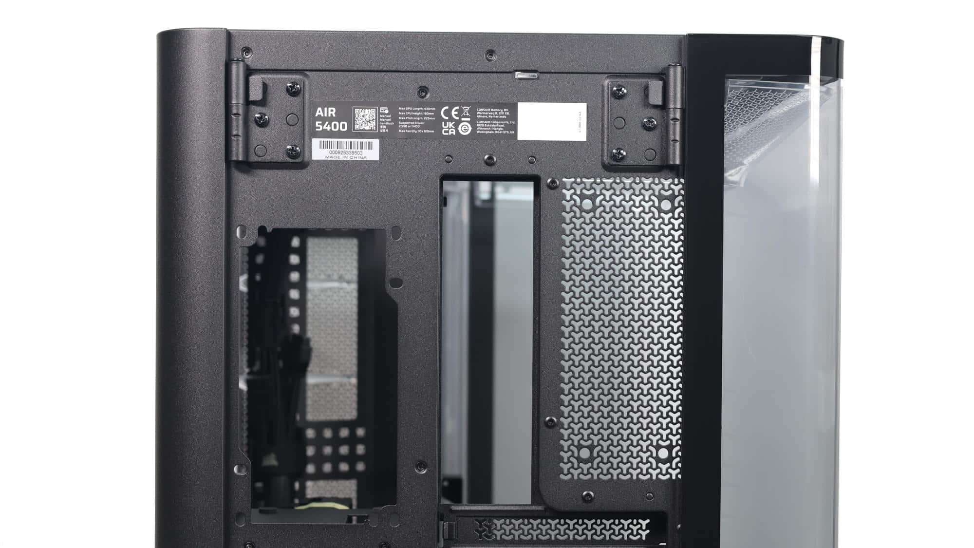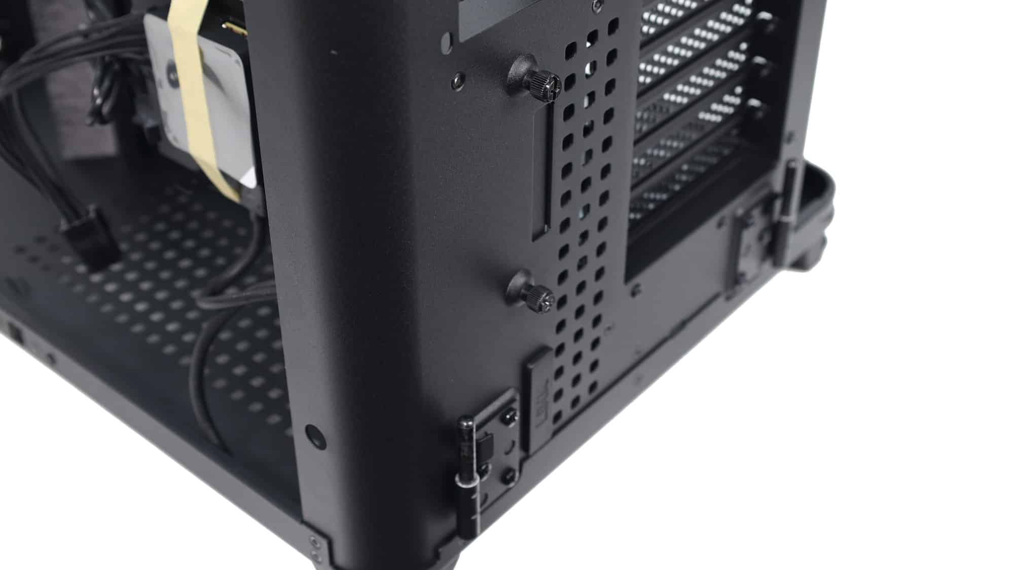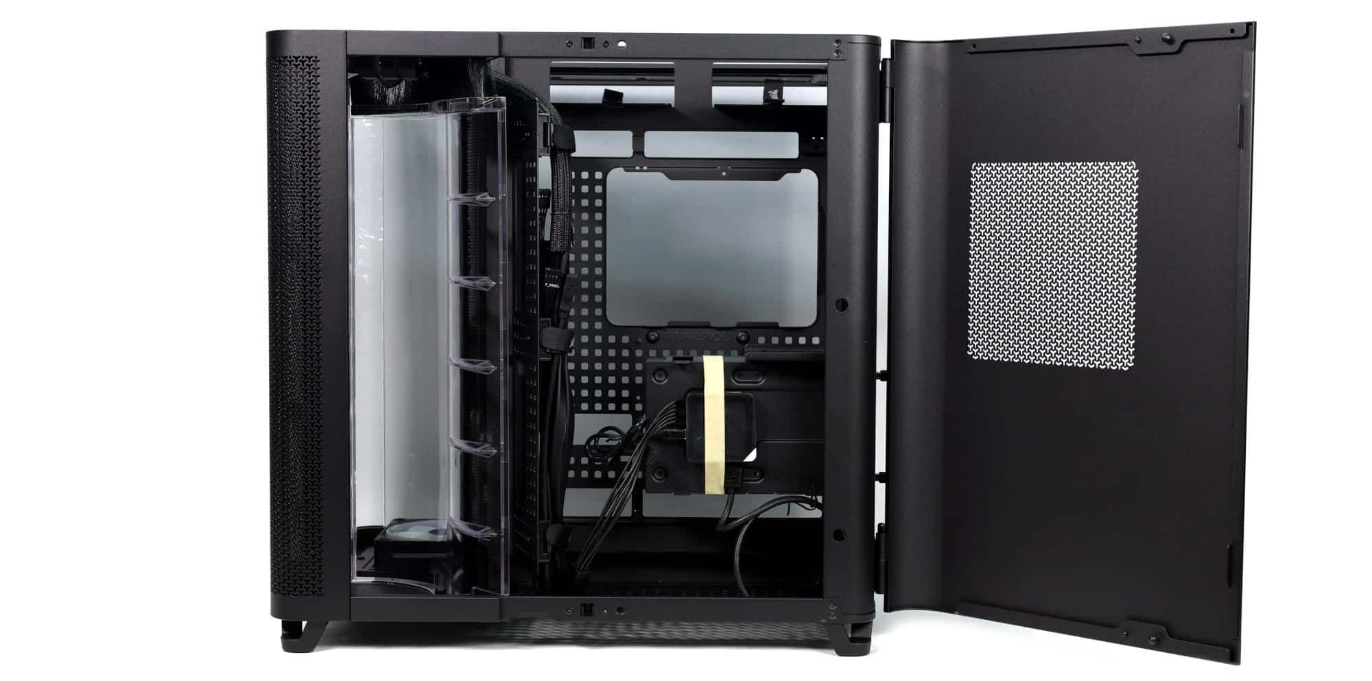 At the backside, there’s a steel panel hinged at the rear, using the same hinge design as the other side panel. This panel features perforations that reveal the PSU position.