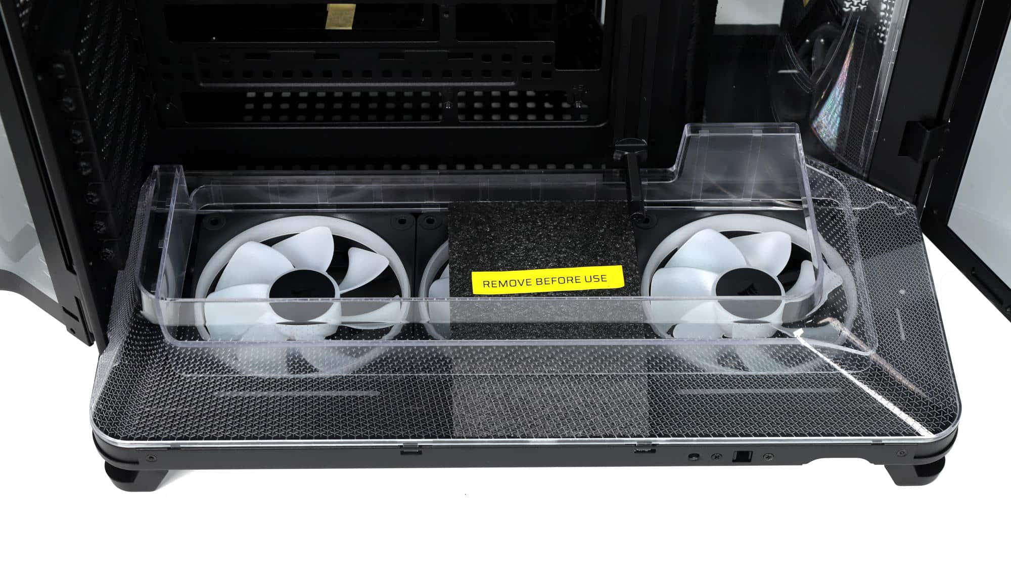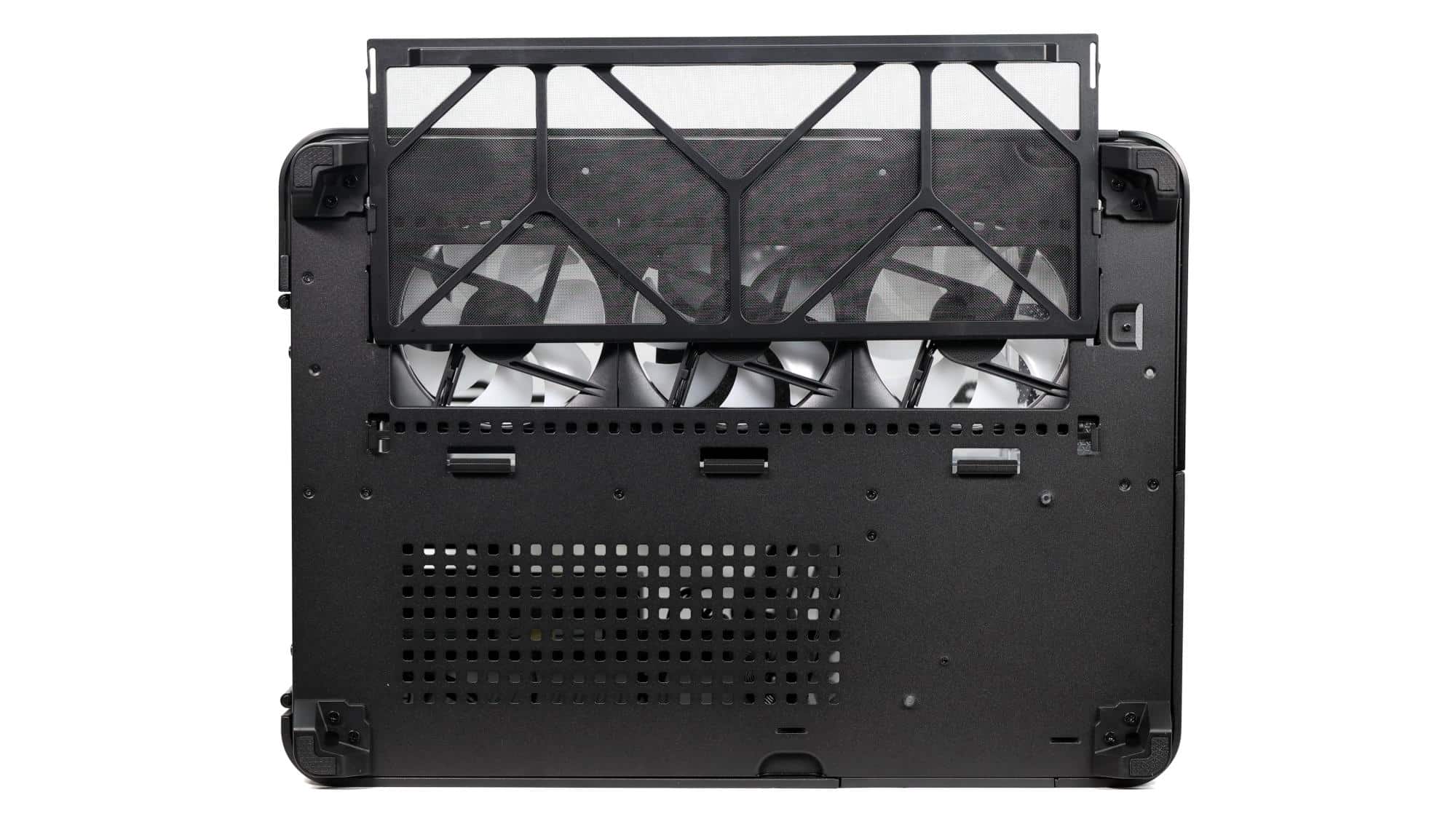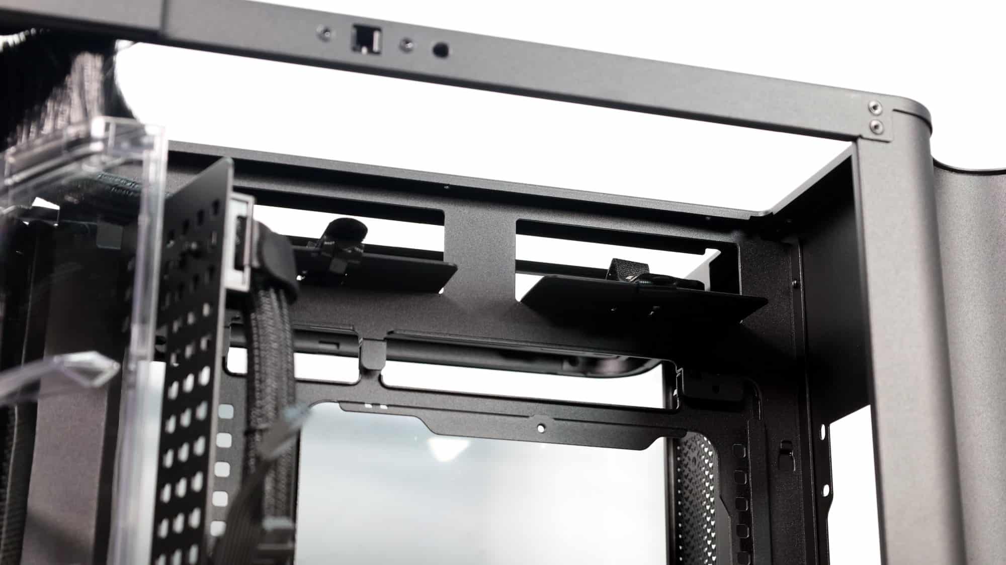 Cooling is one of this chassis’s highlights. There are mounting points for up to six fans in the main chamber: three at the bottom and three at the top, with the option to add an additional rear fan using the included bracket. The ducts are designed to direct airflow toward critical components, while the design supports dual AIO setups: one external unit in the third chamber and another at the top of the main chamber.