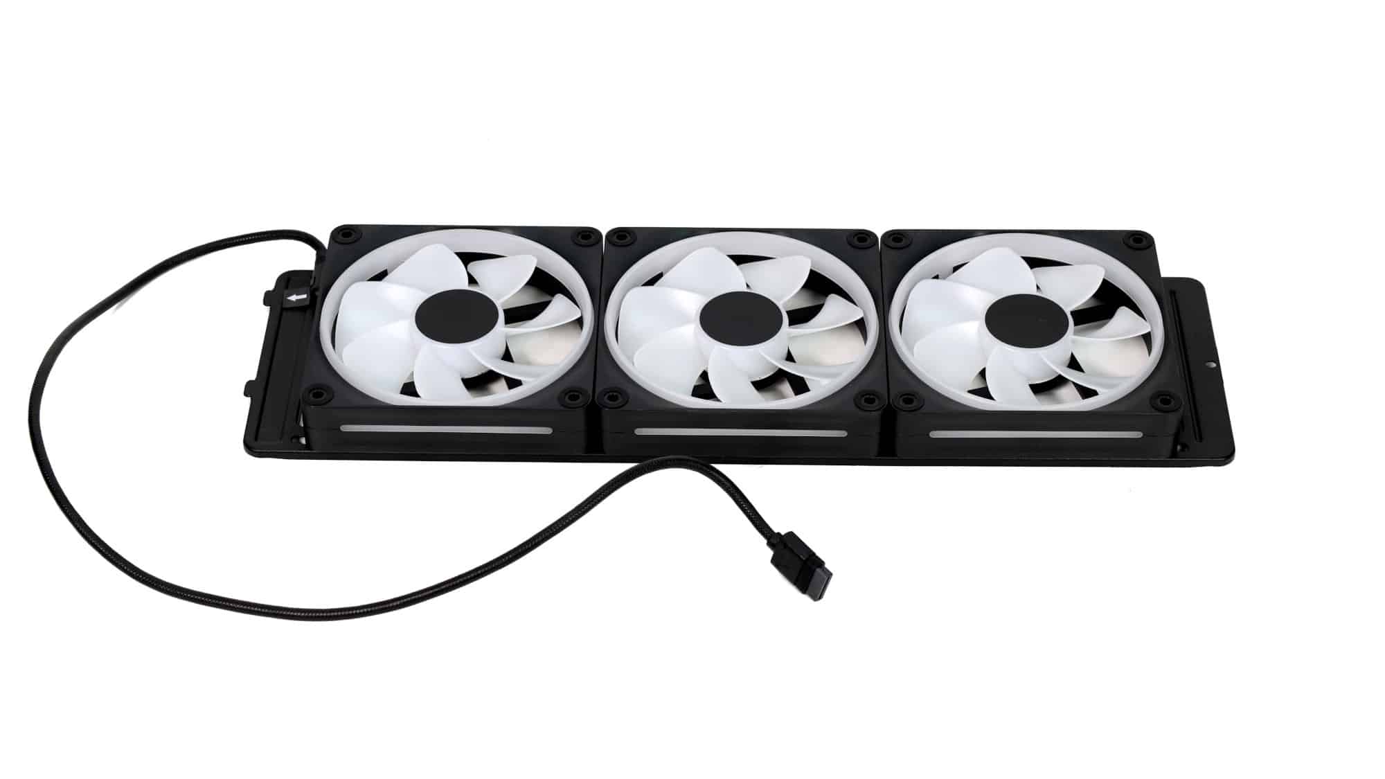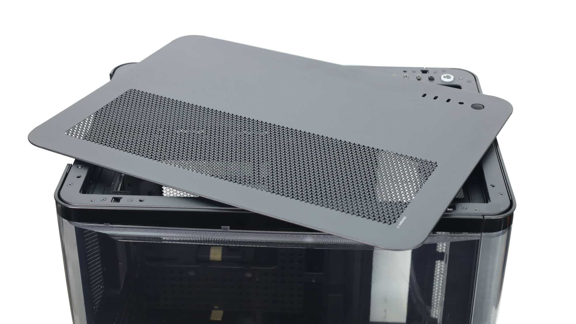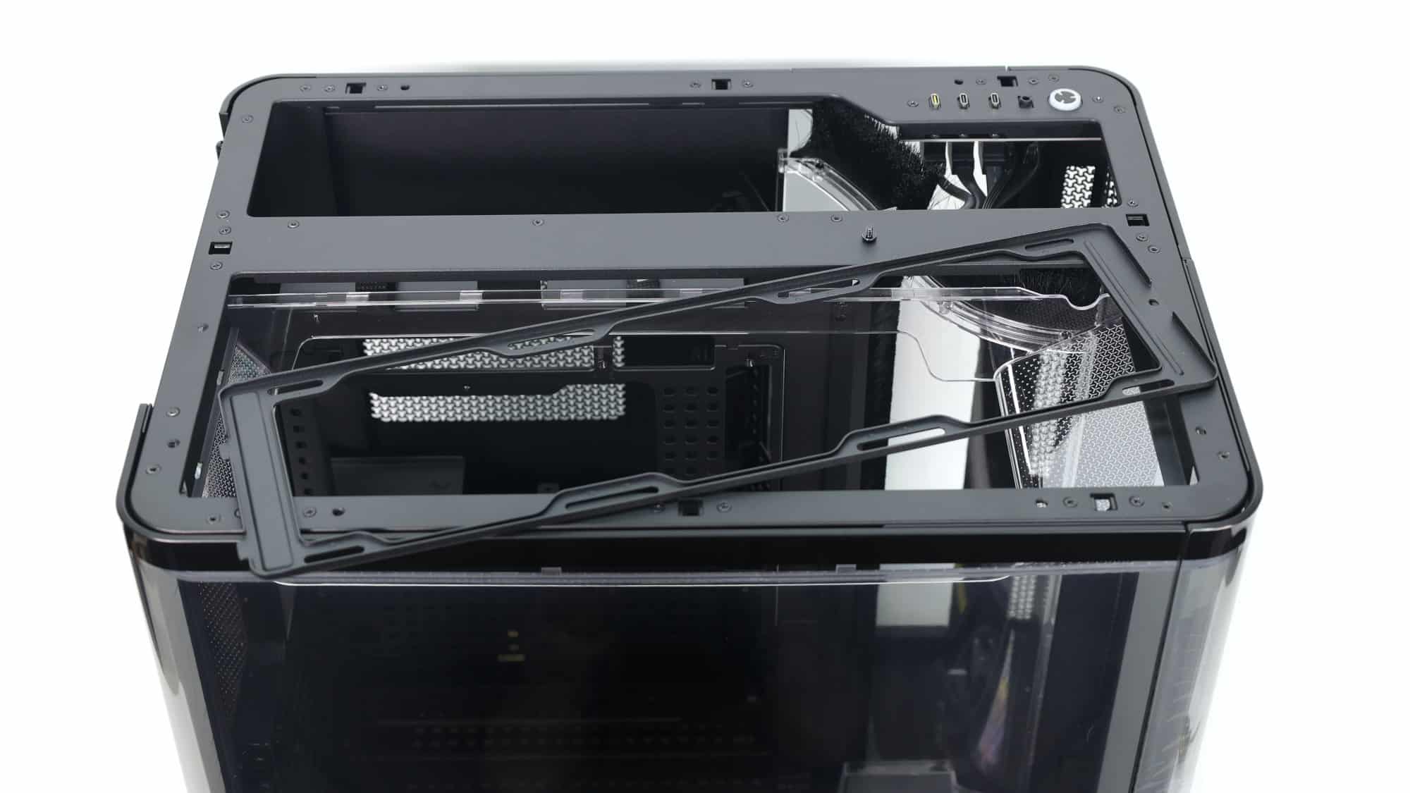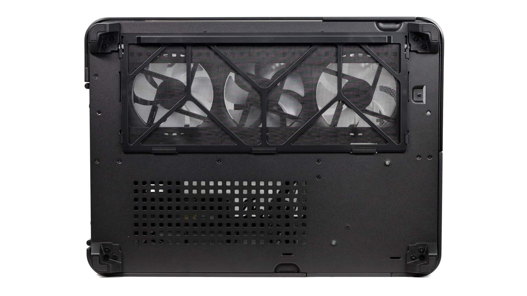 Cooling is one of this chassis’s highlights. There are mounting points for up to six fans in the main chamber: three at the bottom and three at the top, with the option to add an additional rear fan using the included bracket. The ducts are designed to direct airflow toward critical components, while the design supports dual AIO setups: one external unit in the third chamber and another at the top of the main chamber.