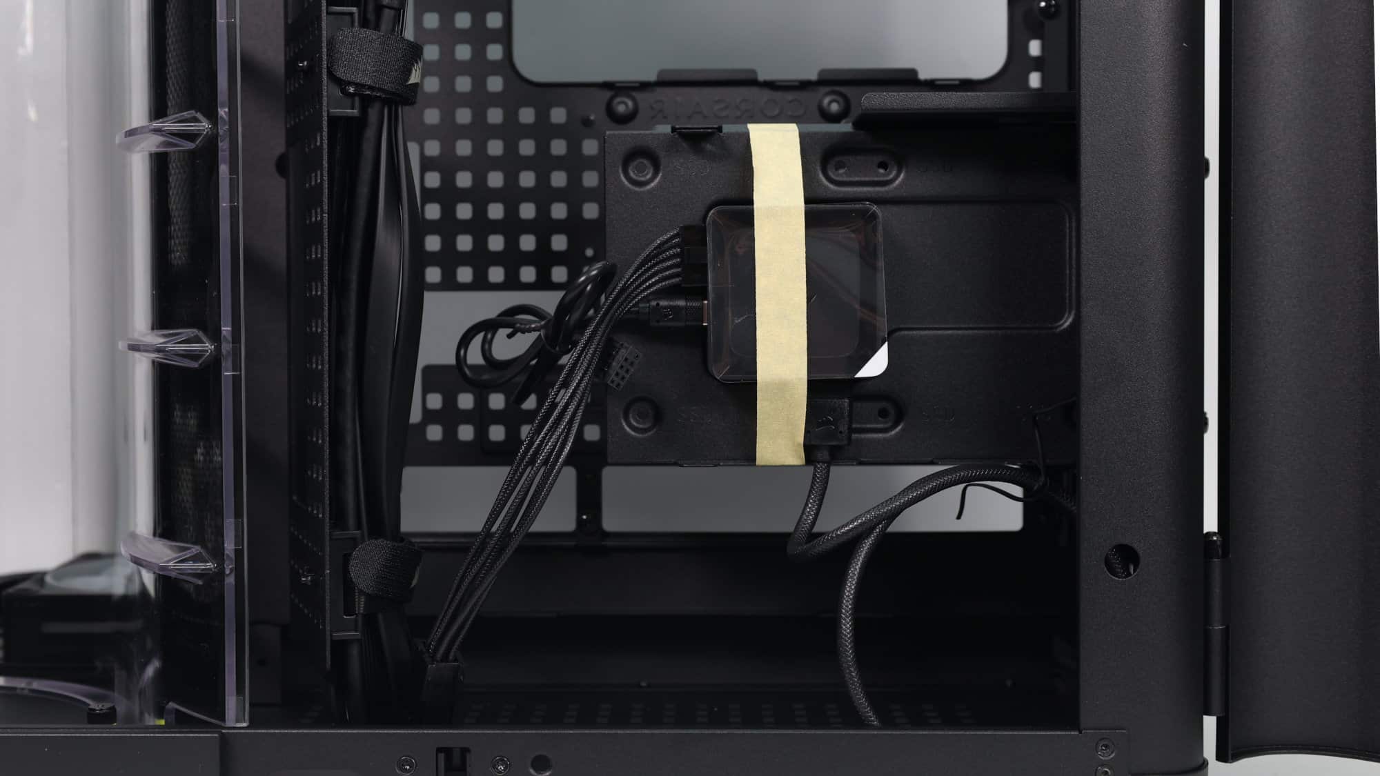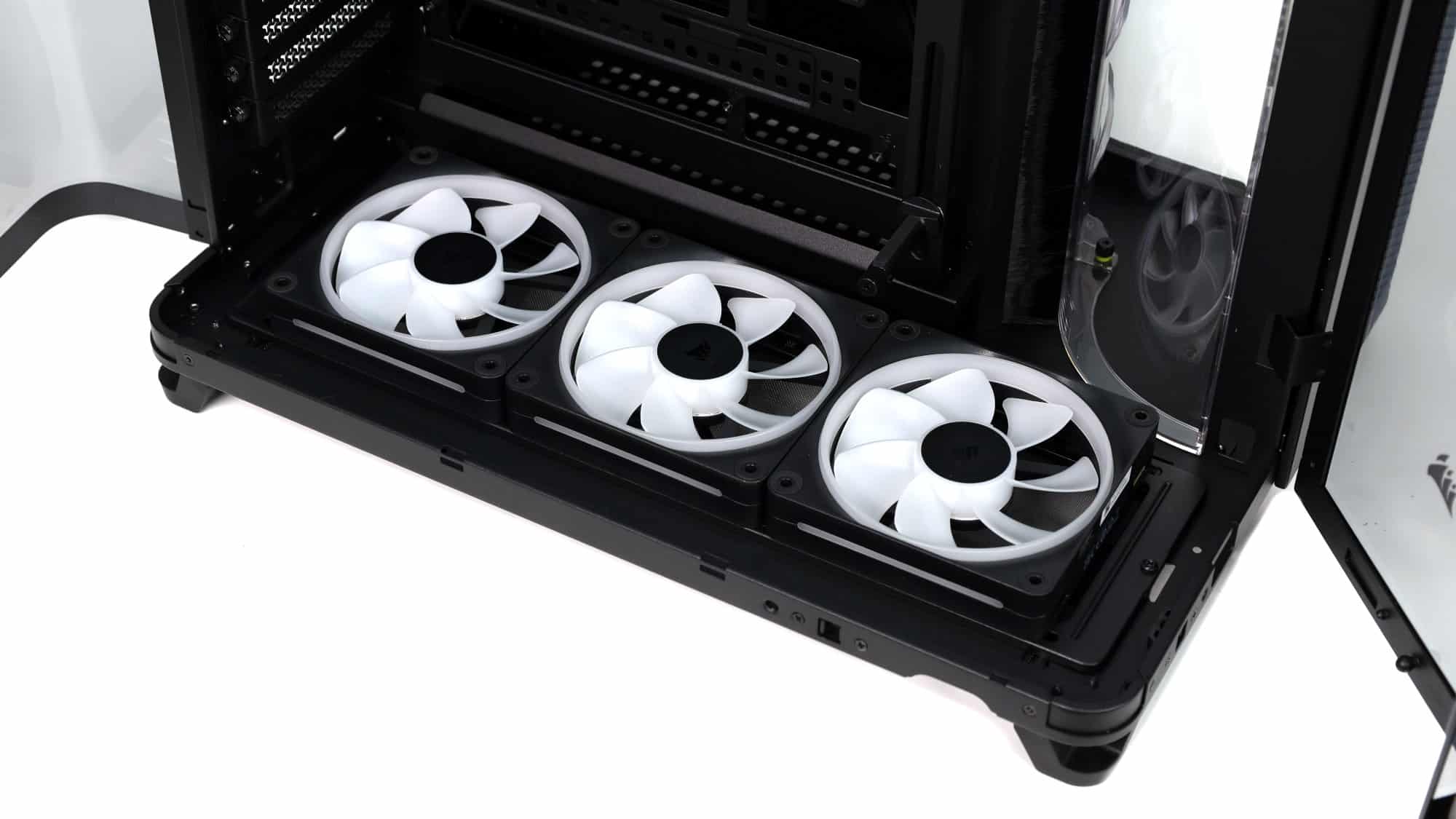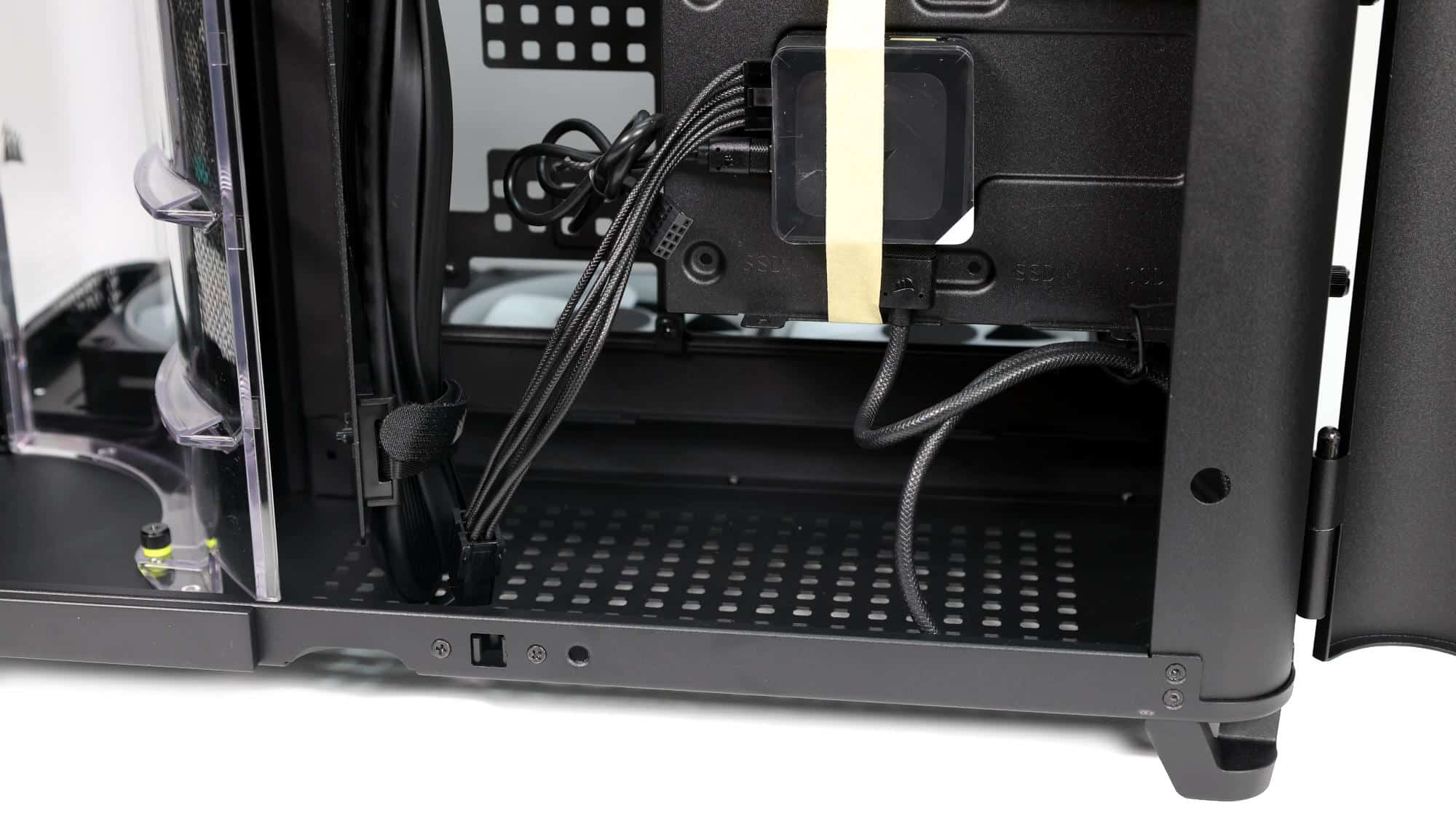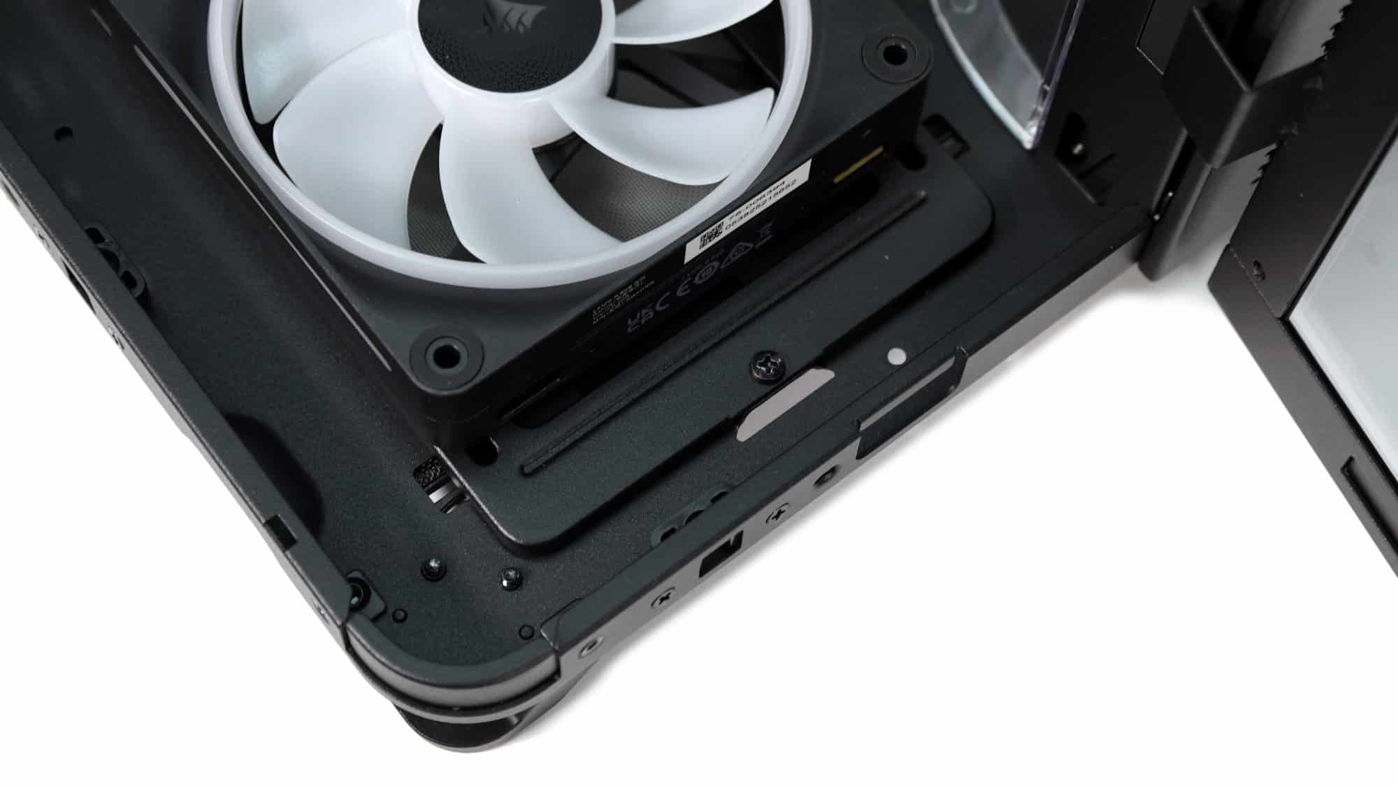 The storage tray supports up to two 2.5-inch drives on the inside and one 3.5-inch drive in place of the iCue hub. While this could have been improved, given the chassis size, the focus clearly lies on supporting modern hardware and advanced cooling. For a case in this price range, better storage flexibility would have been welcome, but this is a specialty chassis.
