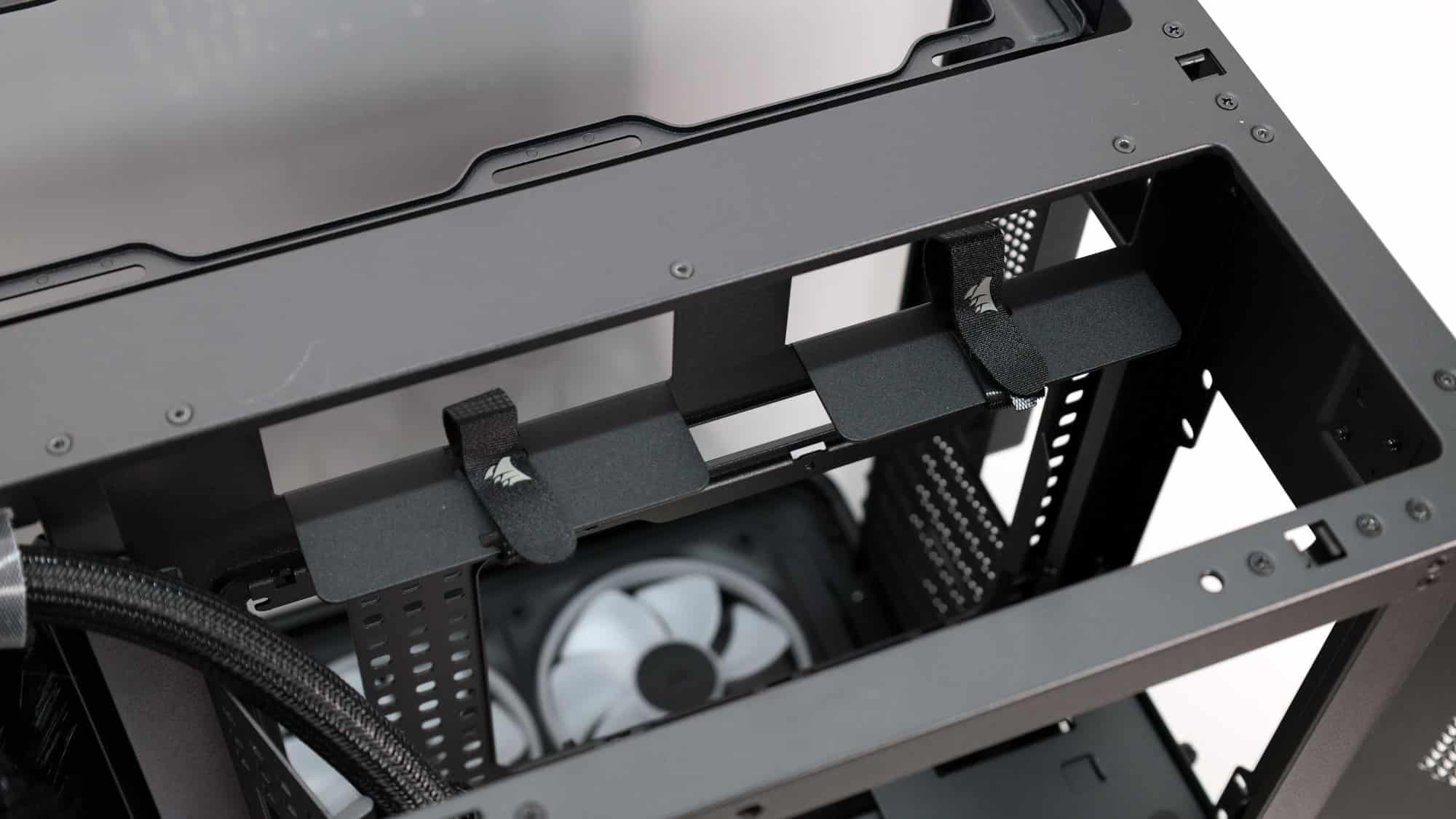 The motherboard tray is fully removable. It’s heavily perforated, like Swiss cheese, but the openings allow for back-connect motherboards, easier cooler installation, and improved aesthetics. They can also be used with the Corsair Velcro-strap brackets, but all three are already preinstalled in the second chamber.