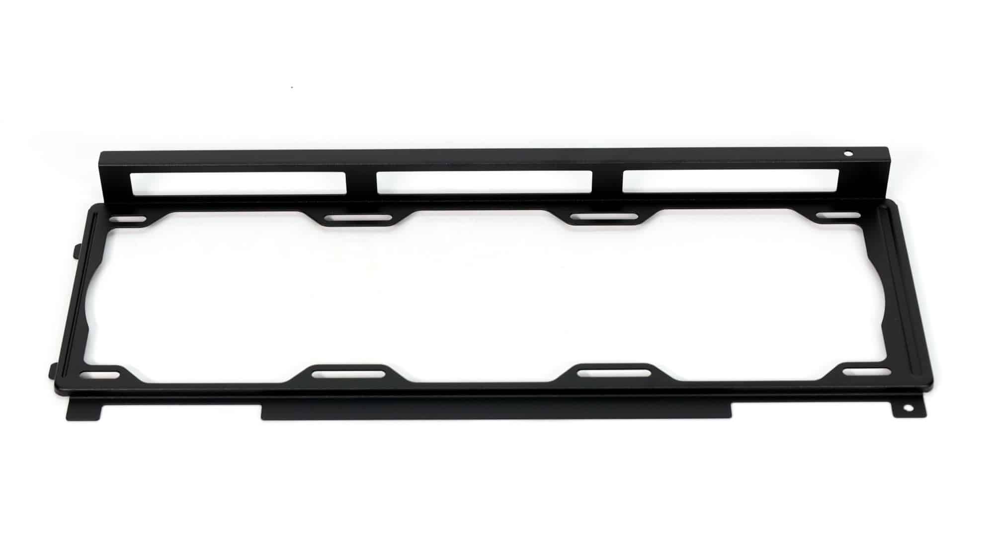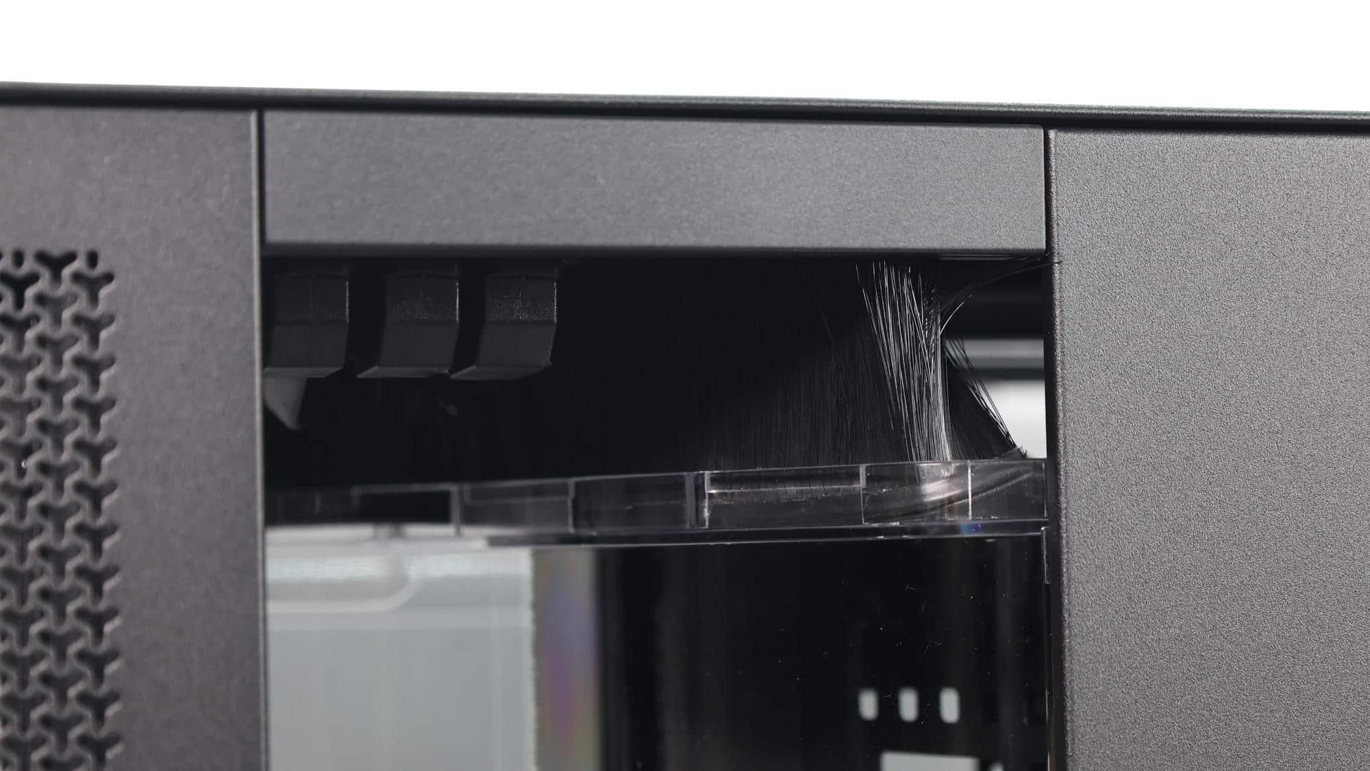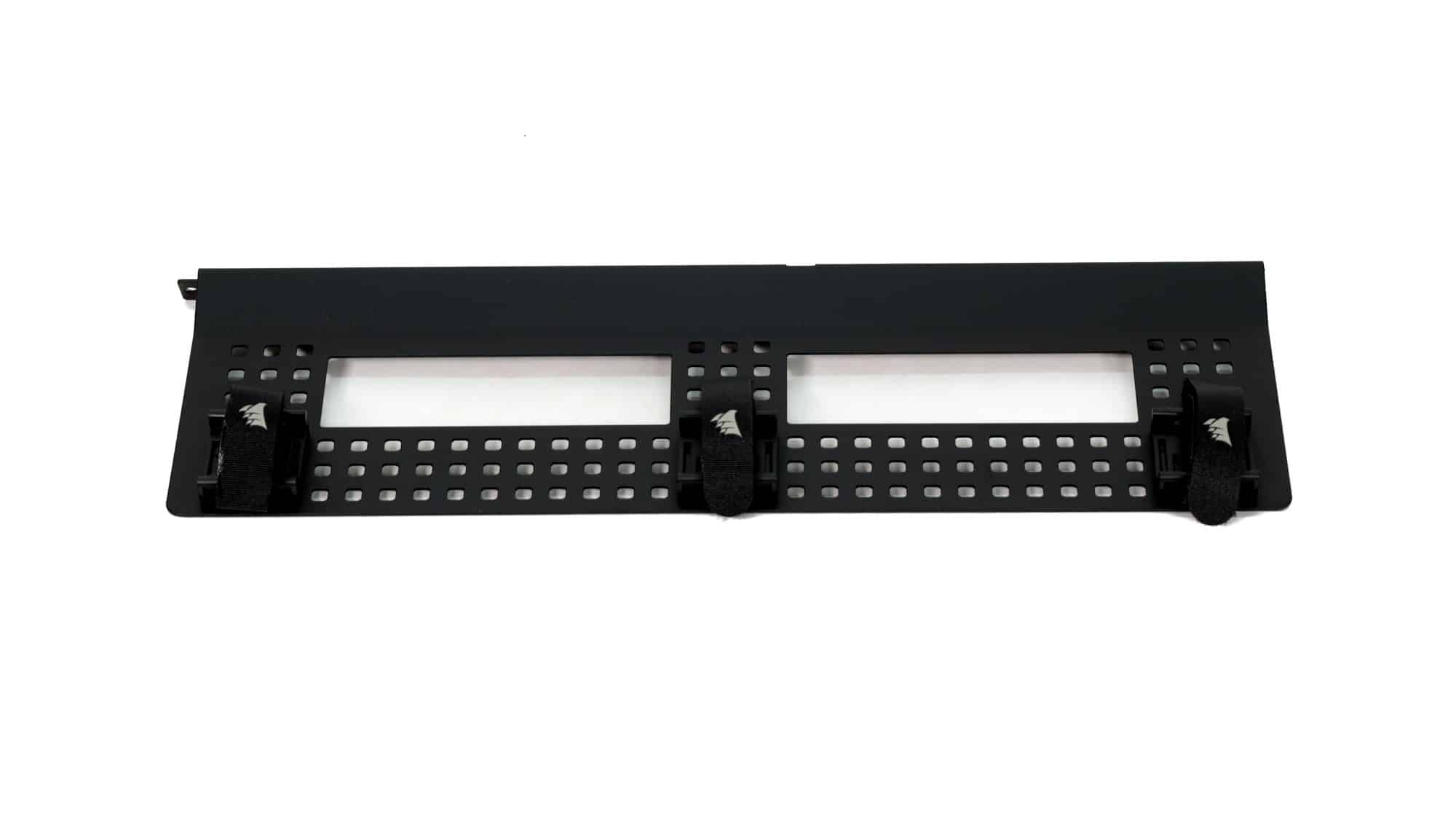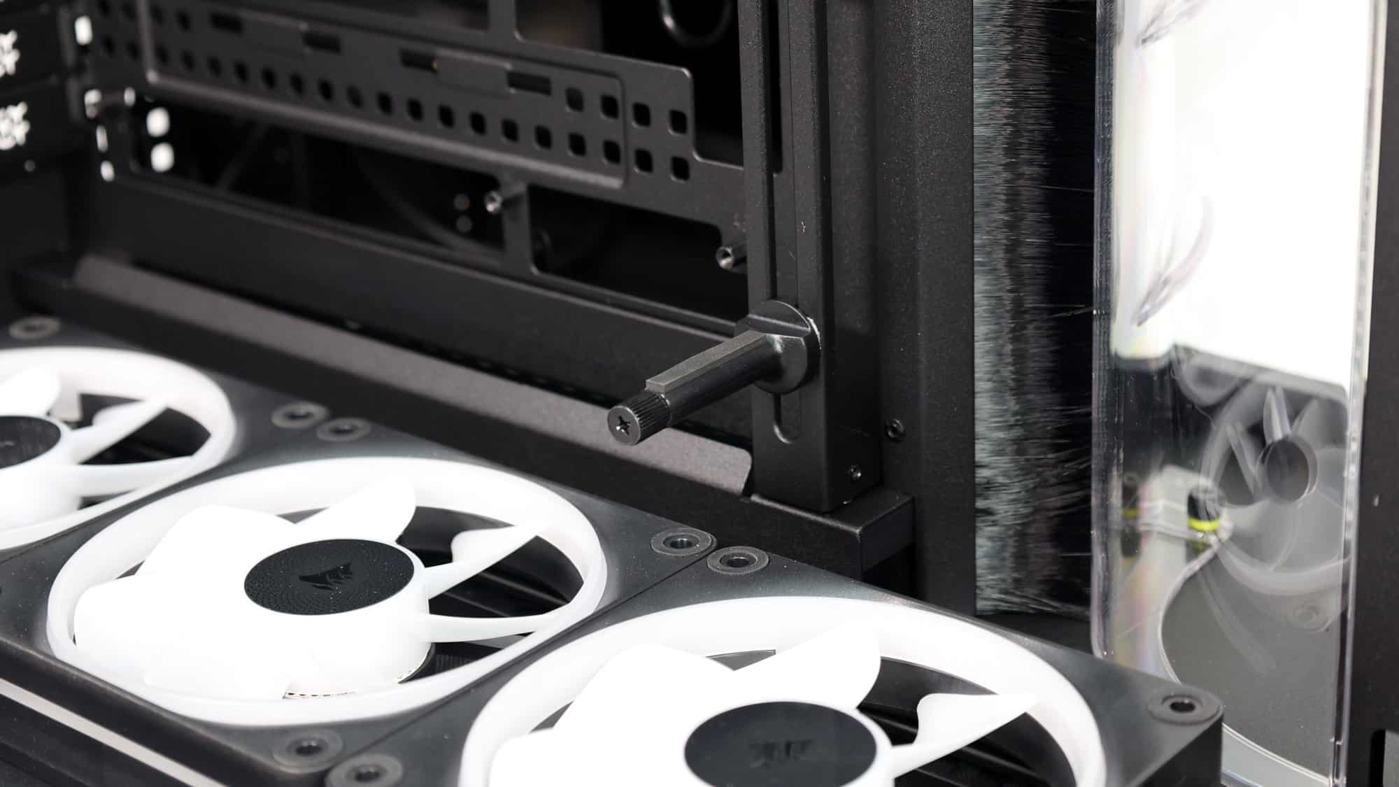 Let’s first take a look at the new chamber. Removing the front cover reveals a removable radiator bracket that supports 120 mm-wide coolers up to 360 mm tall. To separate this chamber and optimize airflow, Corsair includes a plastic air diffuser with brushes at the top and inside, separating air between sections. It’s secured with a single thumbscrew at the bottom and three integrated locking pegs.