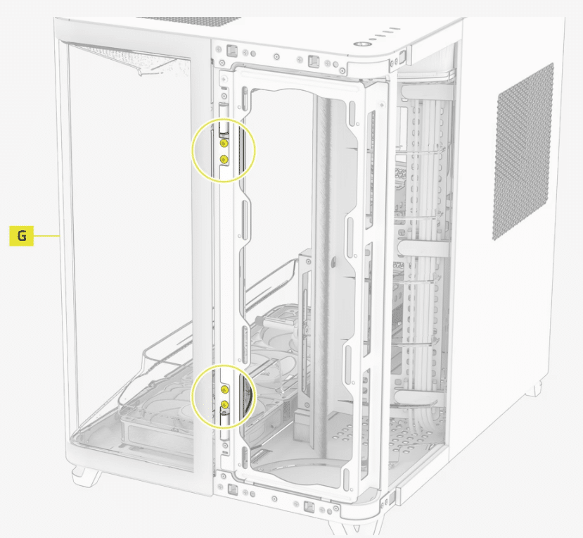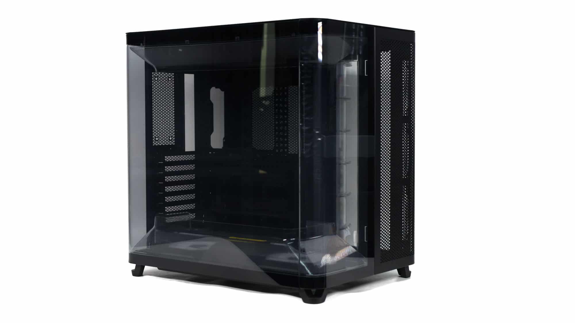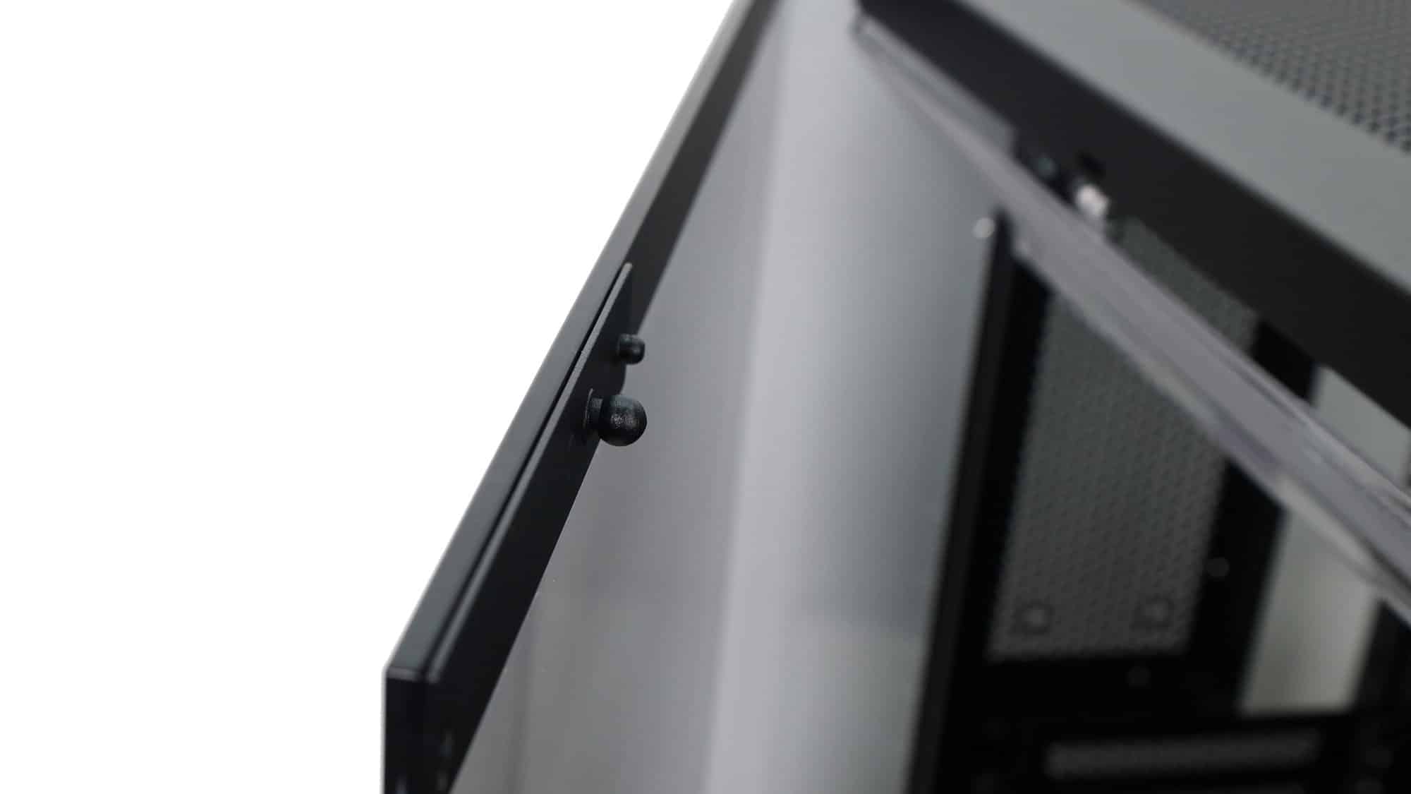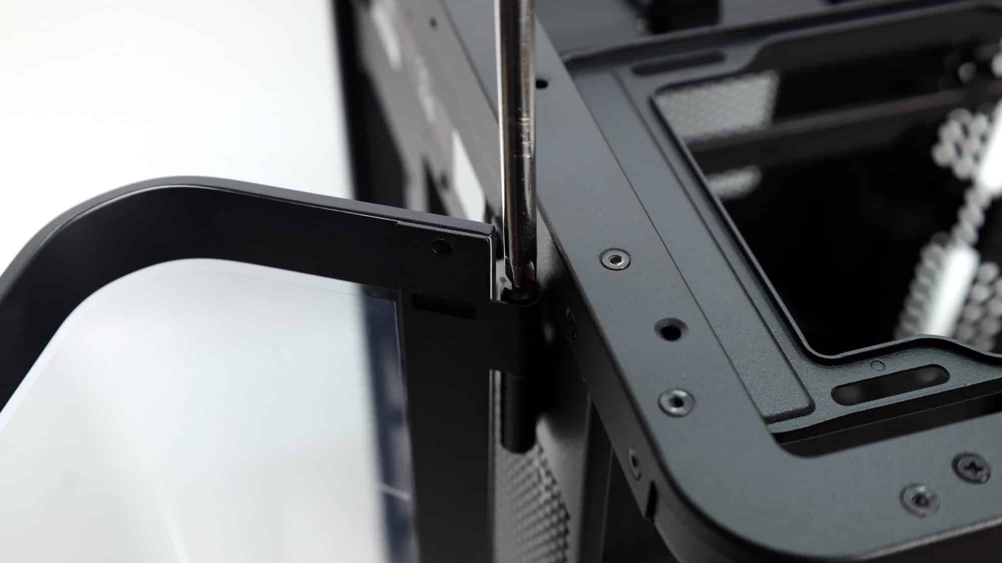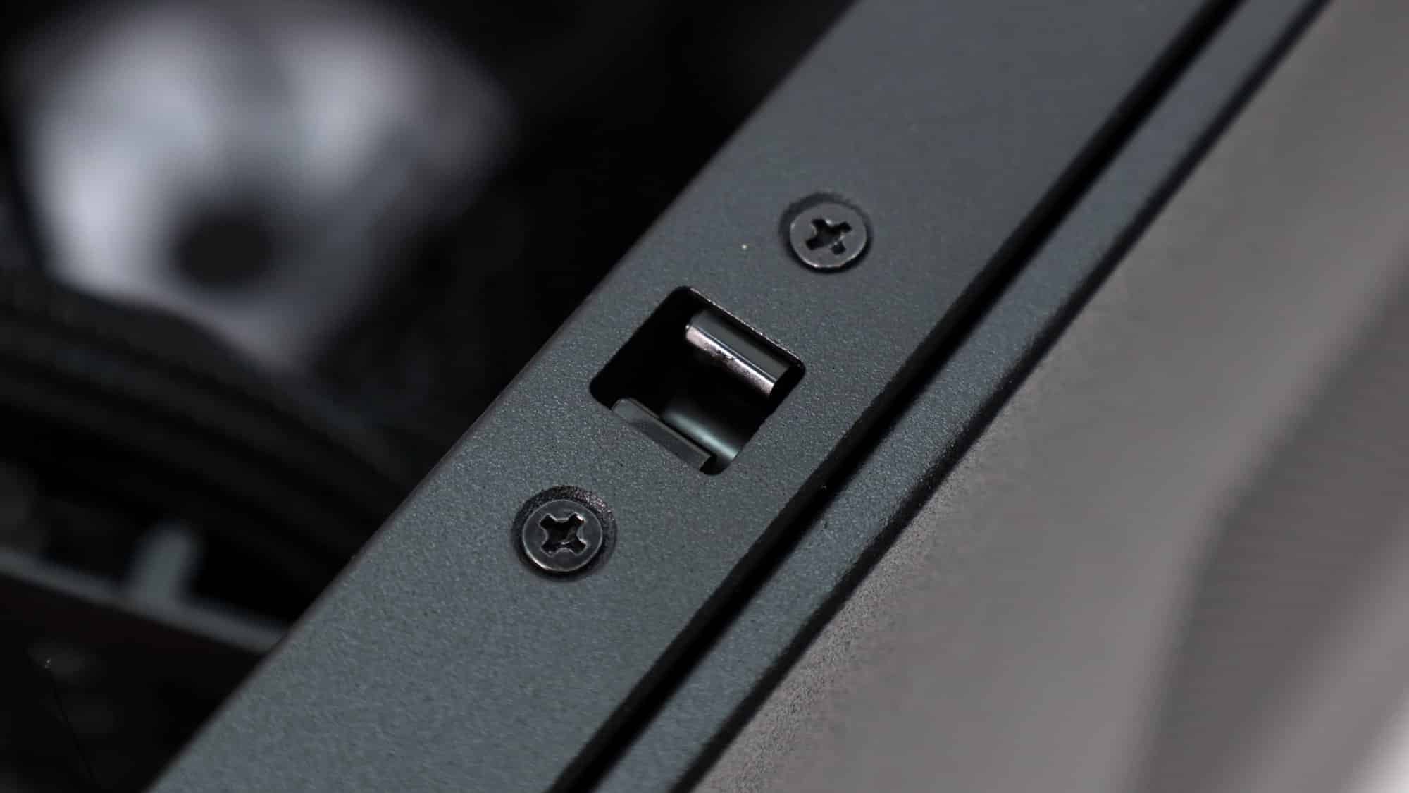Starting from the side, we have an all-glass side panel, with the glass extending from the rear of the chassis and curving over the side to meet the front glass panel. This side panel is easy to remove; unscrew the top hinge screw, and it comes off. Replacing it is just as simple: align the taller bottom hinge, then the top one, and reinsert the screw. It’s a well-thought-out and well-executed feature, as the glass is both heavy and fragile.