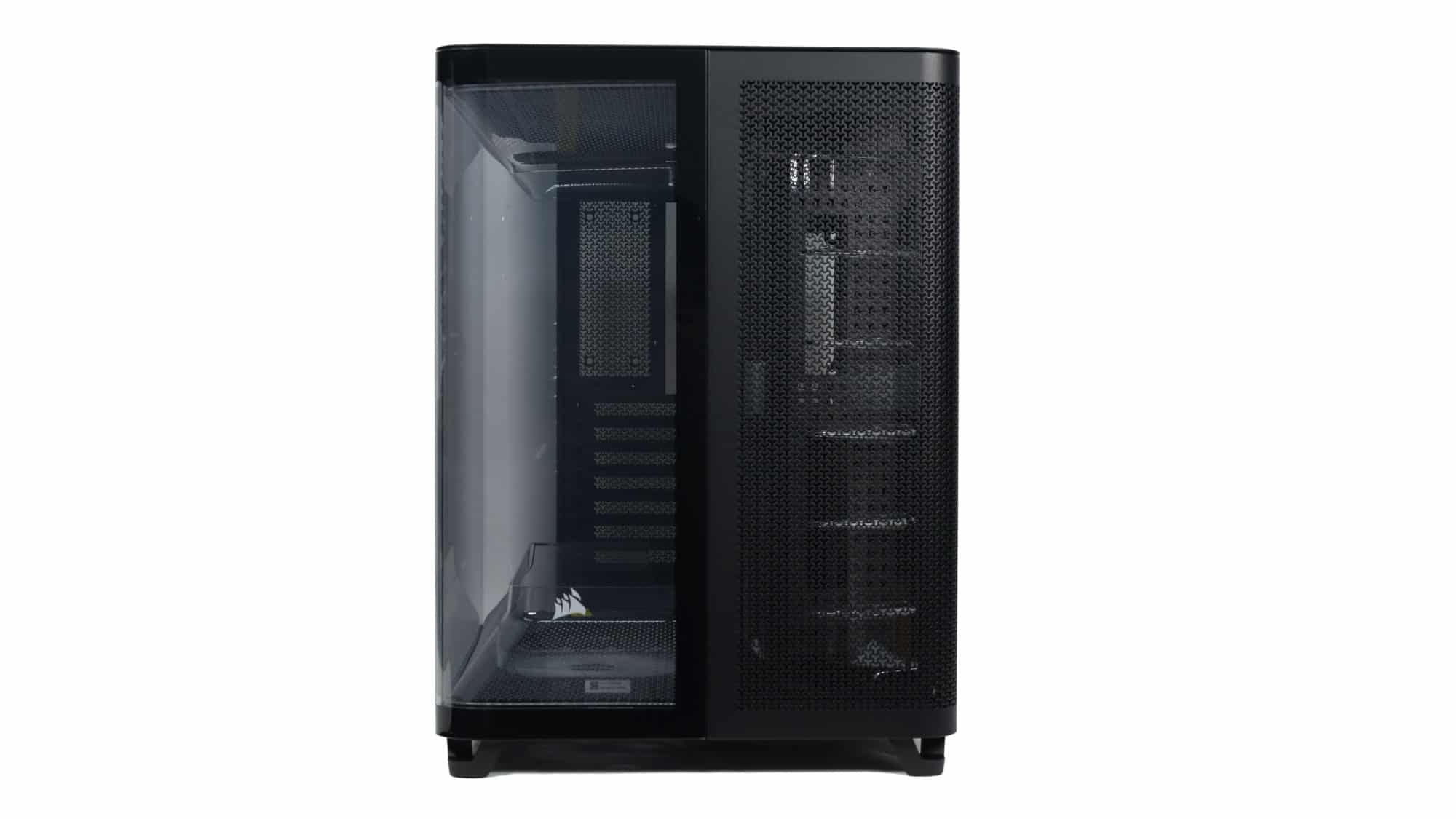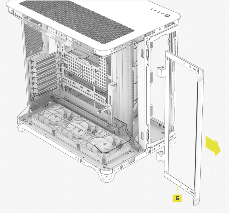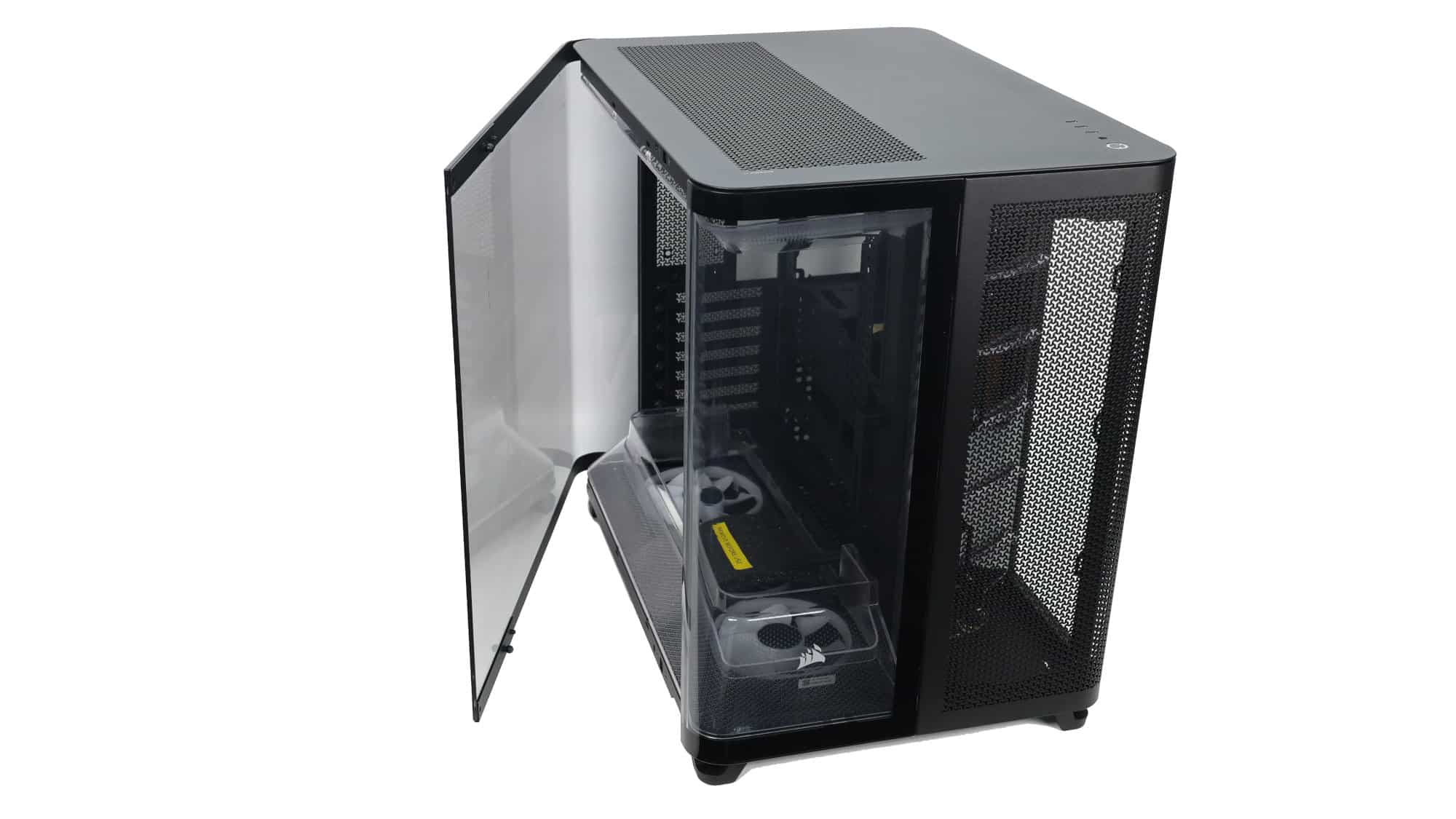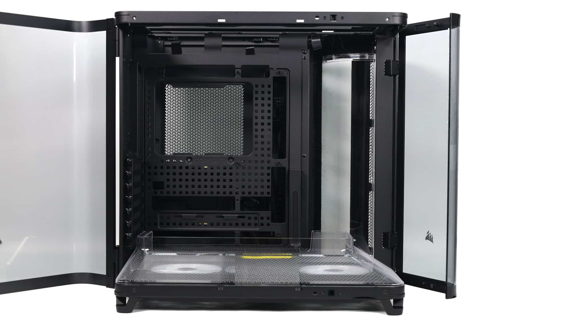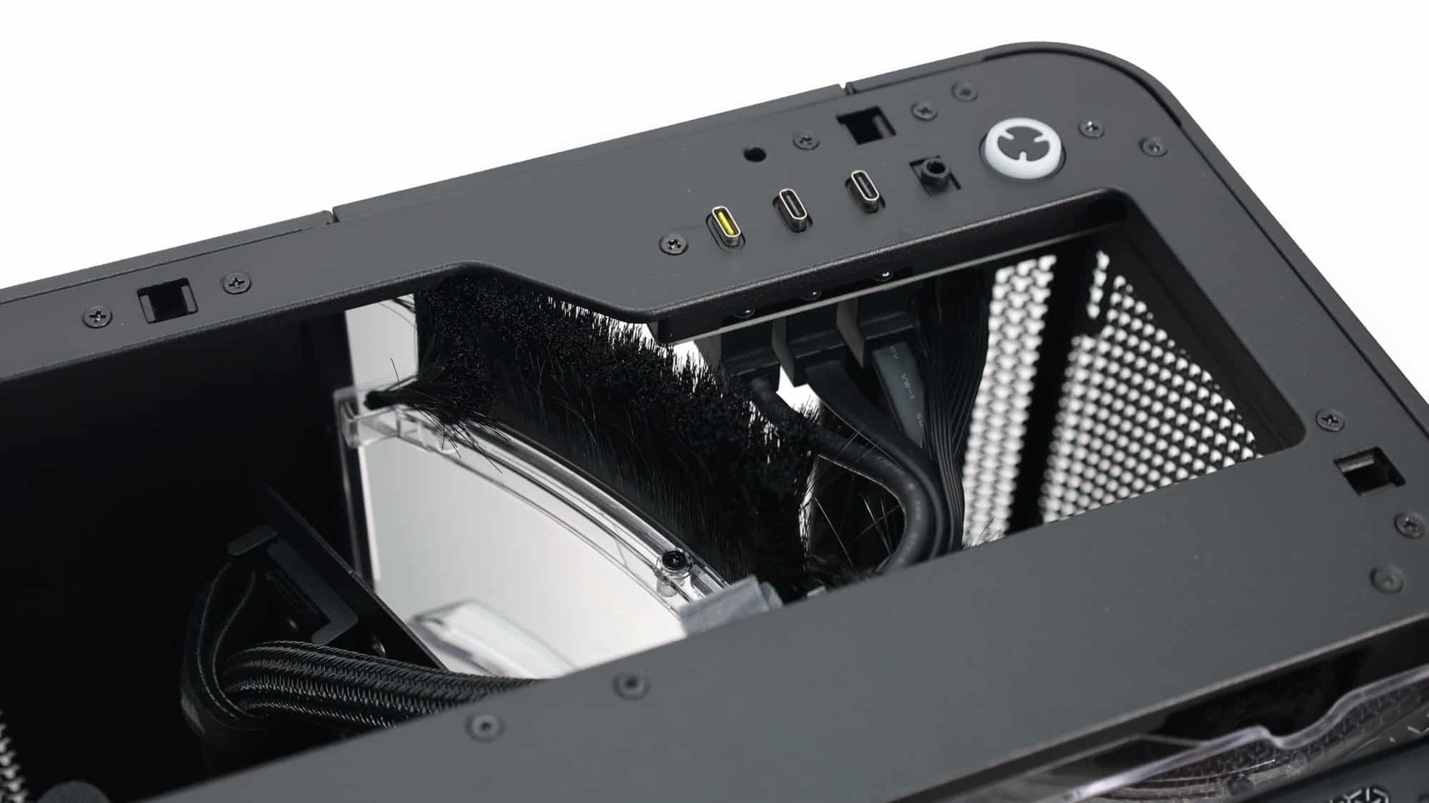 The top houses the I/O panel and fan openings. Corsair’s choice to include only USB Type-C ports is bold. “It takes courage,” as Apple would say. The yellow port is a USB 3.2 Gen 2×2, rated for 20 Gbps, while the other two are USB 3.2 Gen 1 (or simply USB 3.0) at 5 Gbps. You’ll also find a combo mic/headphone jack and the power button. Interestingly, the entire I/O module is fully removable. The top panel also offers excellent access to both the primary and secondary chambers.