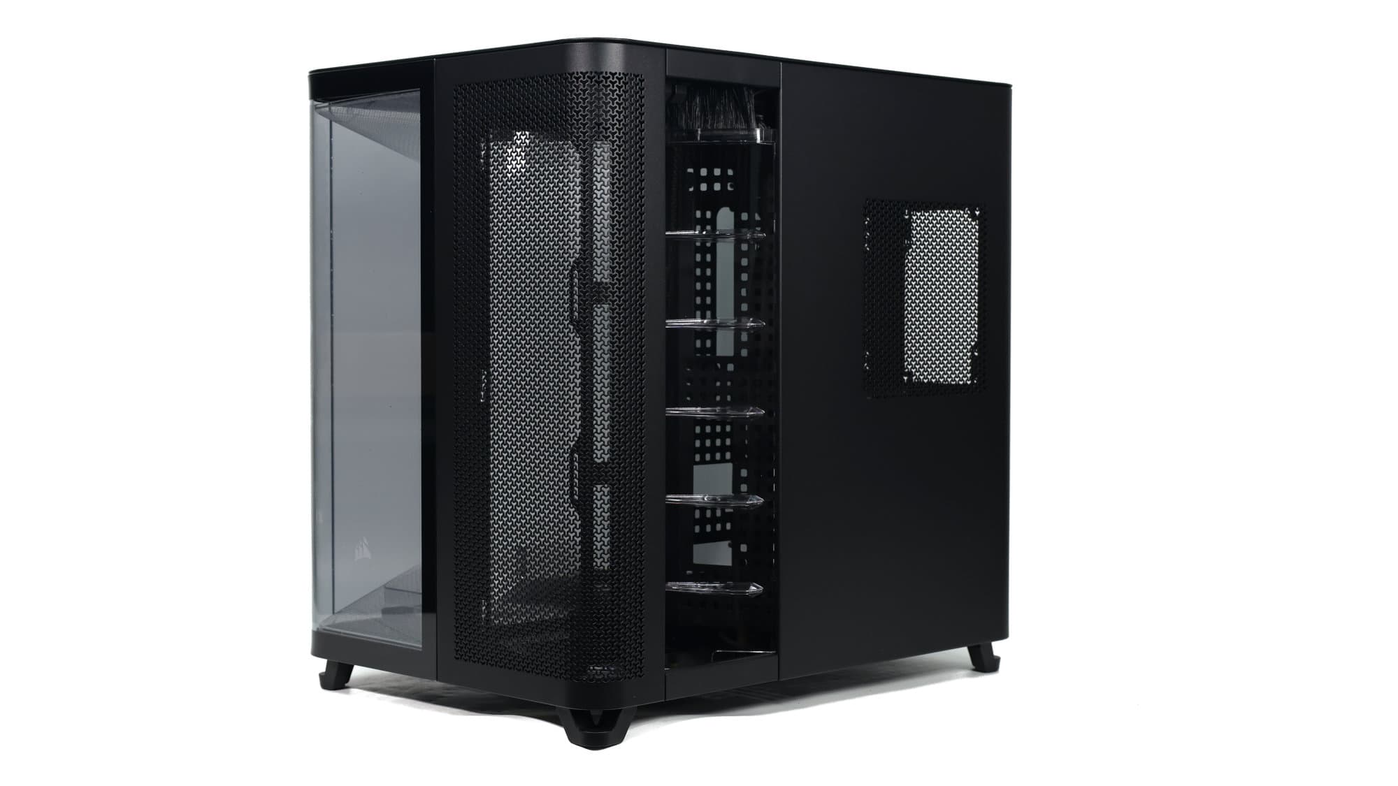 The rear doesn’t support any fans out of the box, though Corsair includes mounting brackets for those who want one for VRM cooling. Oddly, the expansion slots are not bridgeless. While the chassis may not target vertical GPU setups, bridgeless slots would still help with bulky cables or poorly placed GPU ports.